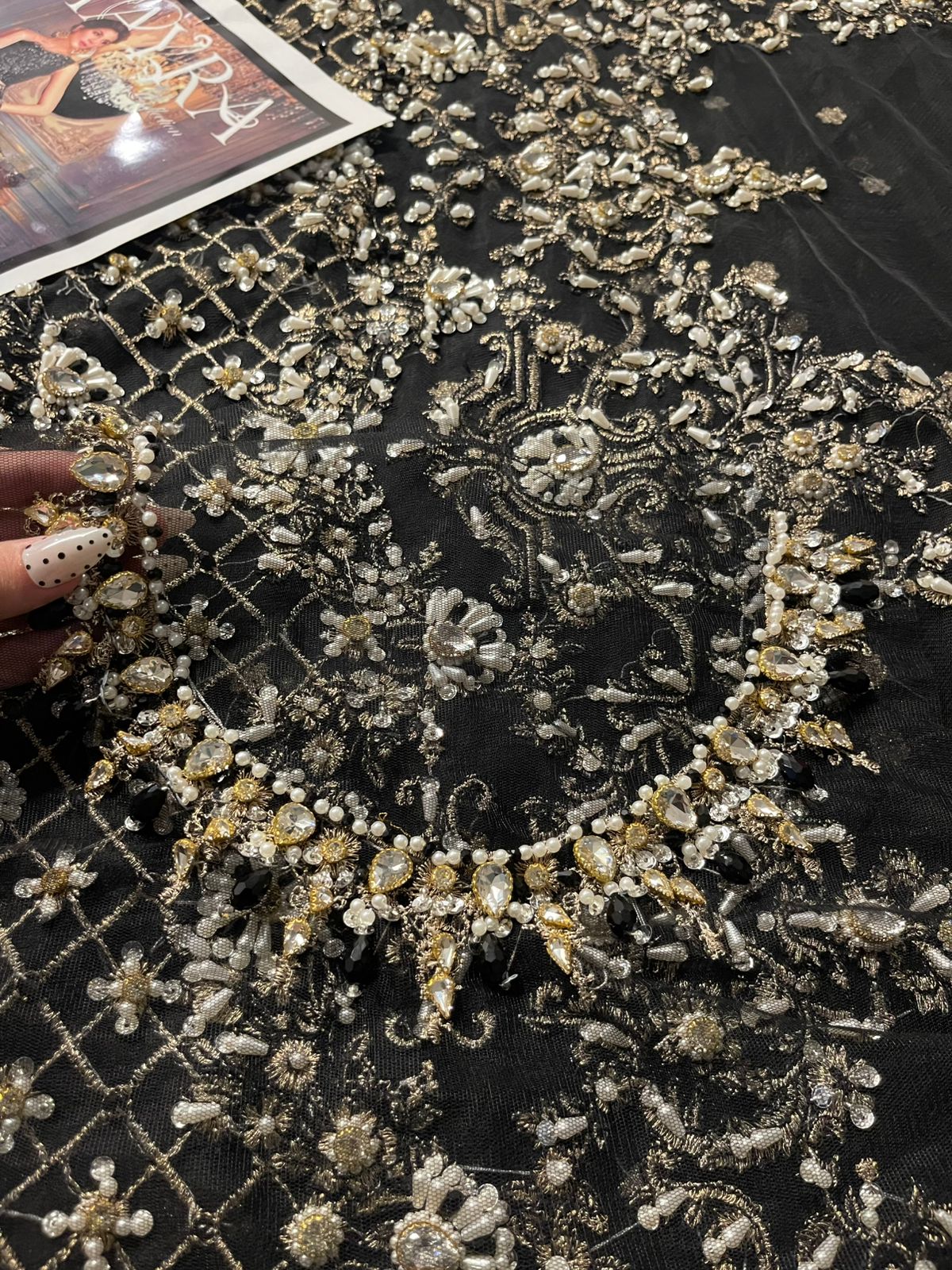 The saree features exquisite handwork along the pallu, borders, and body, showcasing delicate thread embroidery and sparkling details that reflect designer-level craftsmanship. Its flowing net base ensures a flattering drape for all body types, combining comfort with couture elegance. The luxurious black hue adds versatility, allowing you to accessorize with statement jewelry, metallic heels, or a contrasting embroidered blouse for a glamorous finish.