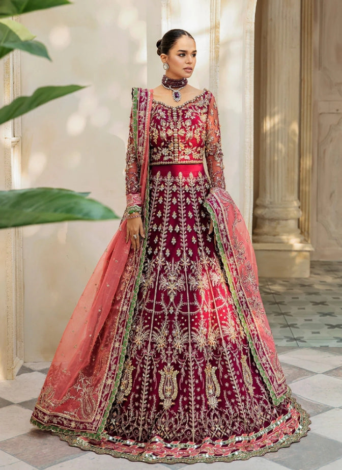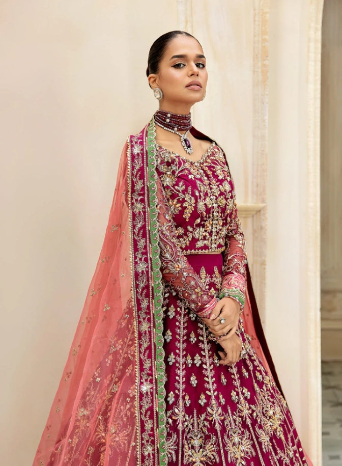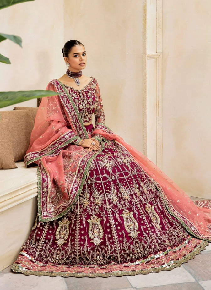 Ashmiza (item code GL-WS-23V1-36) from our wedding formal collection. Mesmerizing magenta lehenga choli meets the perfect fusion of green and peach in the dupatta. An intricately embroidered neckline, a detailed back, and sleeves adorned with adda-work embellishments create a masterpiece of elegance.