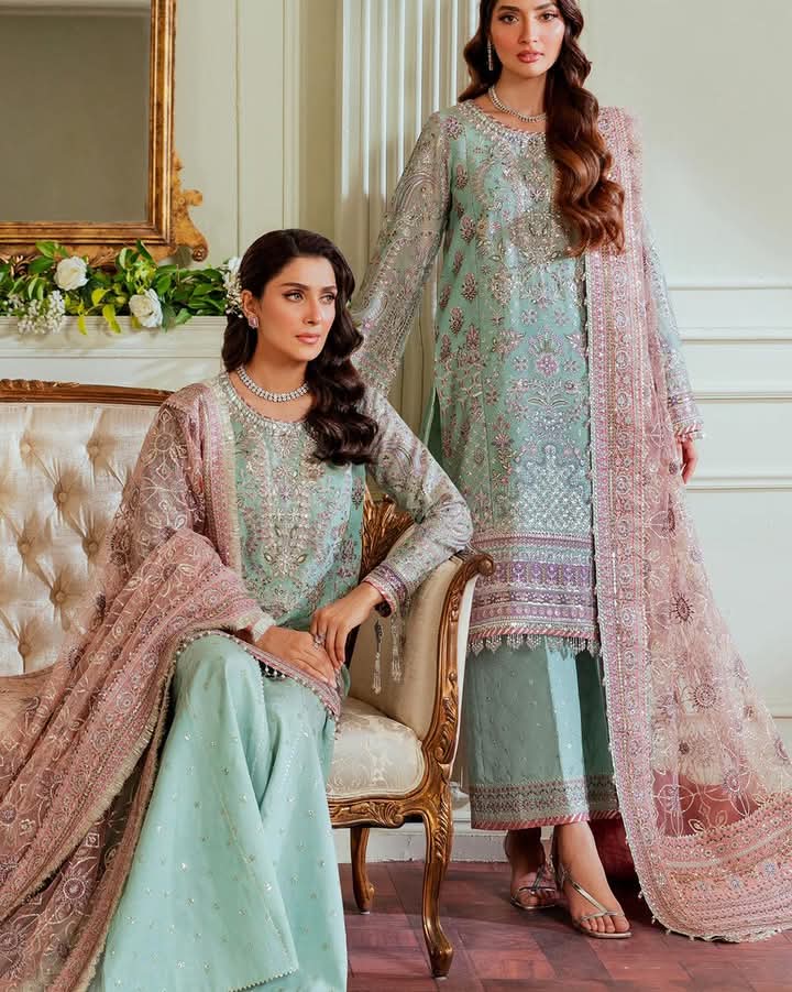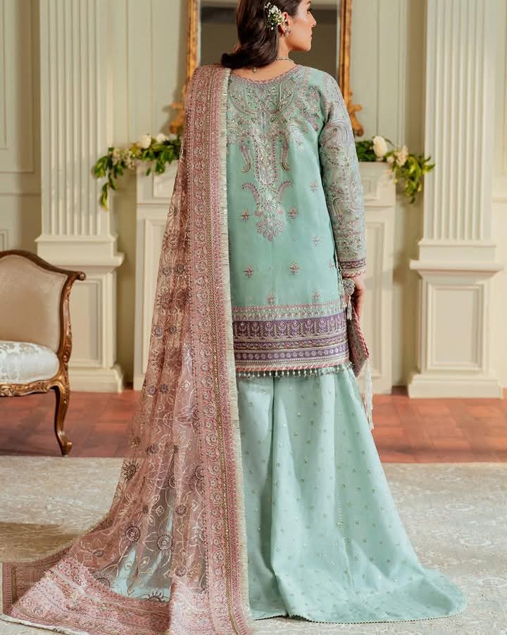Exquisitely hand-embellished with Swarovski crystals, pearls, and beads around the neckline. The entire zari net front is adorned with silver sequins and tilla embroidery, interwoven with pink and purple threads to form intricate floral and vine motifs. The back of the shirt features thread embroidered with a subtle silver tillaneckline, complemented by floral motifs.