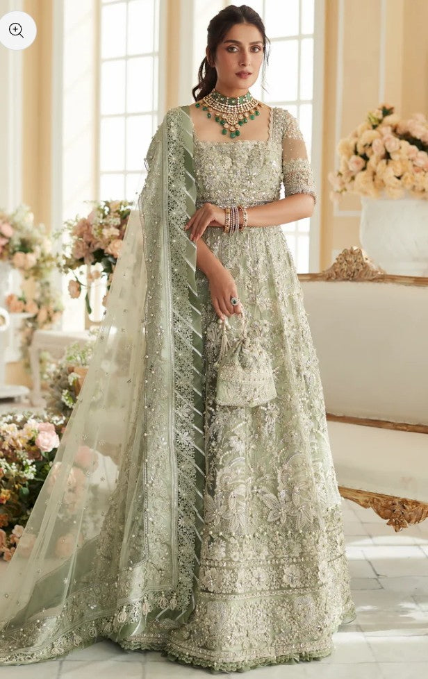 The enchanting ‘Arya’ rendered in ethereal pistachio is a vision of beauty, intricately adorned with a dazzling blend of shimmering silver sequins, pearls, and sparkling stones. Twelve stunning embroidered panels come together to form a magnificent heritage peshwas with a fully embellished bodice and a bejewelled belt. The dupatta is a frosted masterpiece, sprinkled with delicate crystals, pearls, and tinsel blooms along its borders acting as an ode to the grandeur of Eastern royal regalia. This couture-like ensemble is a dream come true for collectors, exuding classic elegance and timeless charm.