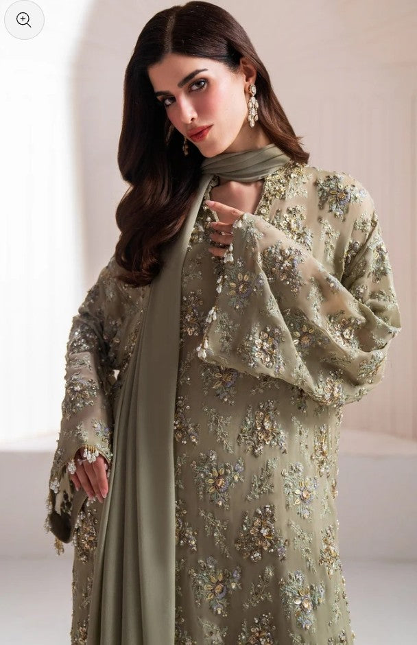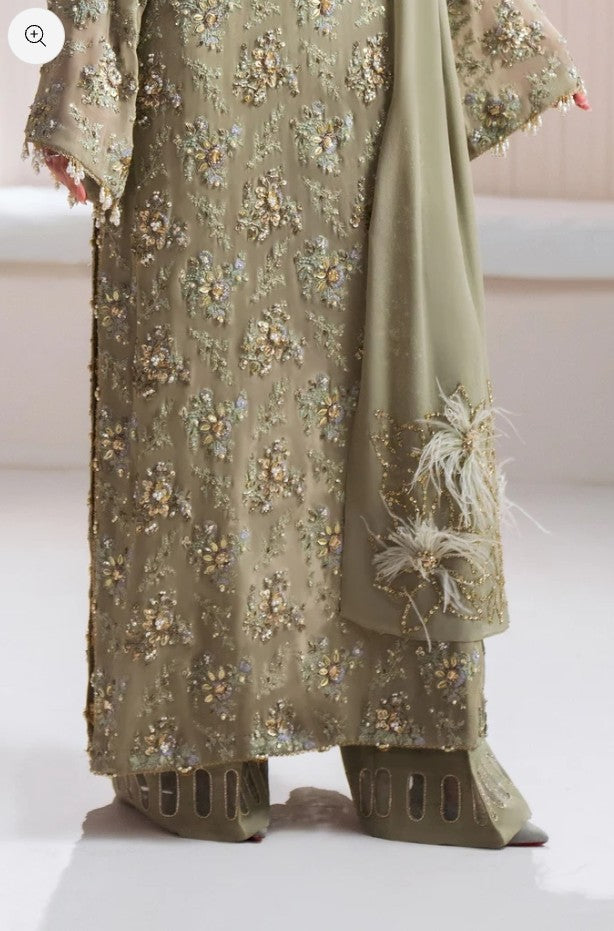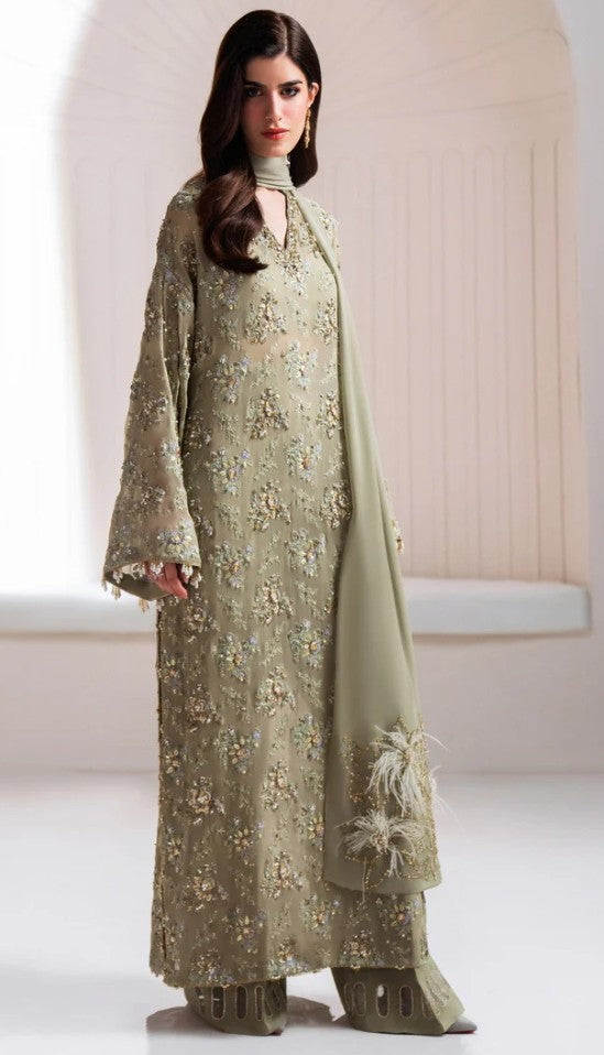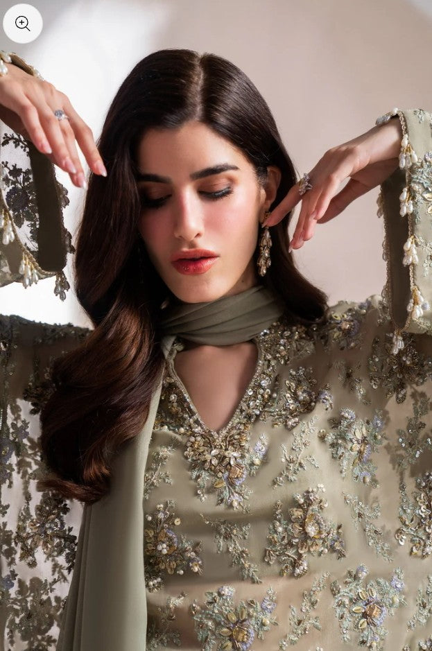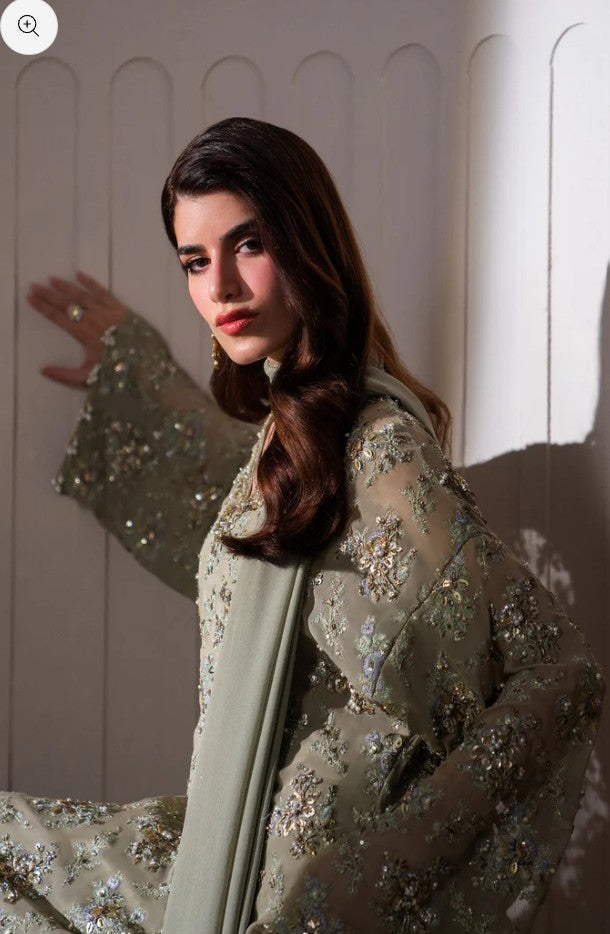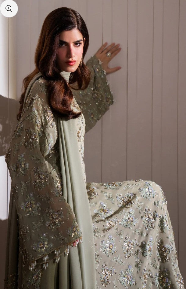 Enter a realm of sublime luxury with 'Clarte', an Iseo Sage Green creation that masterfully redefines regal elegance. This breathtaking drop-shoulder, long-shirt silhouette is a testament to refined craftsmanship, adorned with opulent gold-chrome accents, where each floral motif is brought to life with dazzling sequins, delicate gotta, and shimmering crystals. A chiffon dupatta, lavishly detailed with plush fur and hand-embellished intricacies, drapes effortlessly, while raw silk palazzos, embellished with a cascade of delicate crystals, radiate an aura of pure grandeur. Perfect for the upcoming wedding season, 'Clarté' is not just an ensemble, but a statement of enduring elegance and exceptional luxury.