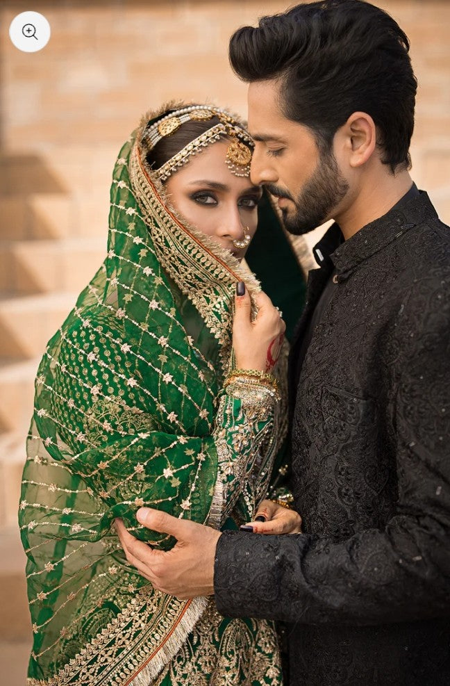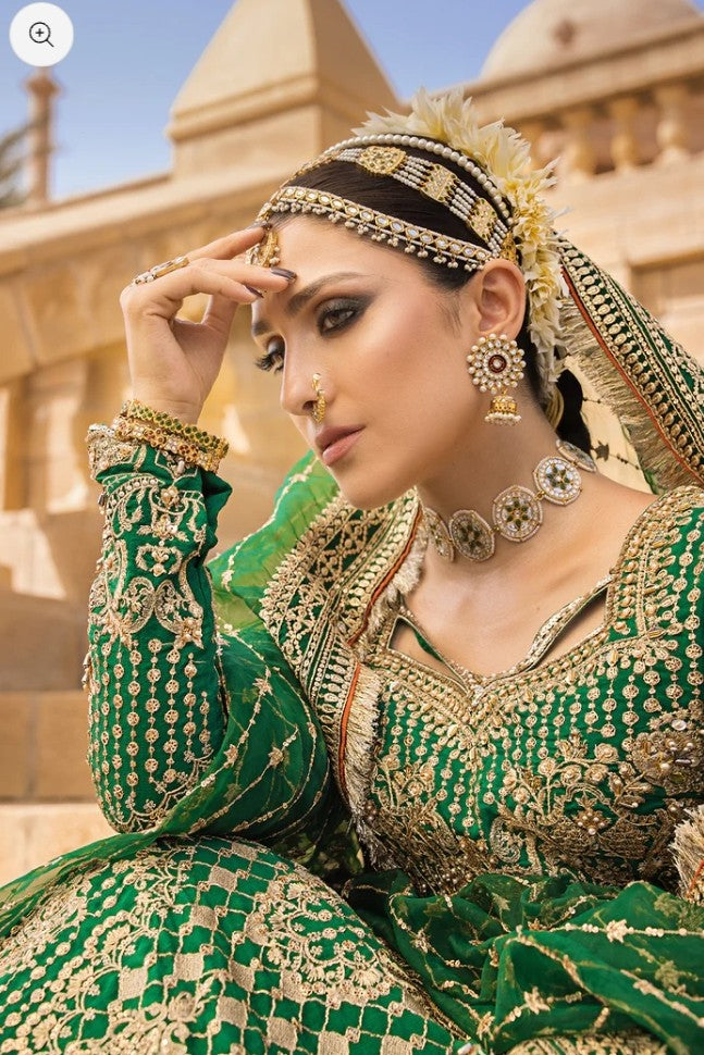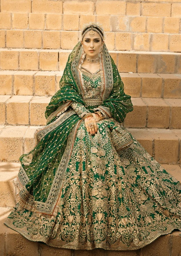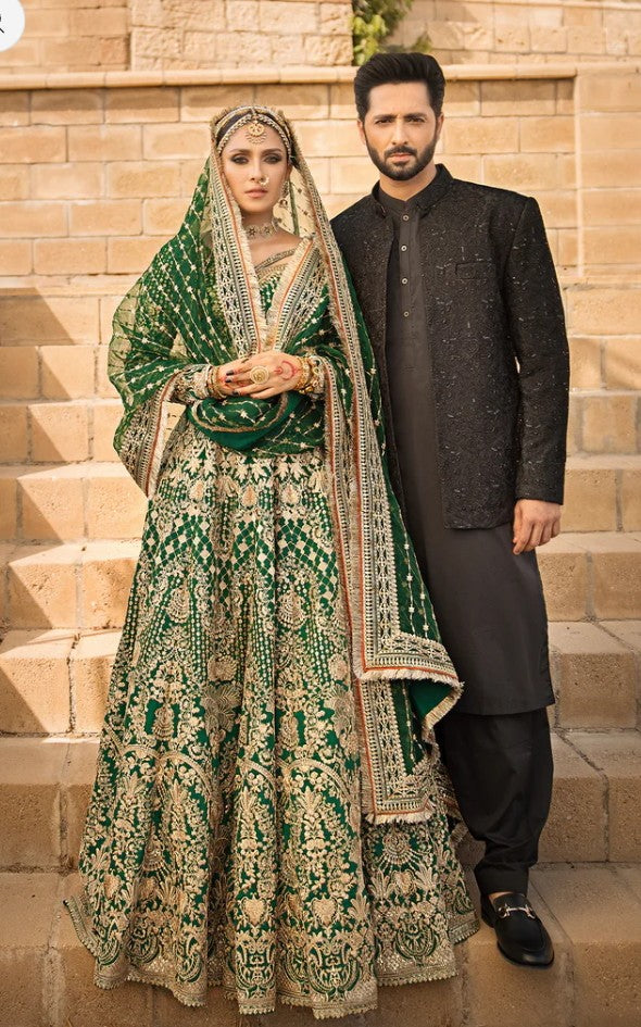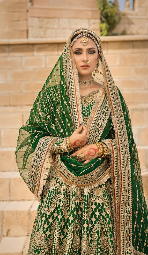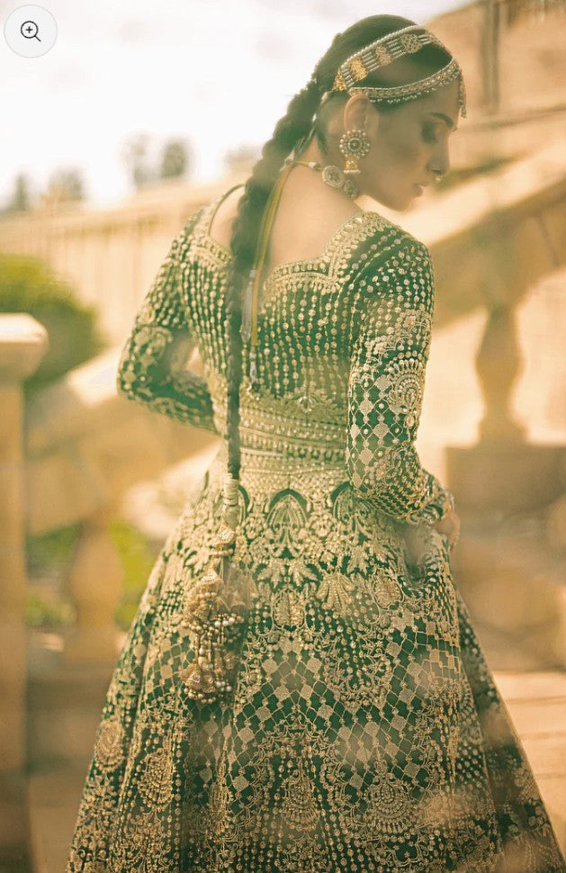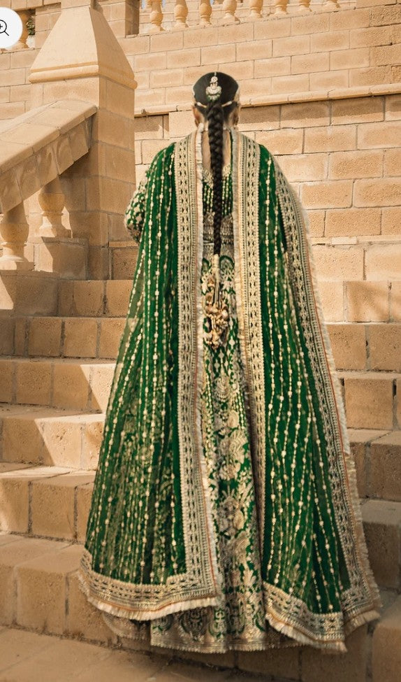 A vision draped in timeless elegance, where deep hues meet delicate craftsmanship. This ensemble whispers tales of old-world charm, woven with intricate detail and regal flair. From the sweeping silhouette to the glint of gold that catches the light just so, every element speaks of quiet power and ethereal beauty — made for the one who carries heritage in her heart and grace in her stride.