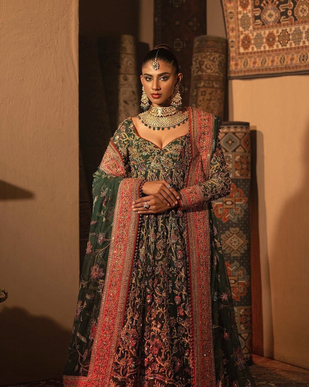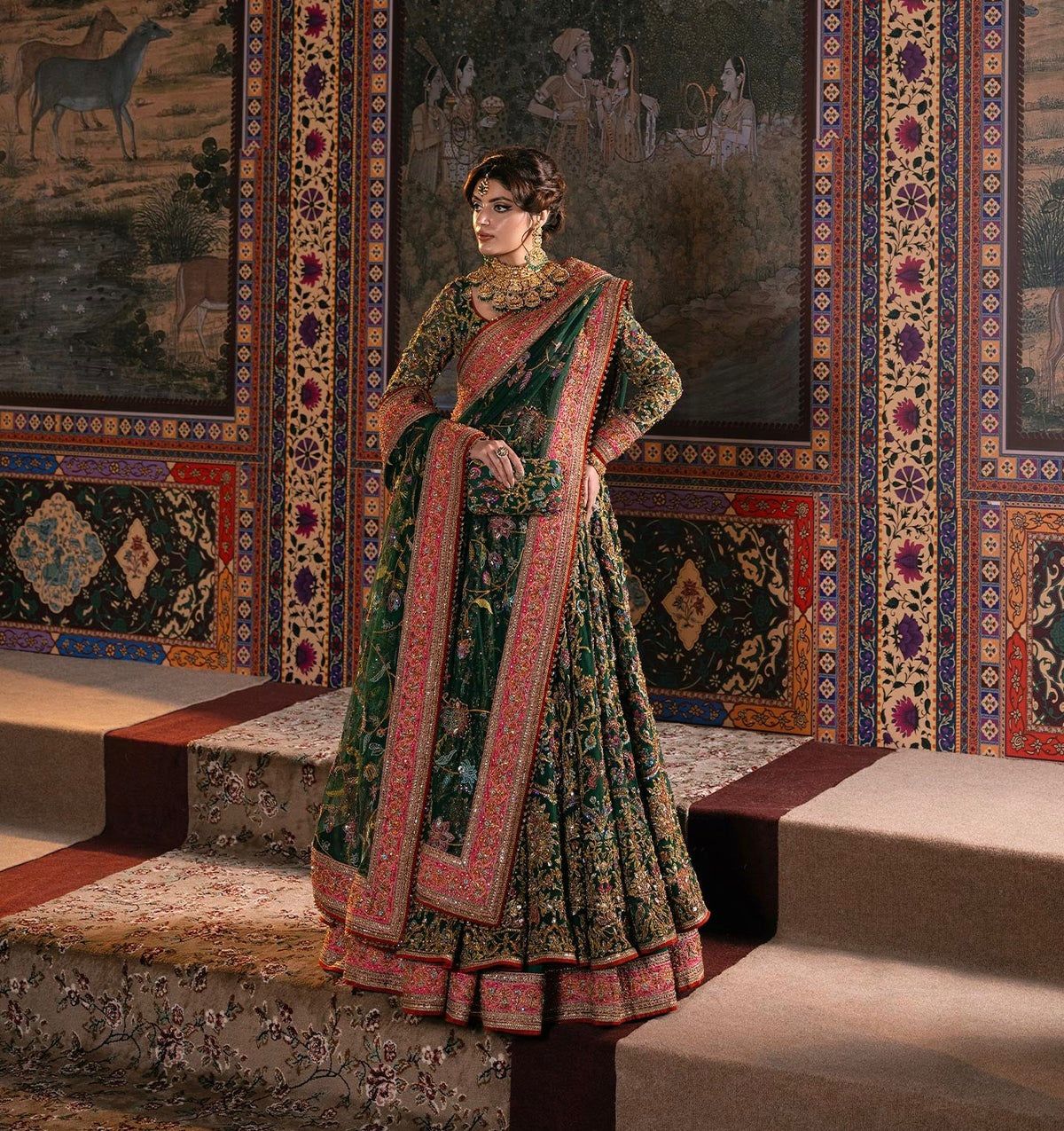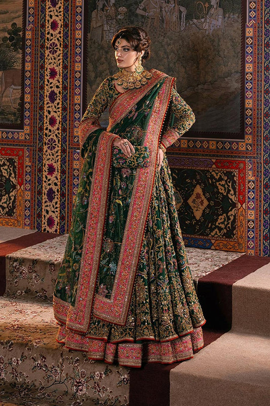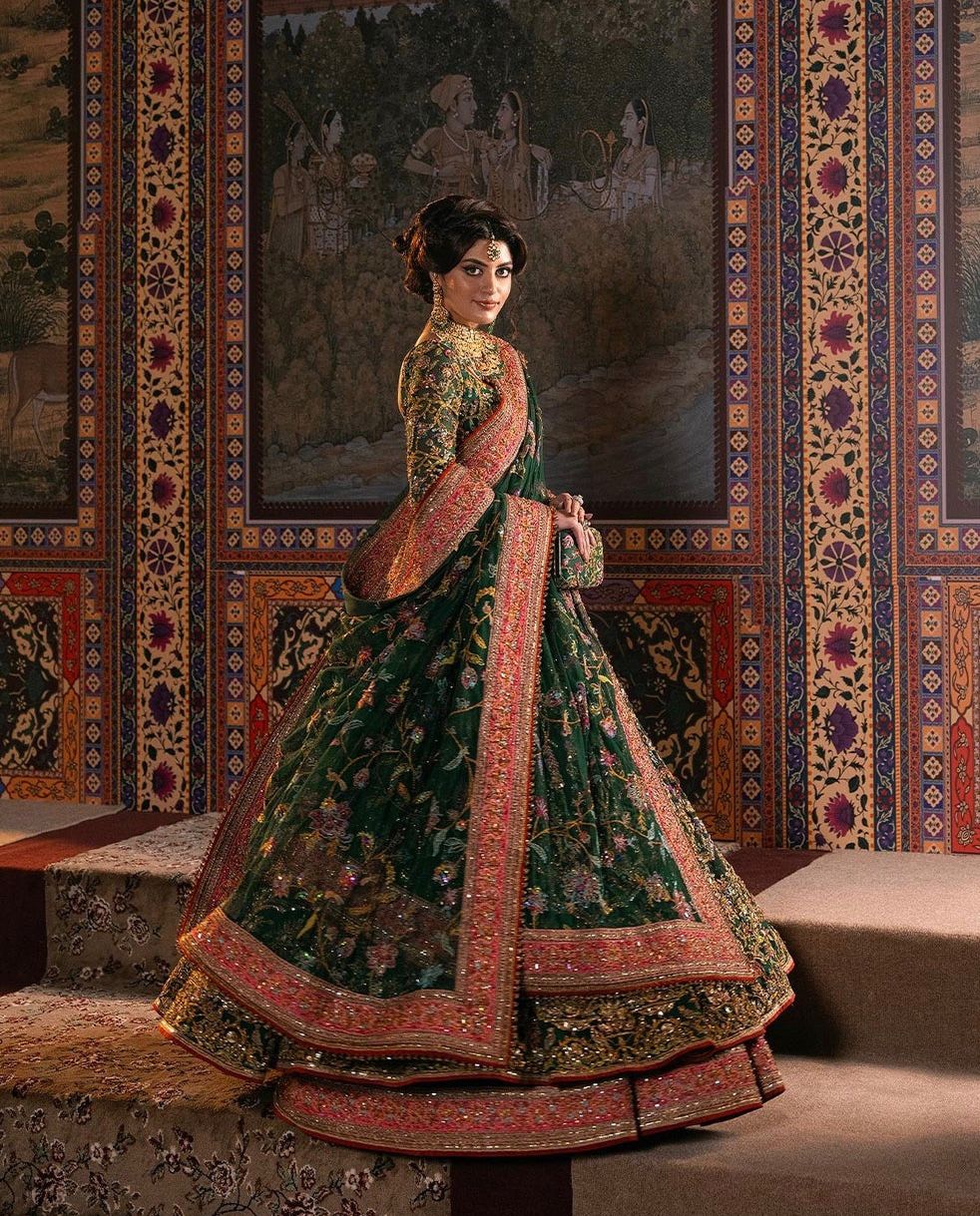 Envision yourself a captivating bride in this enchanting bottle green ensemble. The net pishwas boasts a base adorned with beautiful resham embroidery in a spectrum of colors, further accentuated by shimmering sequences. This captivating foundation reaches new heights with intricate zardozi work, adding a touch of regal elegance. The outfit flows seamlessly into a luxurious silk lehenga, finished with exquisite borders for a touch of sophistication. To complete the look, a delicate net dupatta reflects the pishwas embroidery, creating a cohesive and unforgettable statement for your special day.