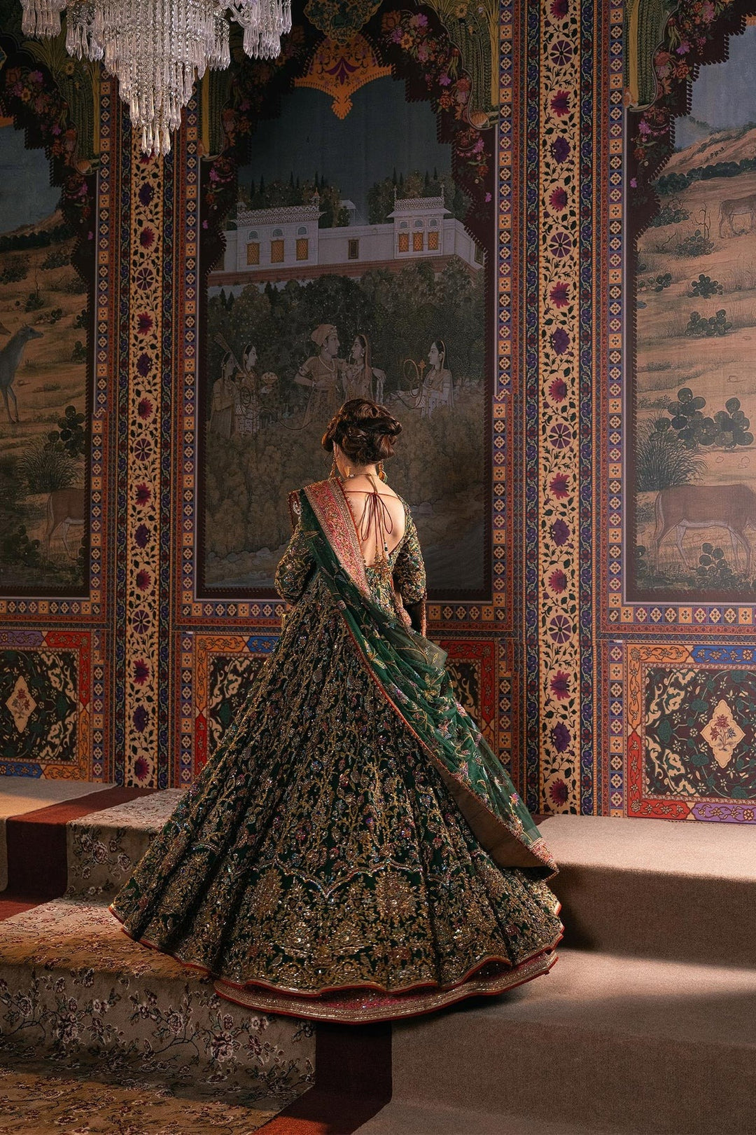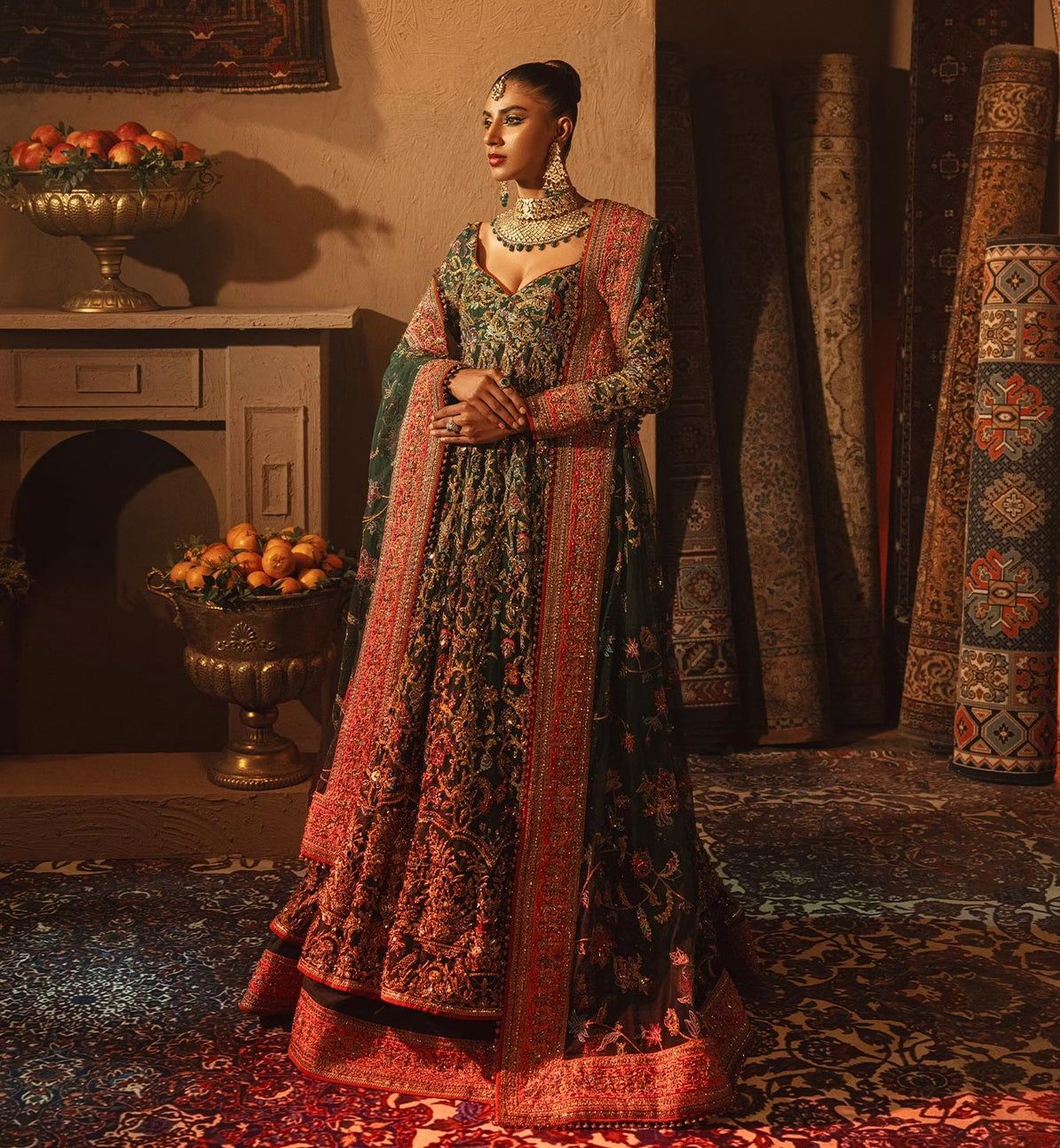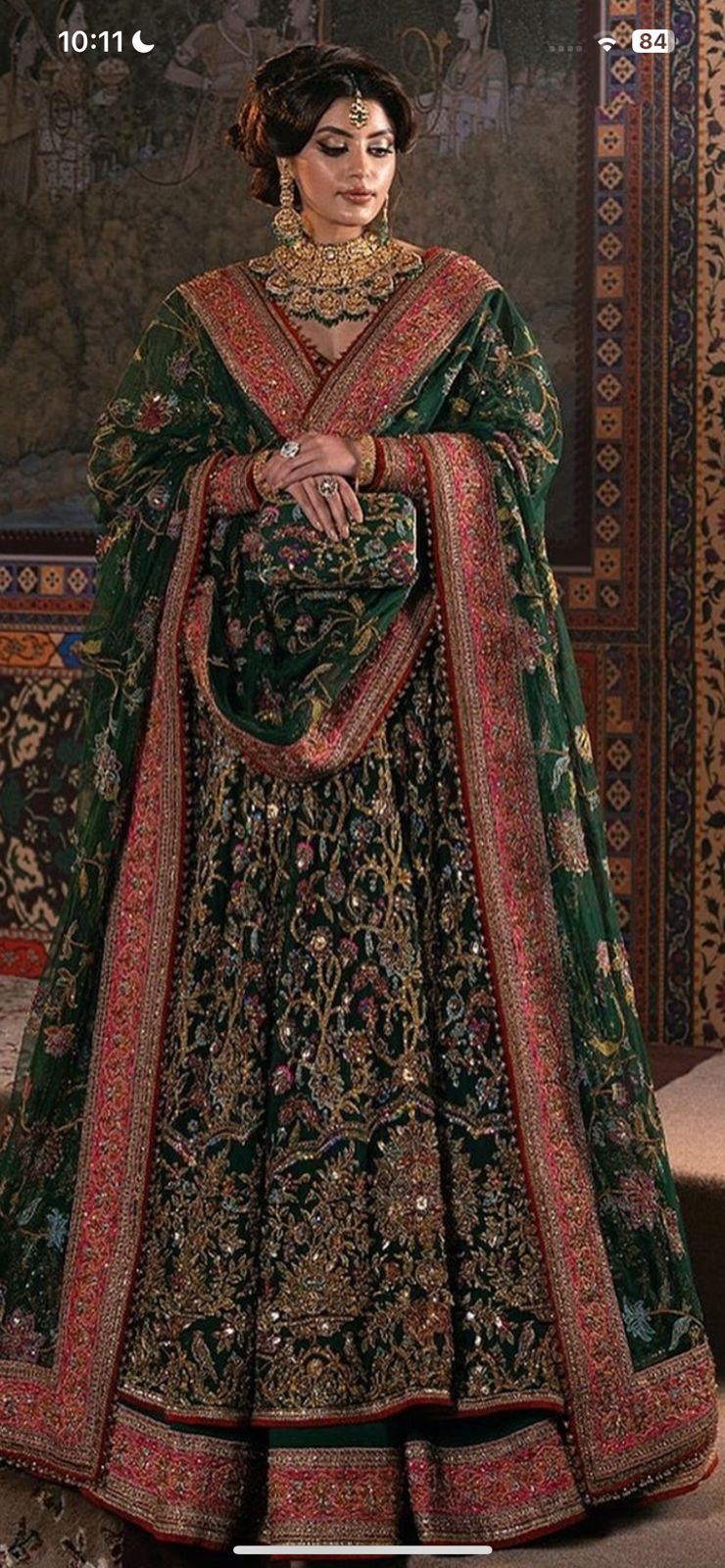 Envision yourself a captivating bride in this enchanting bottle green ensemble. The net pishwas boasts a base adorned with beautiful resham embroidery in a spectrum of colors, further accentuated by shimmering sequences. This captivating foundation reaches new heights with intricate zardozi work, adding a touch of regal elegance. The outfit flows seamlessly into a luxurious silk lehenga, finished with exquisite borders for a touch of sophistication. To complete the look, a delicate net dupatta reflects the pishwas embroidery, creating a cohesive and unforgettable statement for your special day.
