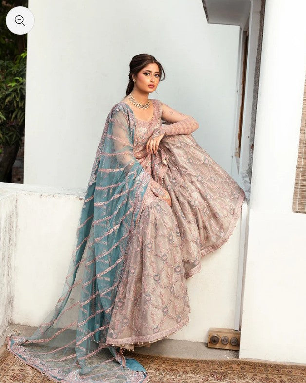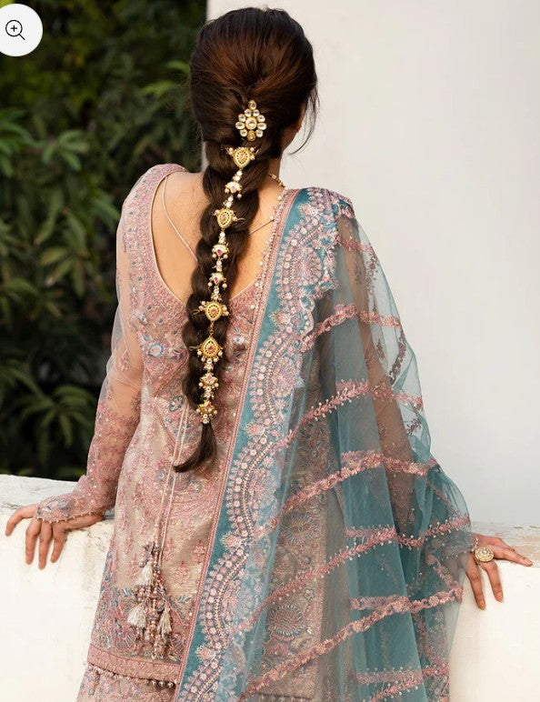 Aytan is a testament to the timeless allure of heirloom pieces. Handcrafted by top-tier artisans with expert know-how of each technique, this graceful net shirt and its sweeping gharara come sublimely ornamented with resham, tilla and sequins. The captivating tea-pink hue and embroidered net dupatta further add to the fairytale charm of the enchanting ensemble.
