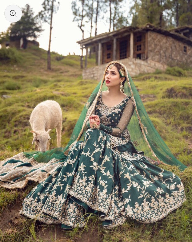 Description: An emerald green hand worked set featuring delicate tracery and floral trellises on the gharara and meticulous booti work on the kameez. Paired with a hand embellished dupatta.