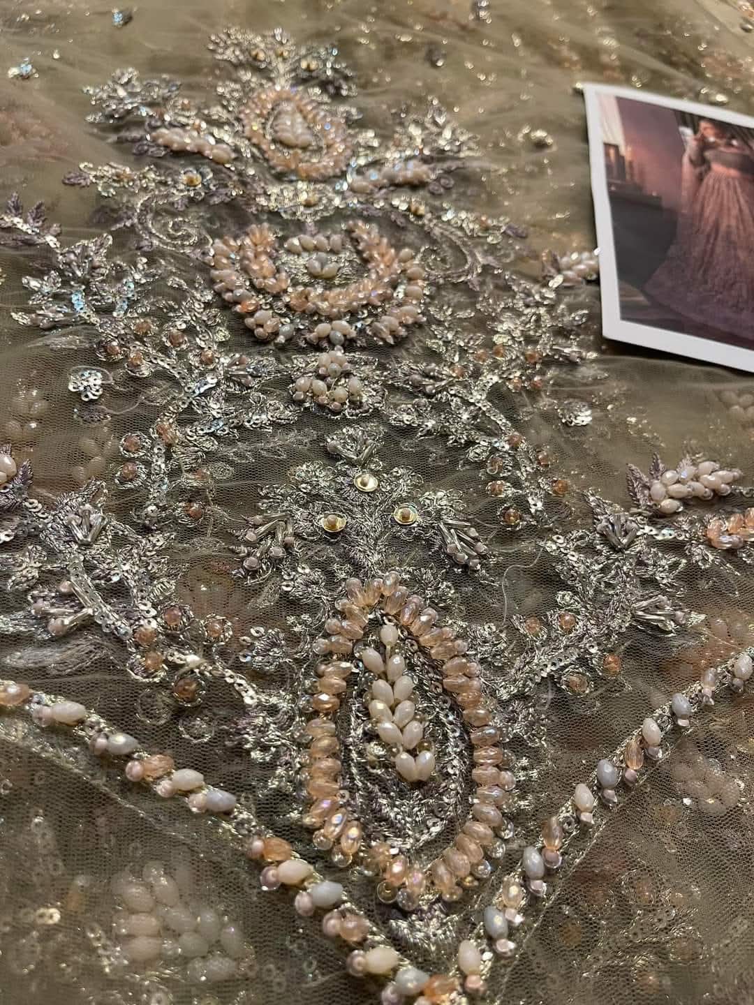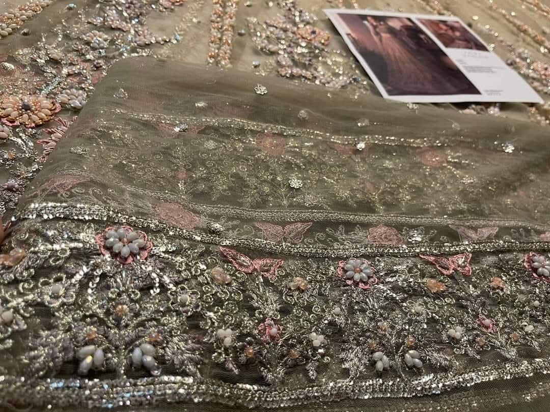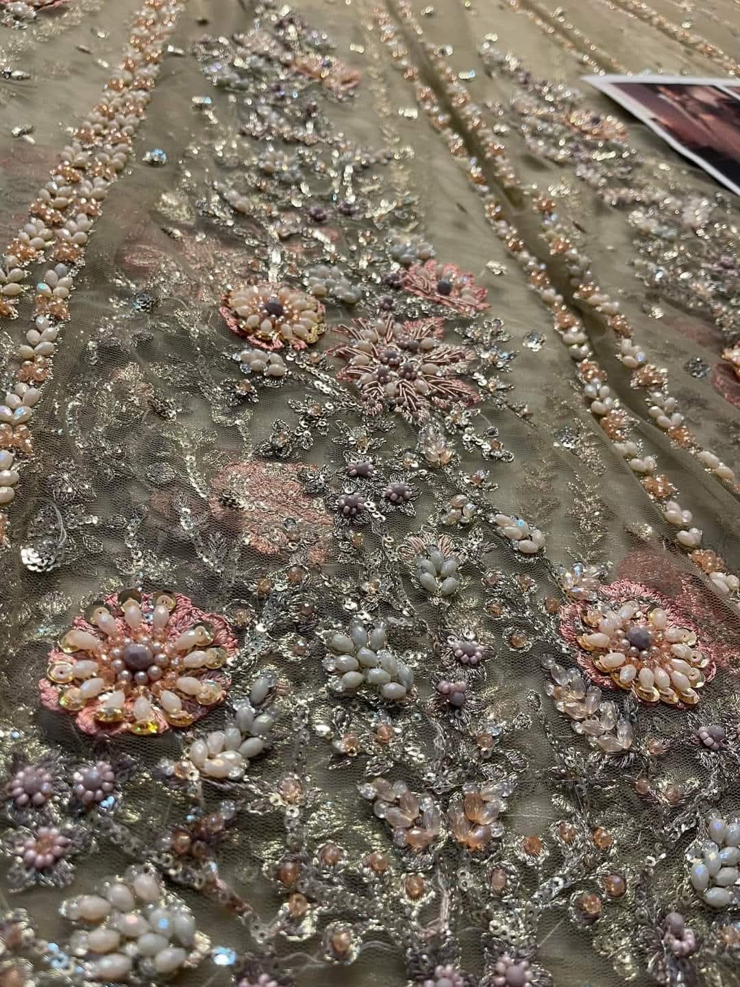 A three piece handworked beige bridal lehnga set featuring twinkling floral booti and stretched out vines on a glistening base of tissue.