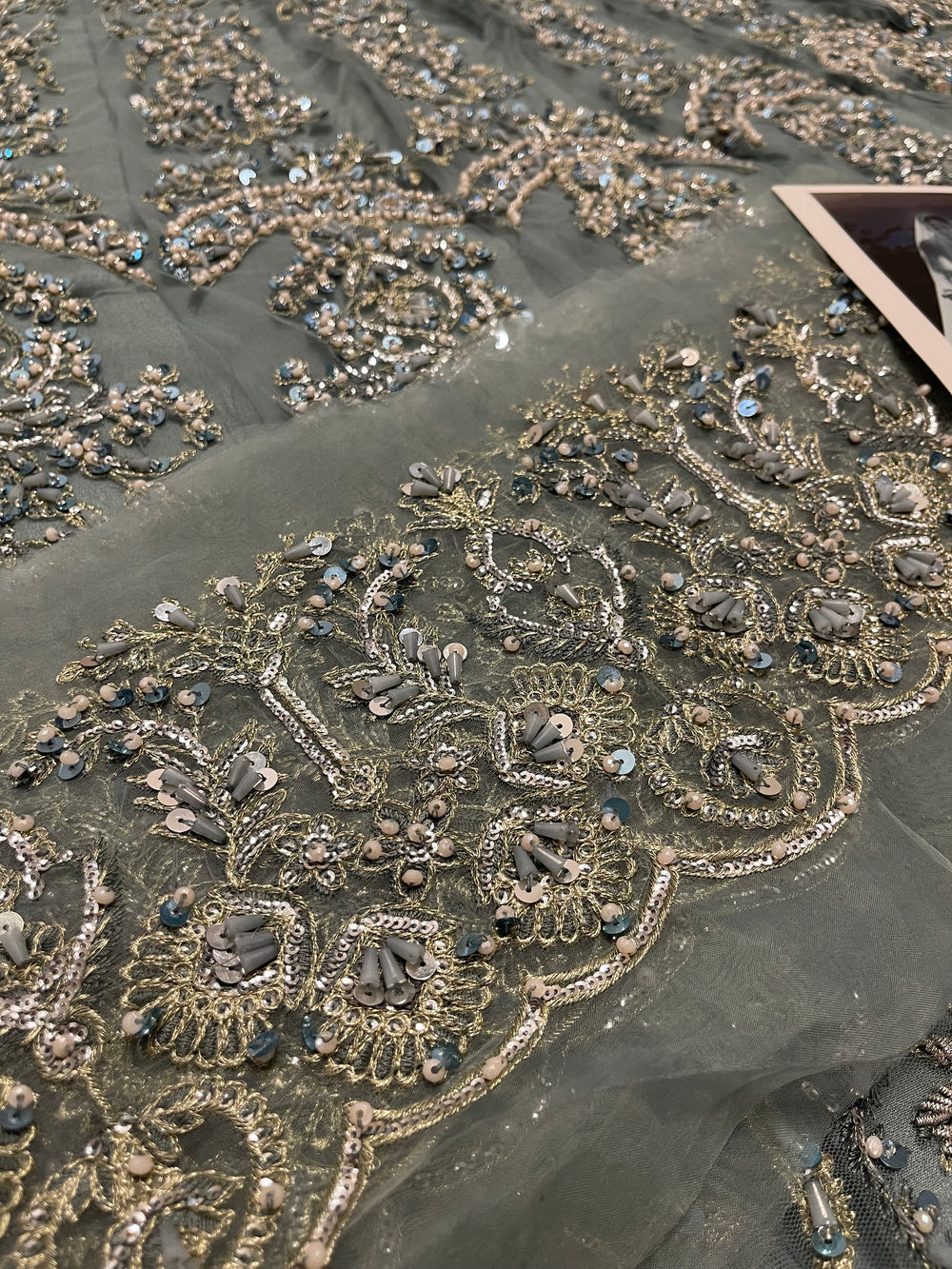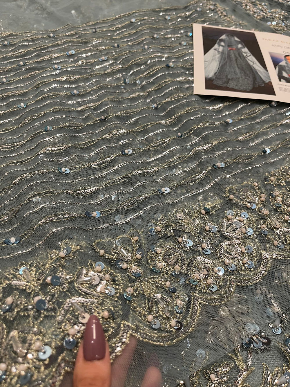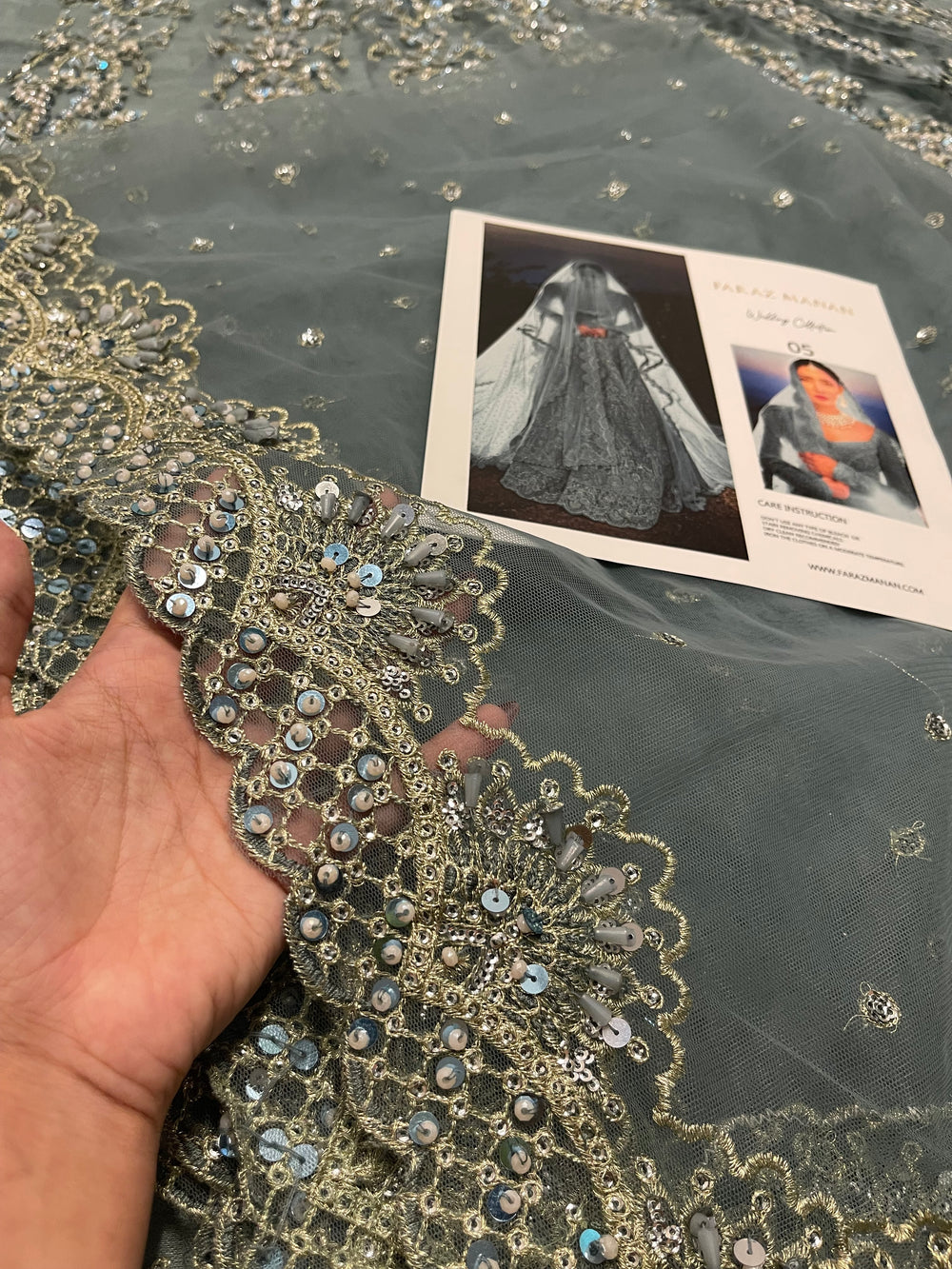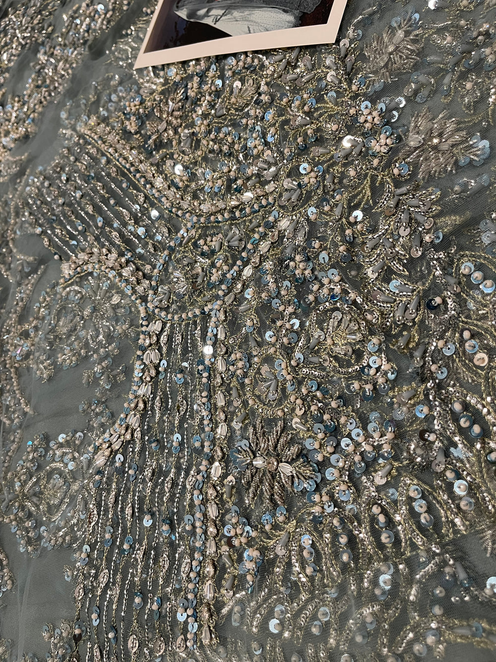 Custom Couture Ensemble | Inspired by Faraz Manan A masterfully handcrafted ensemble inspired by the timeless elegance of Faraz Manan’s design philosophy. This bespoke piece is brought to life in a uniquely curated shade, featuring an intricate tapestry of floral and vine motifs. Every inch is adorned with delicate hand embroidery — shimmering sequins, pearls, crystal beads, and metallic threadwork — woven together to create a luxurious, ethereal finish. A true celebration of craftsmanship and couture, this outfit blends traditional artistry with modern refinement, designed for those who appreciate detail, elegance, and individuality