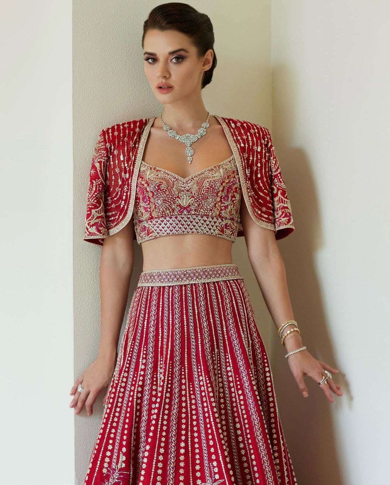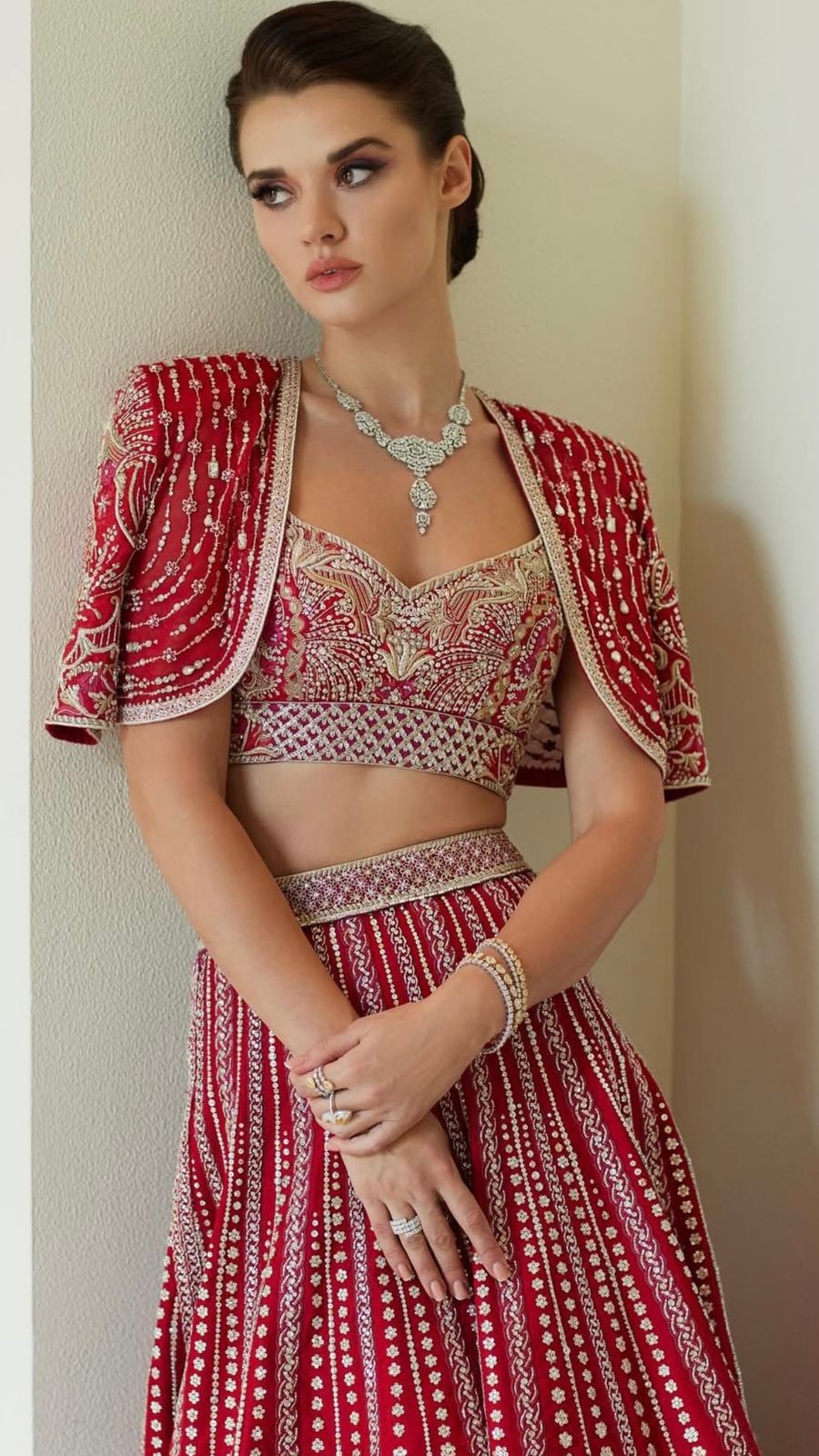 This stunning ensemble by Faraz Manan exudes elegance and sophistication, featuring a rich red lehenga adorned with intricate embroidery and embellishments. The flowing silhouette is paired with a delicately crafted blouse, highlighting exquisite craftsmanship and attention to detail. The ensemble is further accentuated by an ornate border, adding a regal touch to the overall look. Perfect for weddings and grand occasions, this creation blends traditional artistry with contemporary finesse, making it a timeless statement piece.