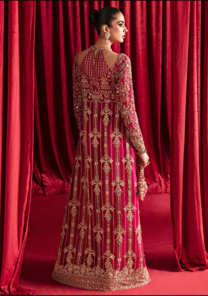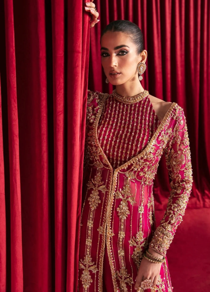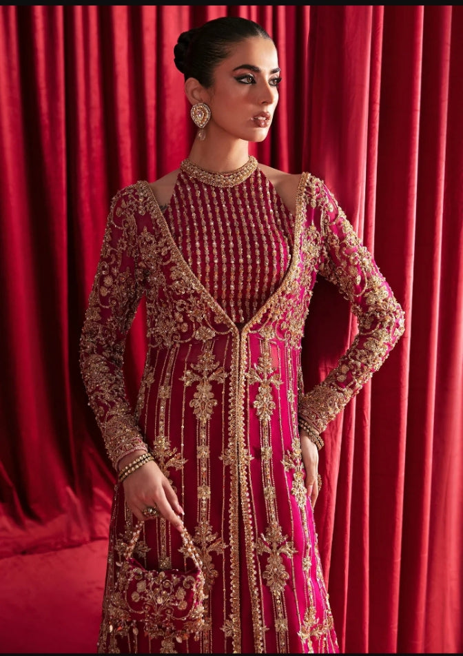 Breathtaking front open embroidered and embellished gown, an amazing attire that oozes glitz and confidence. This ensemble is designed to grab glances and make a bold statement at any event. The dress features a distinctive bustier that is intricately designed to give both style and comfort. Flared trousers with gold lace detailing completes the look of this ensemble.