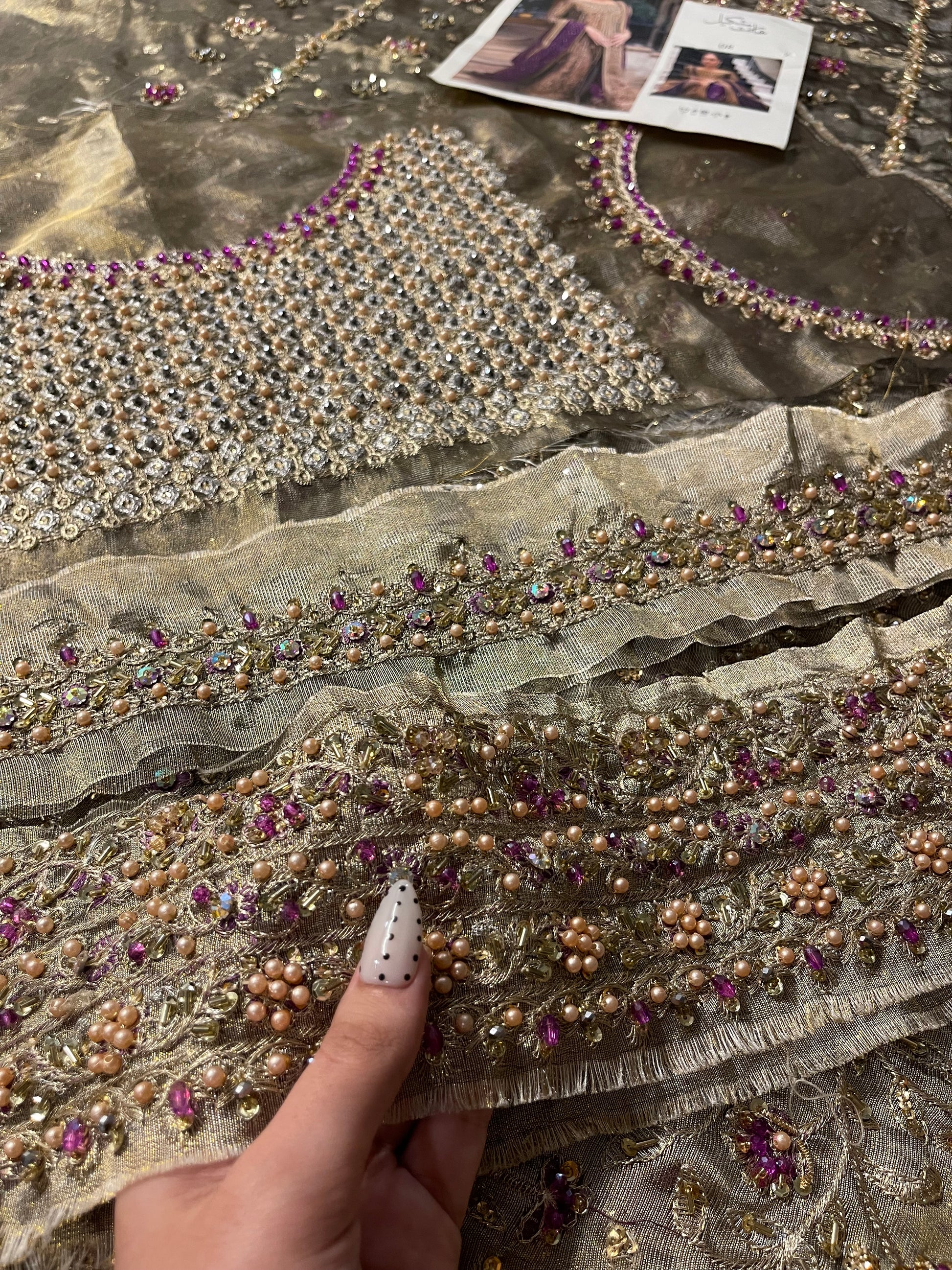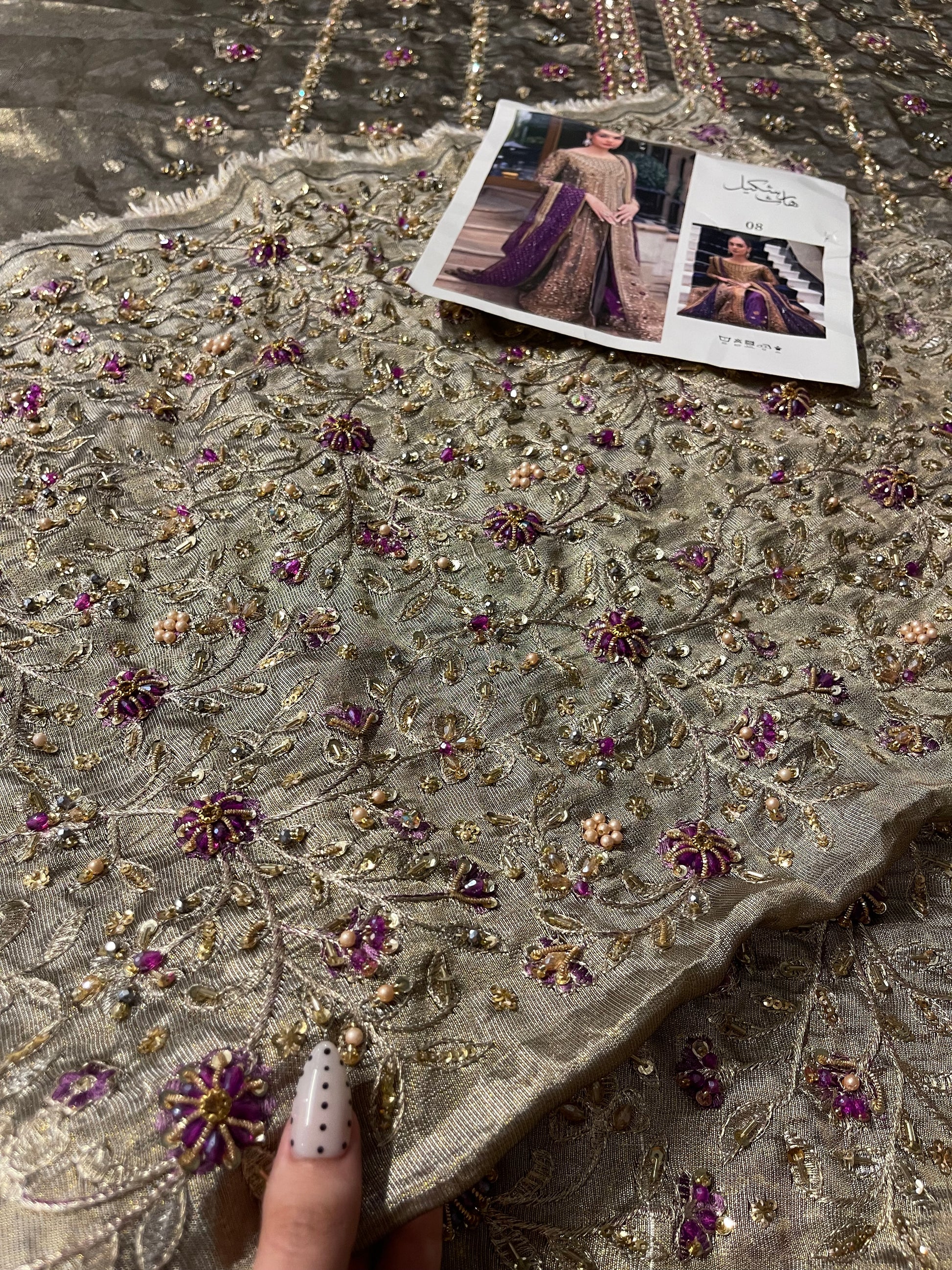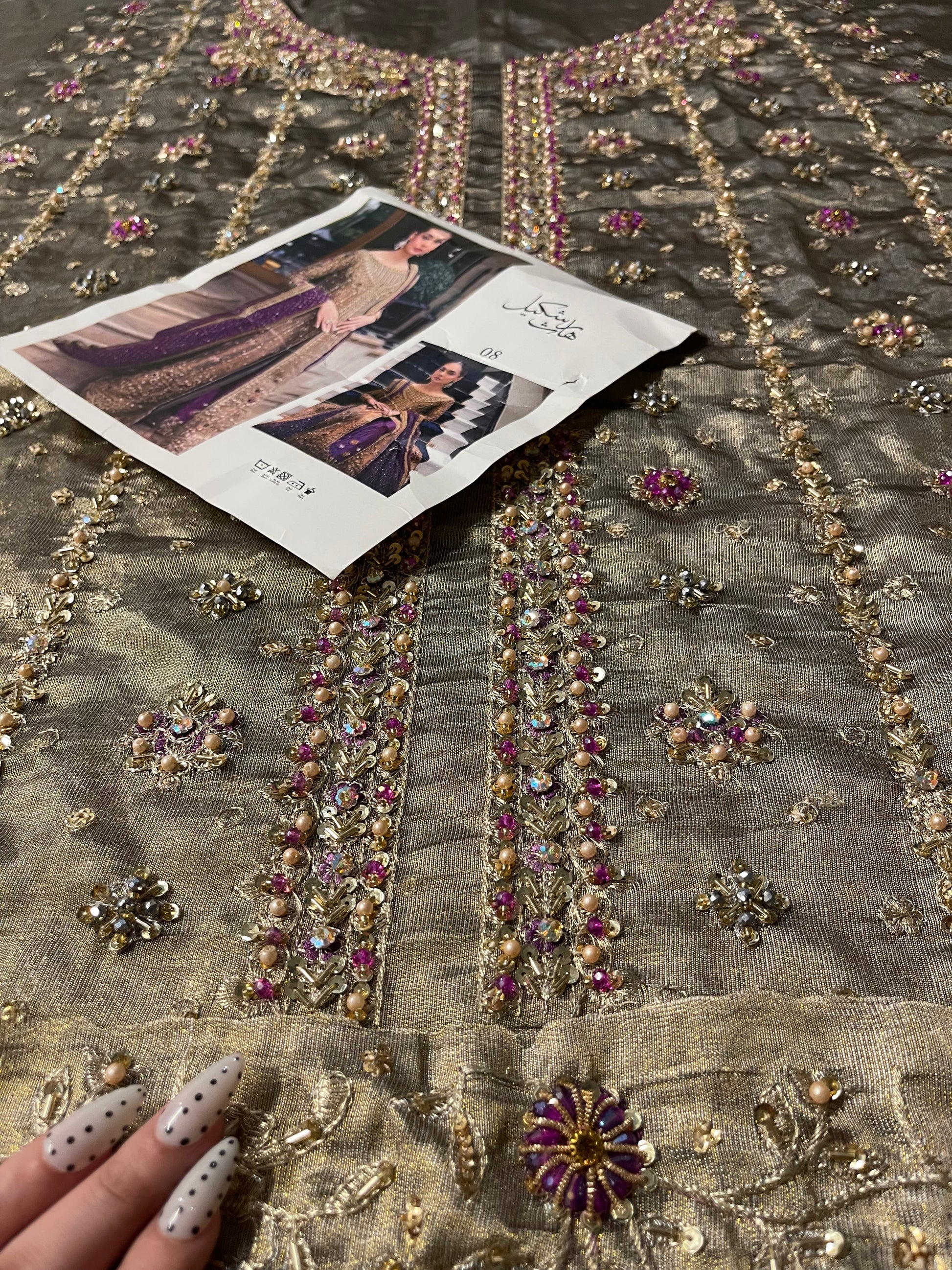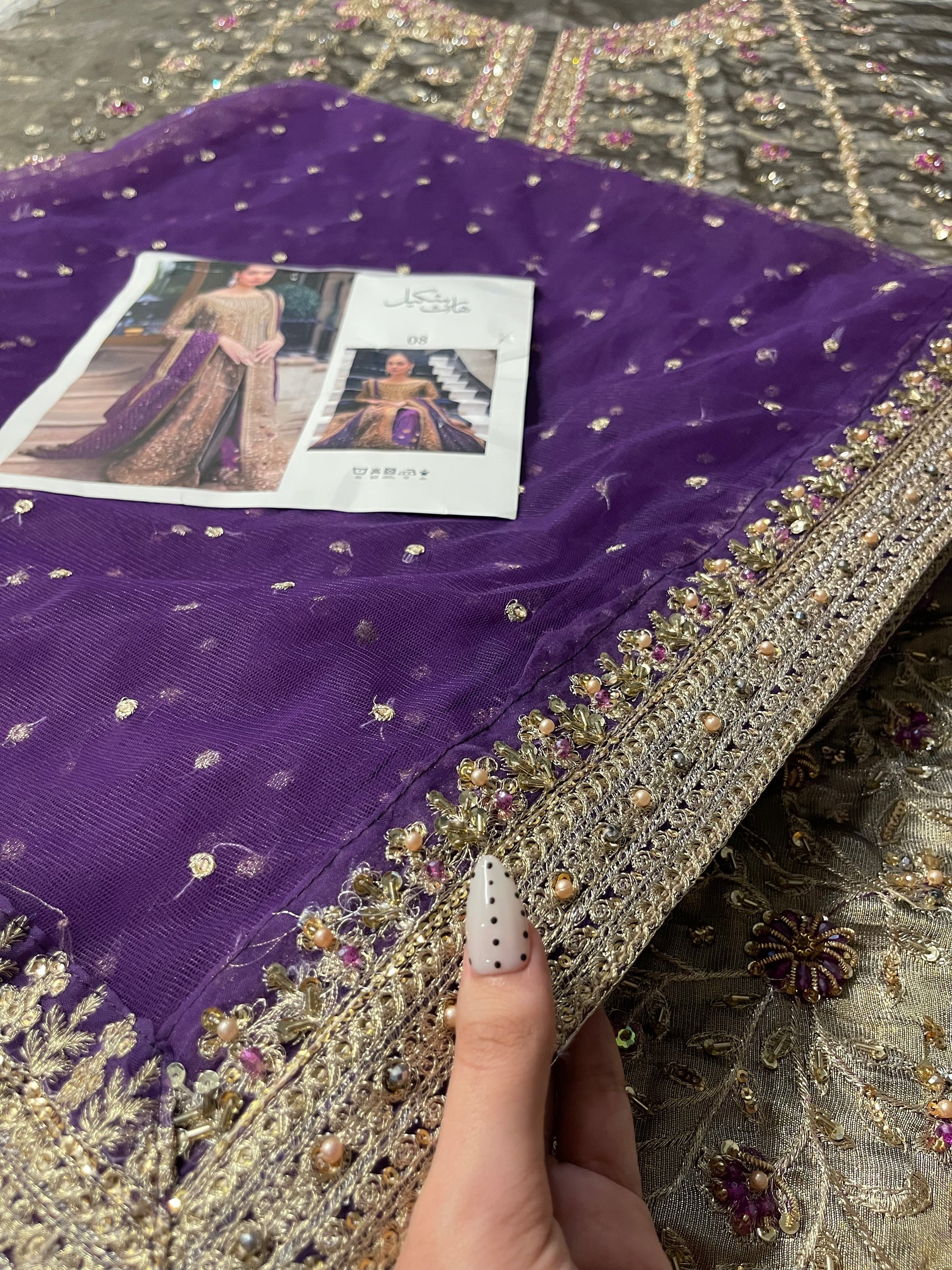 Step into timeless elegance with this breathtaking brushed-bronze Aroha-inspired ensemble, adorned with delicate handwork that glows softly from every angle. The long, flowing silhouette is enriched with intricate detailing, creating a dreamy, couture feel without appearing overly heavy. Paired with a striking deep aubergine dupatta, sprinkled with dainty embellishments and embroidery, the outfit brings together a regal colour palette that looks stunning in both daylight and evening lighting.