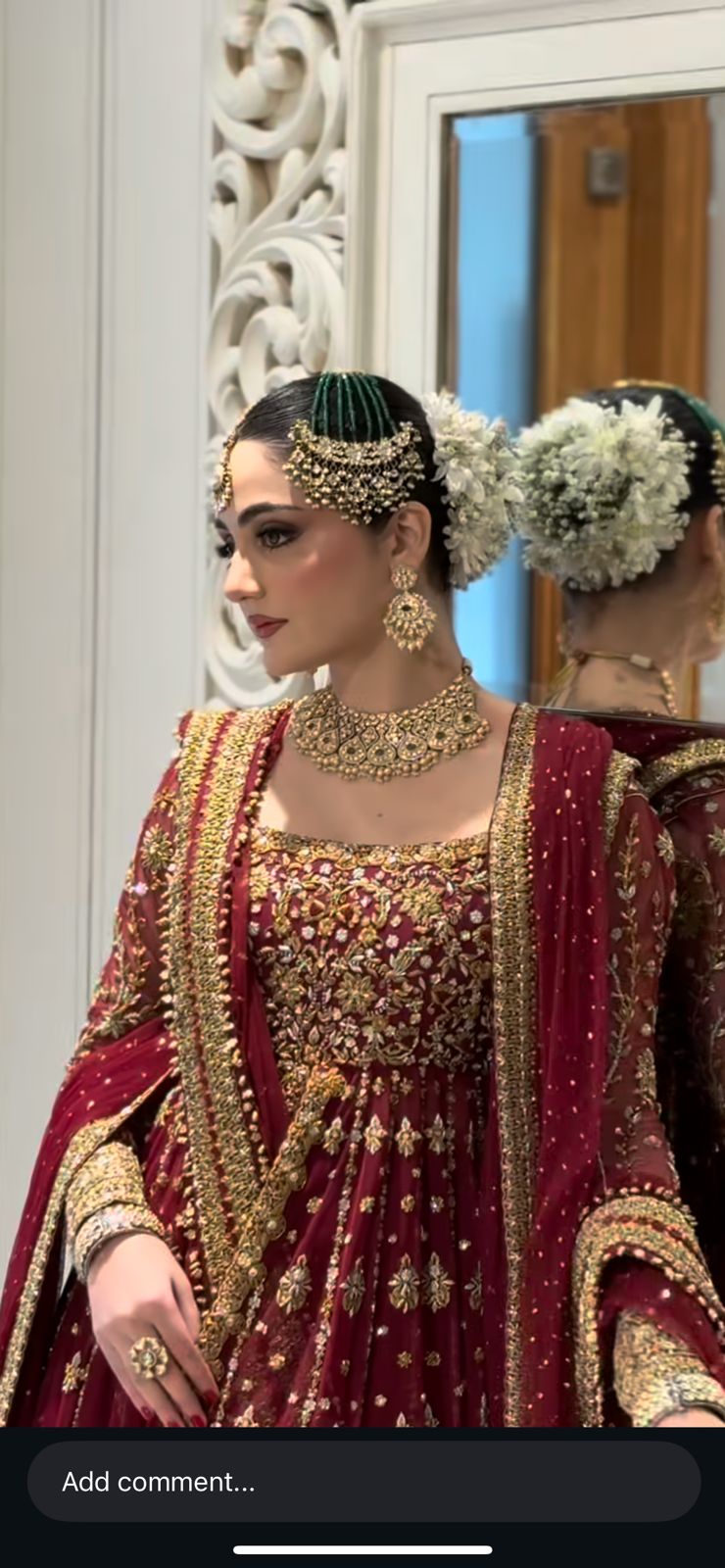 Haris Shakeel This is a traditional Pakistani bridal lehenga in a deep maroon or red velvet fabric with intricate gold embroidery and embellishments.