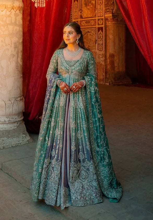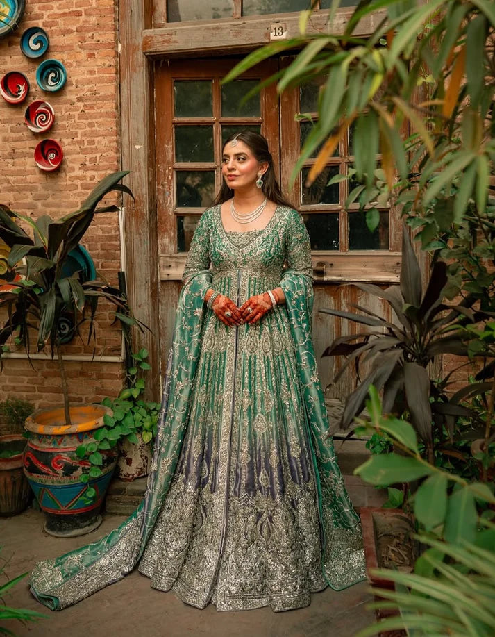 Step into a world of opulence with this enchanting couture ensemble by Honey Waqar. Drenched in majestic hues of soft emerald and royal amethyst, this flared silhouette is a true celebration of craftsmanship and heritage. Intricately adorned with hand-embellished silver zari, tilla, and sequins, the design evokes an aura of timeless royalty.