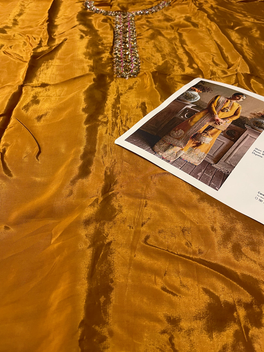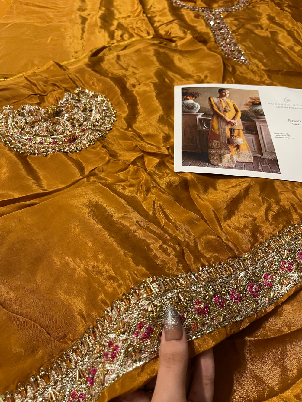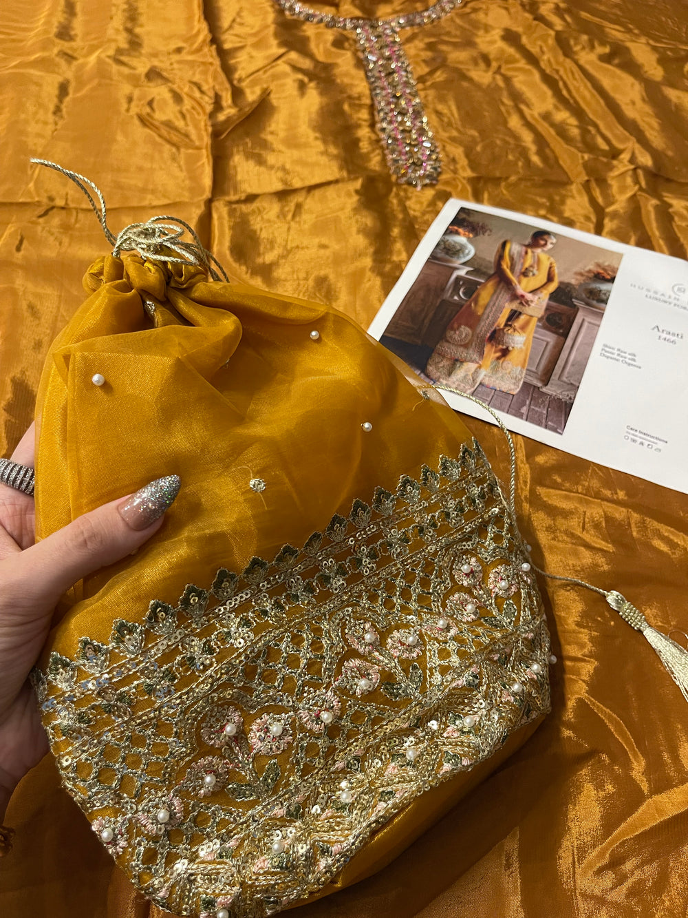 The Arasti ensemble is a 4pc ensemble (shirt, bottom, duppata & potli) in a yellow mustard-tone beautifully adorned...