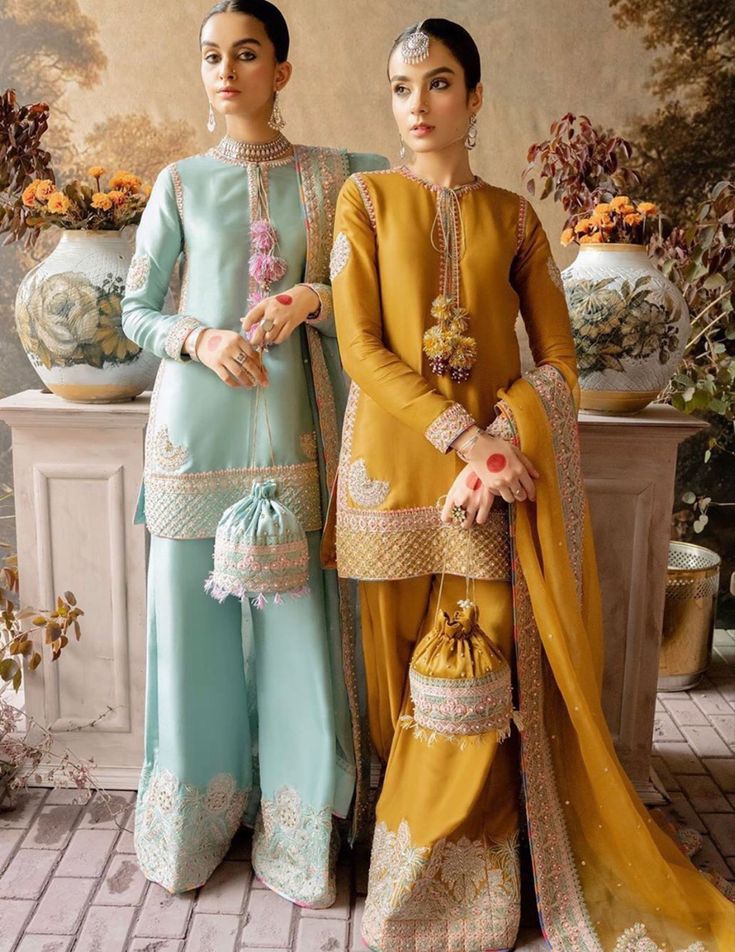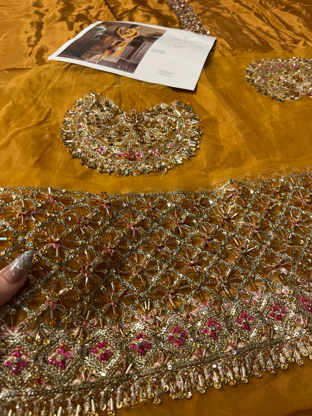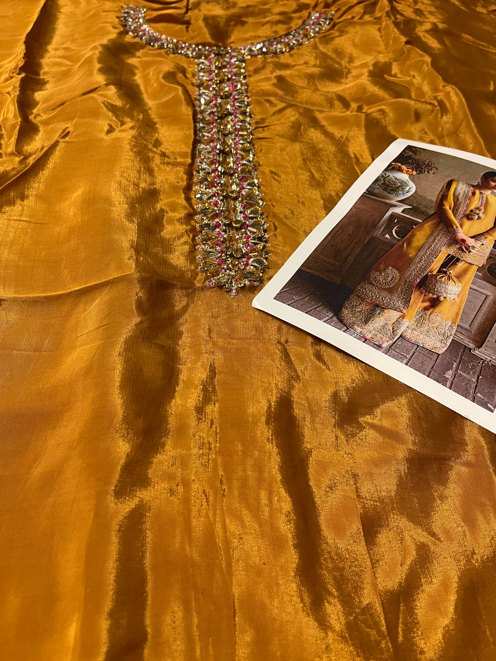 The Arasti ensemble is a 4pc ensemble (shirt, bottom, duppata & potli) in a yellow mustard-tone beautifully adorned...