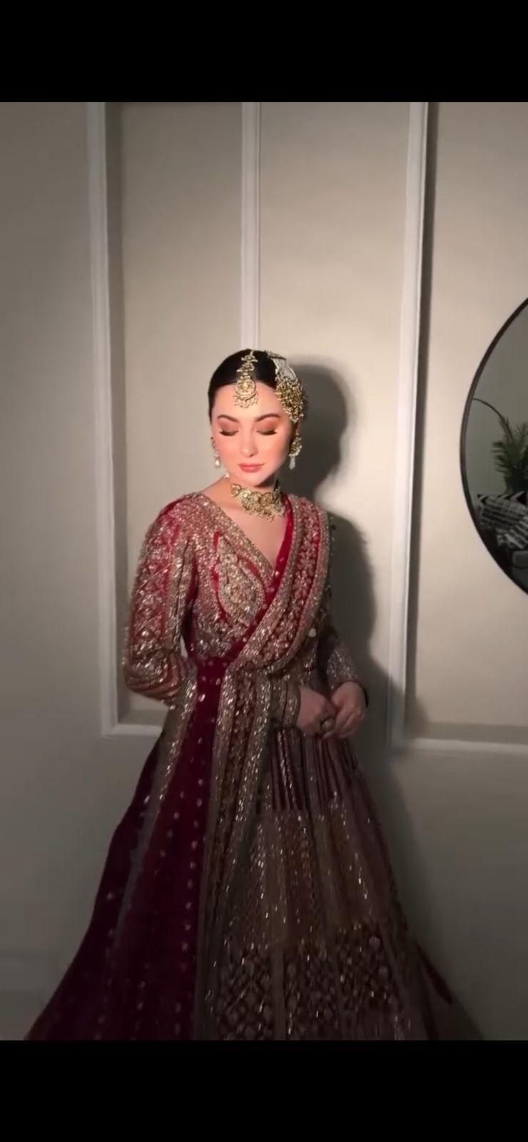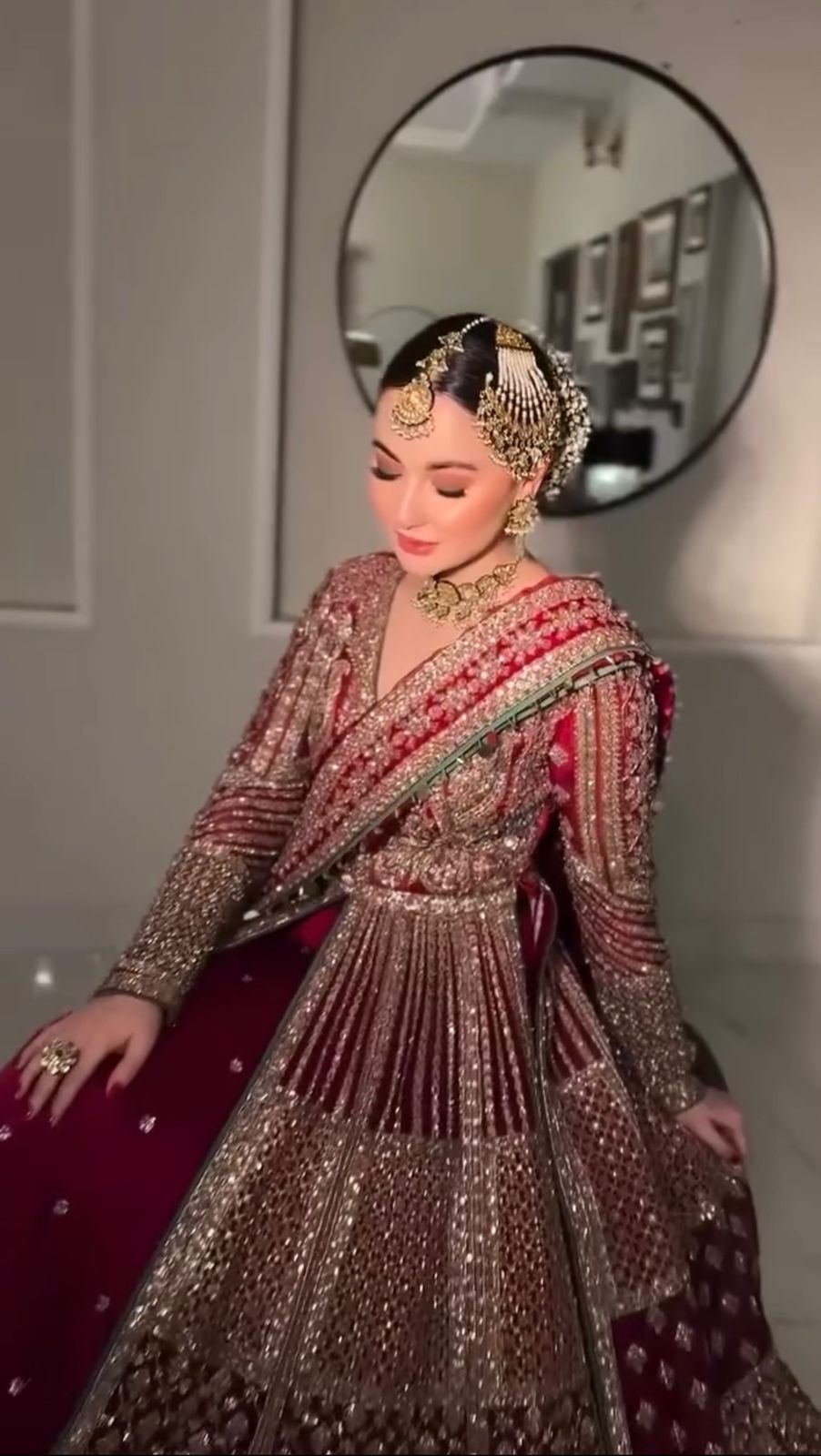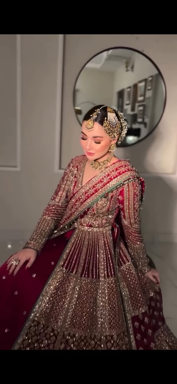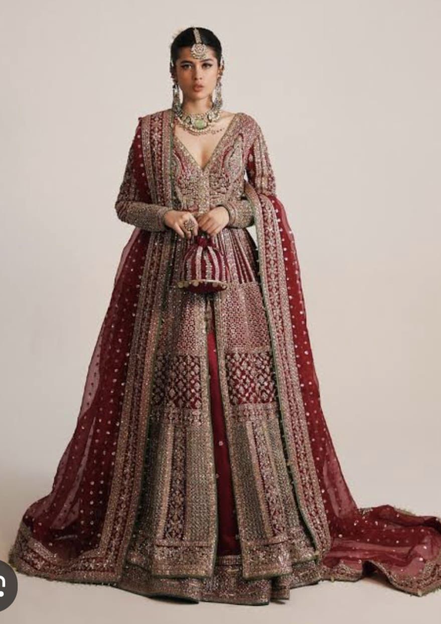 A regal affair in maroon and antique gold — this ensemble whispers tales of timeless grandeur. Enveloped in layers of intricate handwork, it dances between tradition and opulence. The silhouette commands grace, while every motif seems to echo a story untold. Perfect for the bride who carries legacy in her poise and poetry in her gaze.