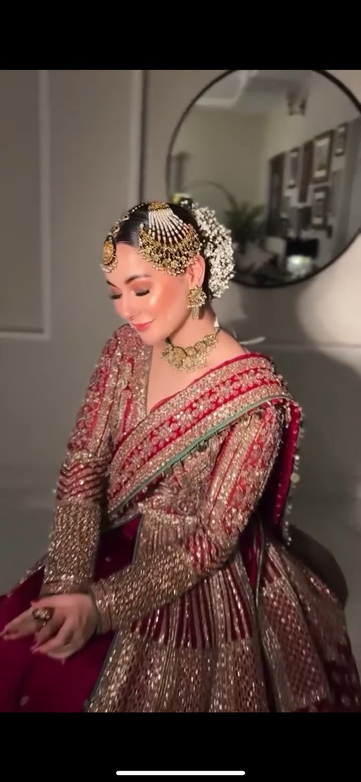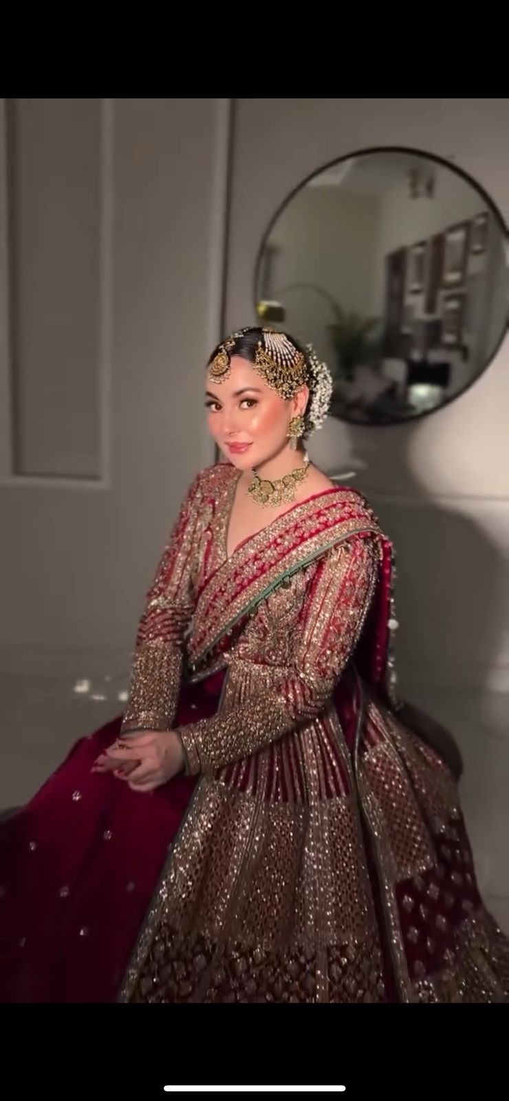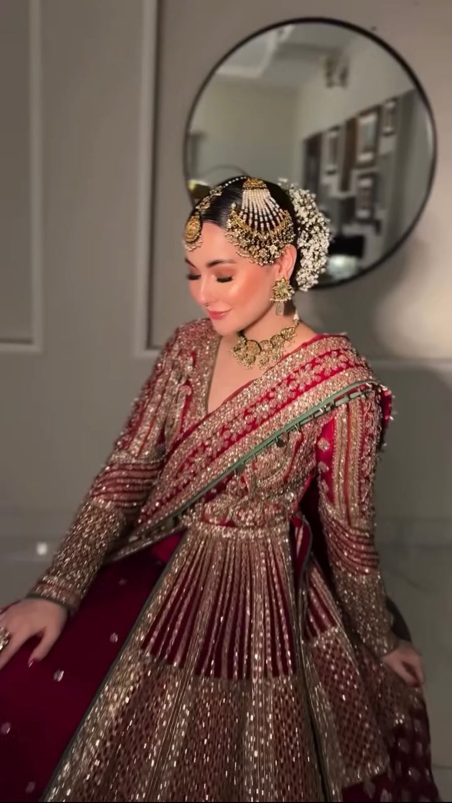 A regal affair in maroon and antique gold — this ensemble whispers tales of timeless grandeur. Enveloped in layers of intricate handwork, it dances between tradition and opulence. The silhouette commands grace, while every motif seems to echo a story untold. Perfect for the bride who carries legacy in her poise and poetry in her gaze.