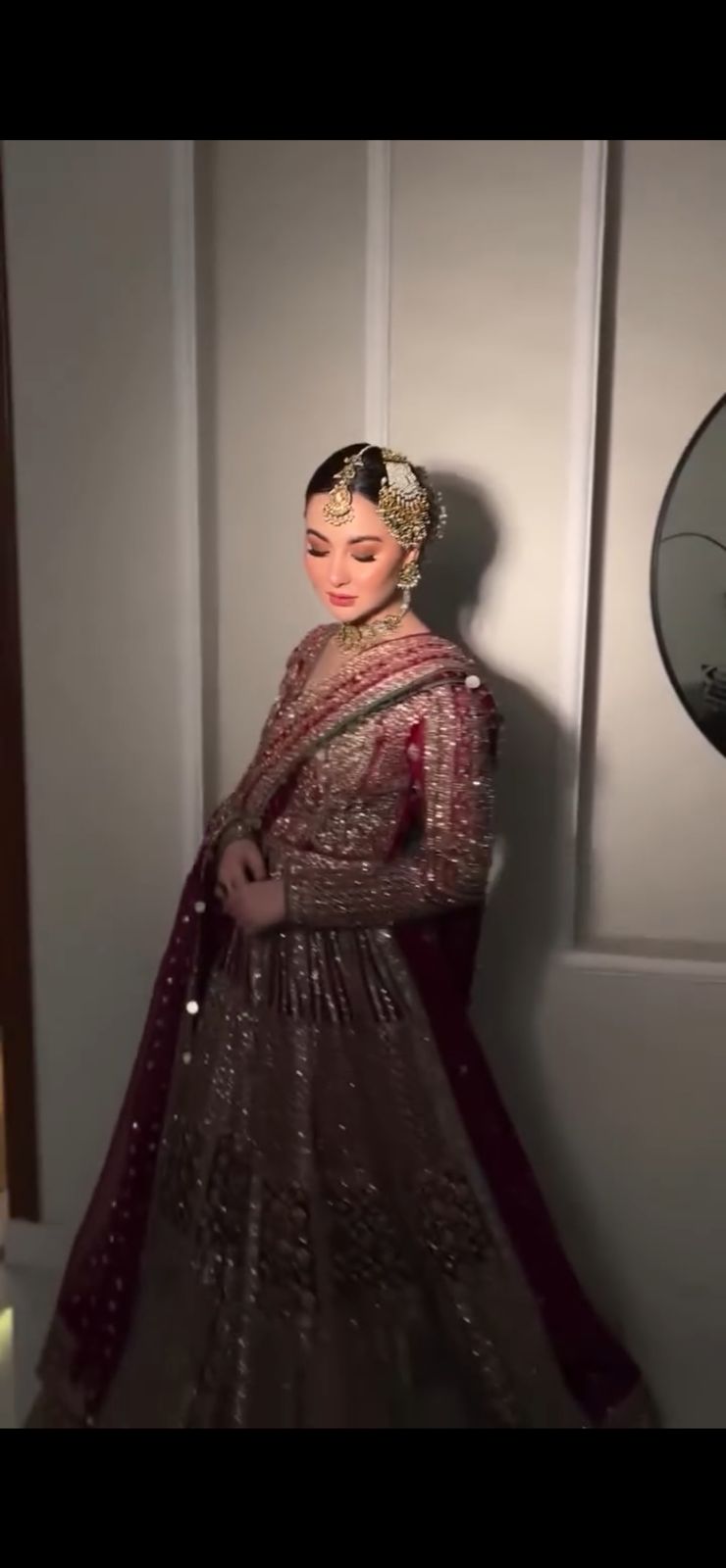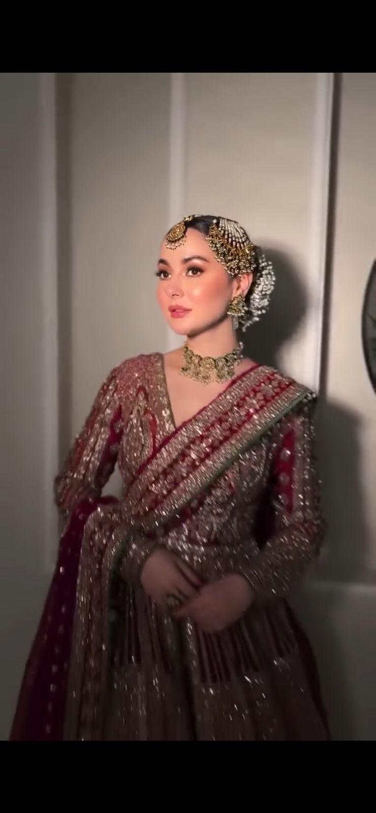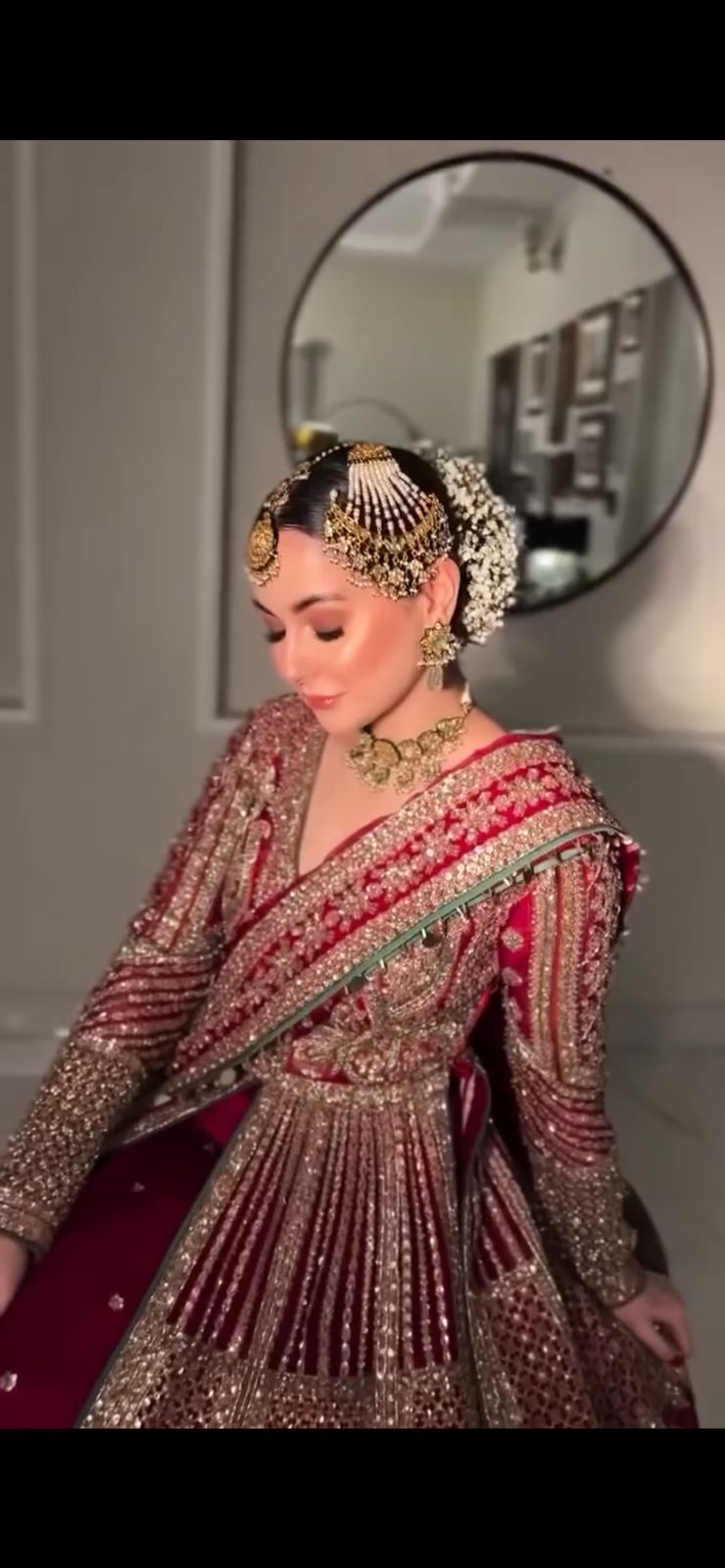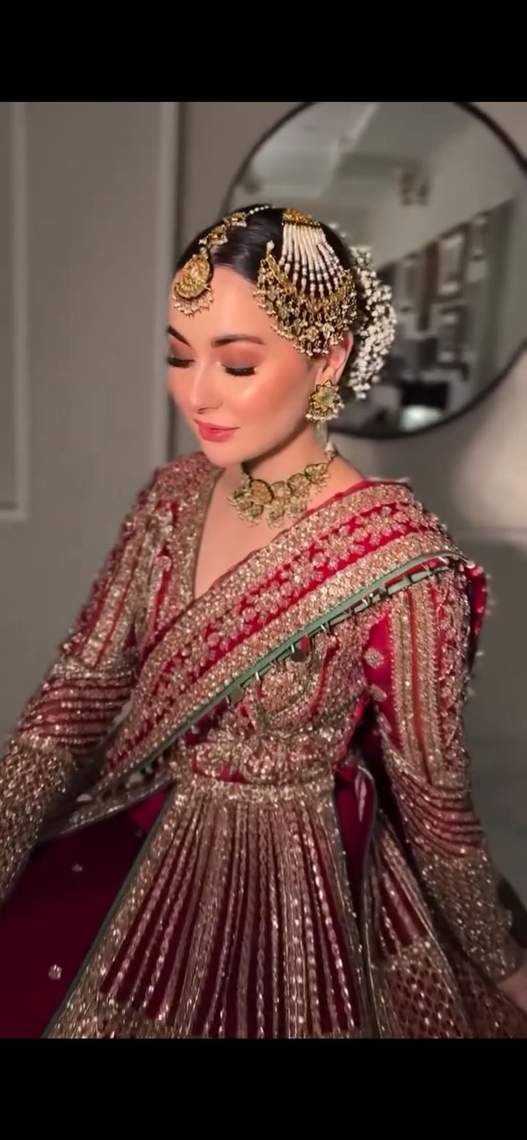 A regal affair in maroon and antique gold — this ensemble whispers tales of timeless grandeur. Enveloped in layers of intricate handwork, it dances between tradition and opulence. The silhouette commands grace, while every motif seems to echo a story untold. Perfect for the bride who carries legacy in her poise and poetry in her gaze.