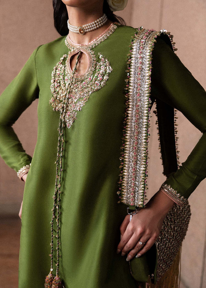 Céleine — A portrait of poised elegance in a deep olive hue. This ensemble features a sleek long shirt with a distinctive keyhole neckline, exuding subtle charm and grace. The matching wide-leg trousers showcase a striking geometric pattern, adding depth and movement to the silhouette. A gracefully draped dupatta completes the look with just the right touch of refinement. Timeless, composed, and effortlessly chic — Céleine is made for the modern muse with a love for classic glamour.