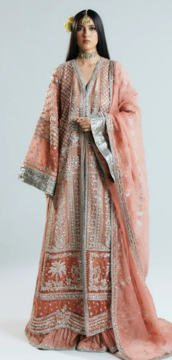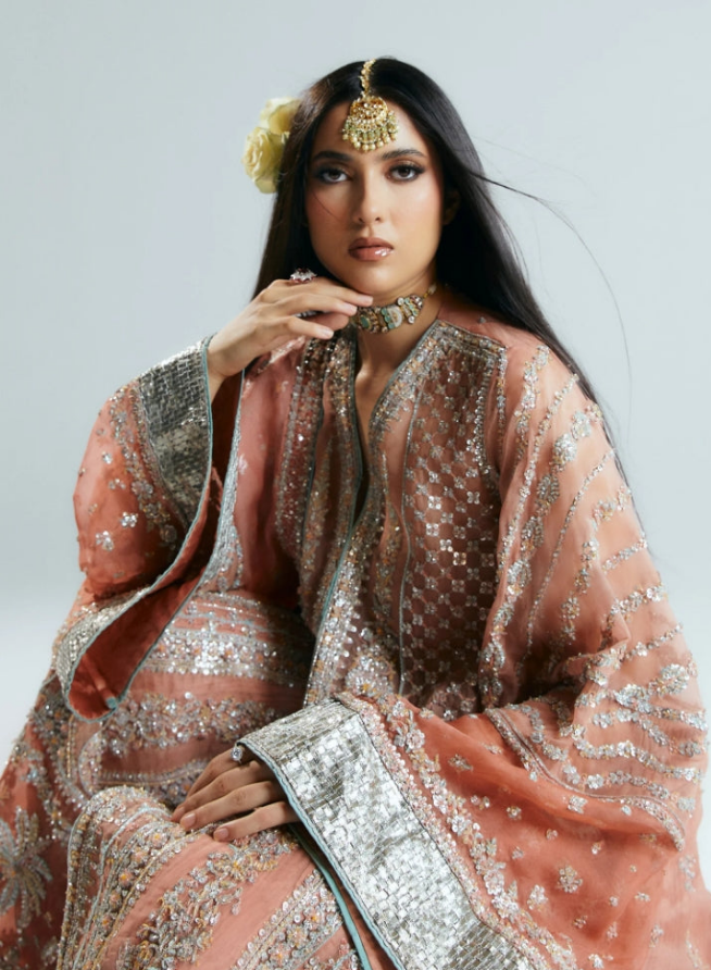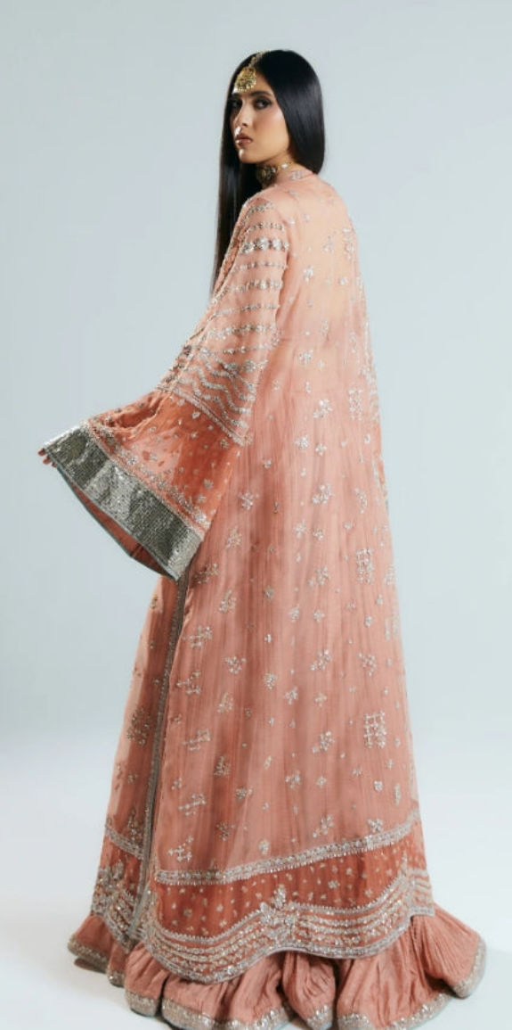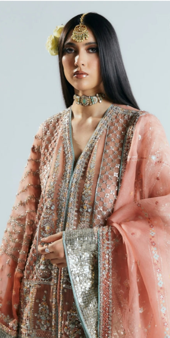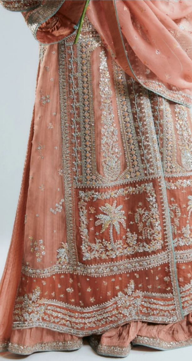 This silhouette brings a modern charm to your wardrobes with its pastel peach and orange color blocking. Further it features crushed sharara adds a texture, with embellished border paired with screen printed dupatta with four side heavy embellished borders.