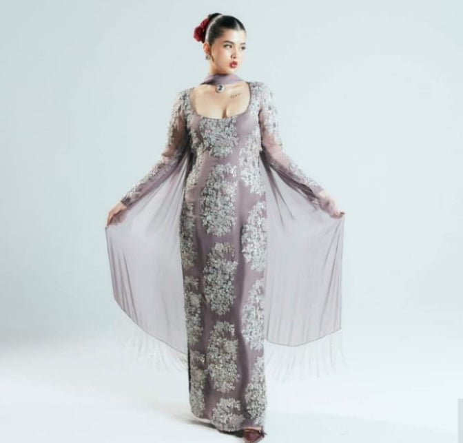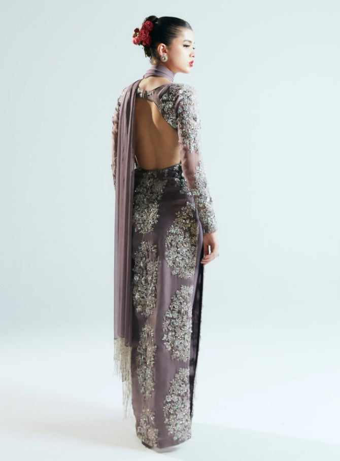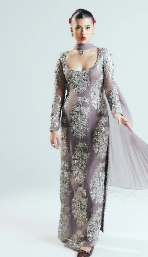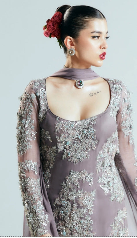 Thunder-Behold this celestial dream couture piece is must have. A symphony of allure unfolds into sheer tone-on-tone silhouette, adorned with hand-sewn sequins and a modern deep neckline. Paired with Korean Rawsilk Choridar with solid chiffon dupatta embellished with sequins tassels in pallus.