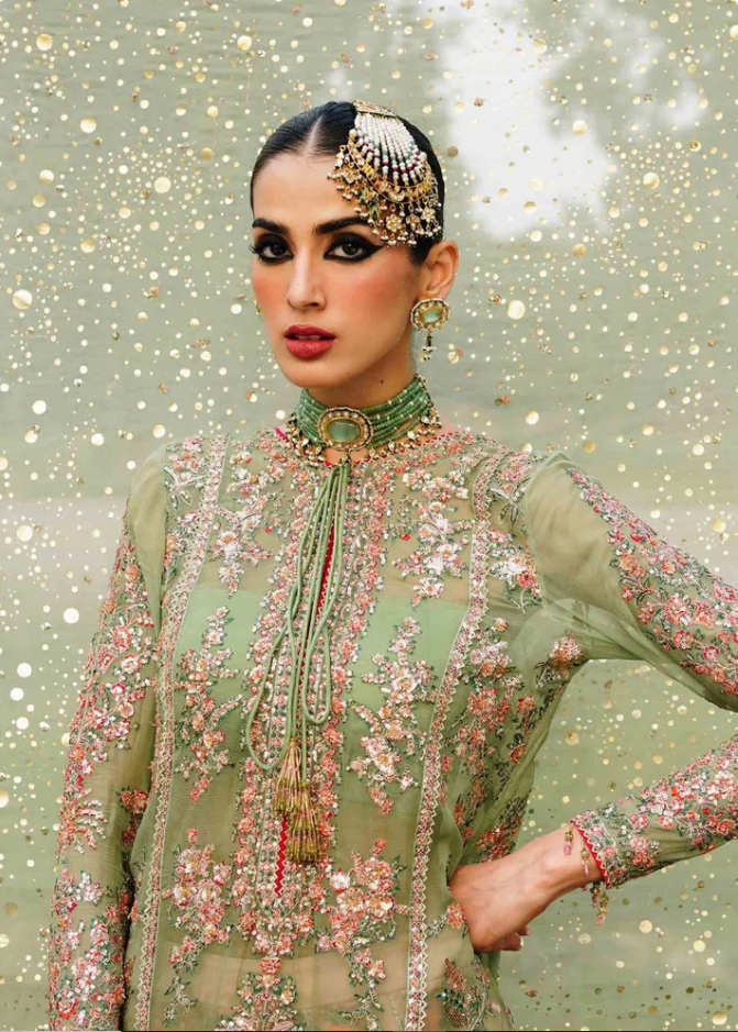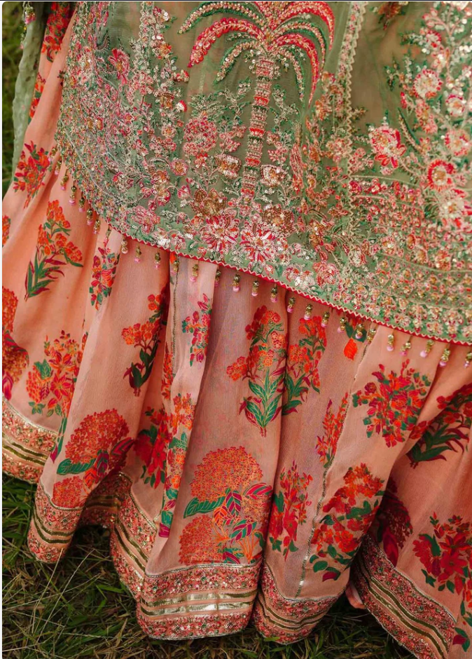This summery pastel mint green shirt embroidered with the shades of pink, orange and sage greens enhancing the floral vines and palm tree.A perfect illustration of dazzling hues featuring stunning intricate handwork details of sequins and buggle beads along with chiffon screen printed Sharara Paired with a foil printed duppata enhanced with sequin details.