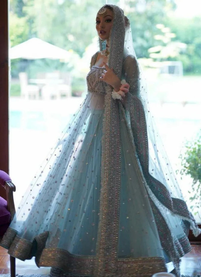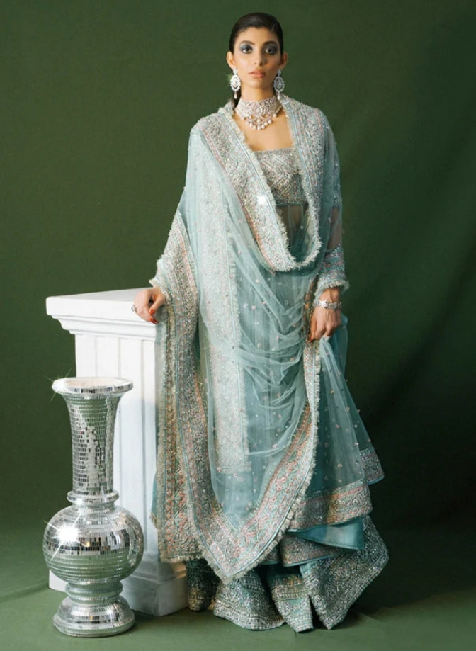 This ice blue net pishwas is gorgeously emberoided in hues of pinks and blues along with silver tilla. Adorned with pink and silver pipe work, mukesh, dabka, naqshi and stones.Completing the look with crushed silk sharara with heavy borders along with net dupatta featuring thick embellished four sided borders.