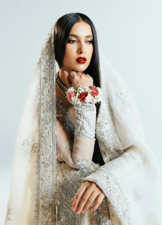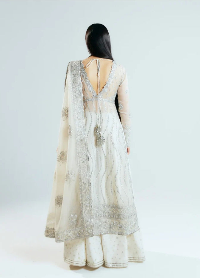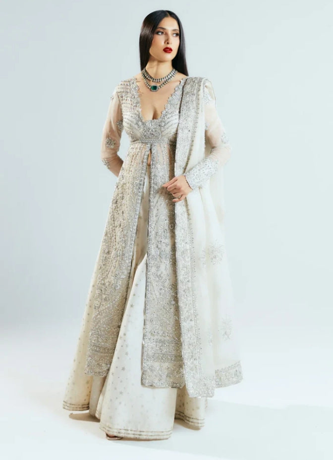 This beautiful ivory outfit definitely makes a style statement. It is paired with foil printed sharara and embroidered dupatta with heavily embellished borders on four sides with sequins, cut dana and with nakashi, dabka, making it a stellar piece.