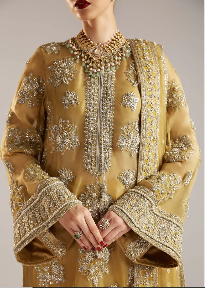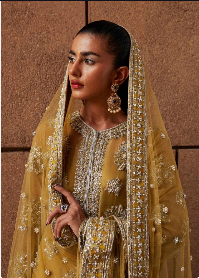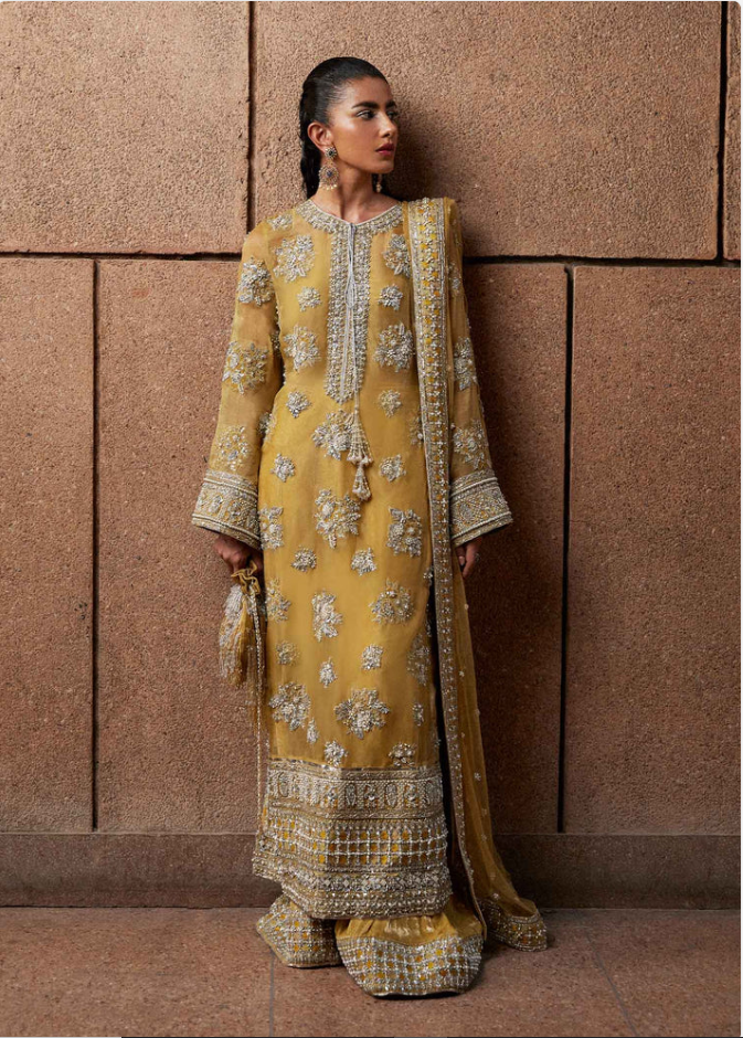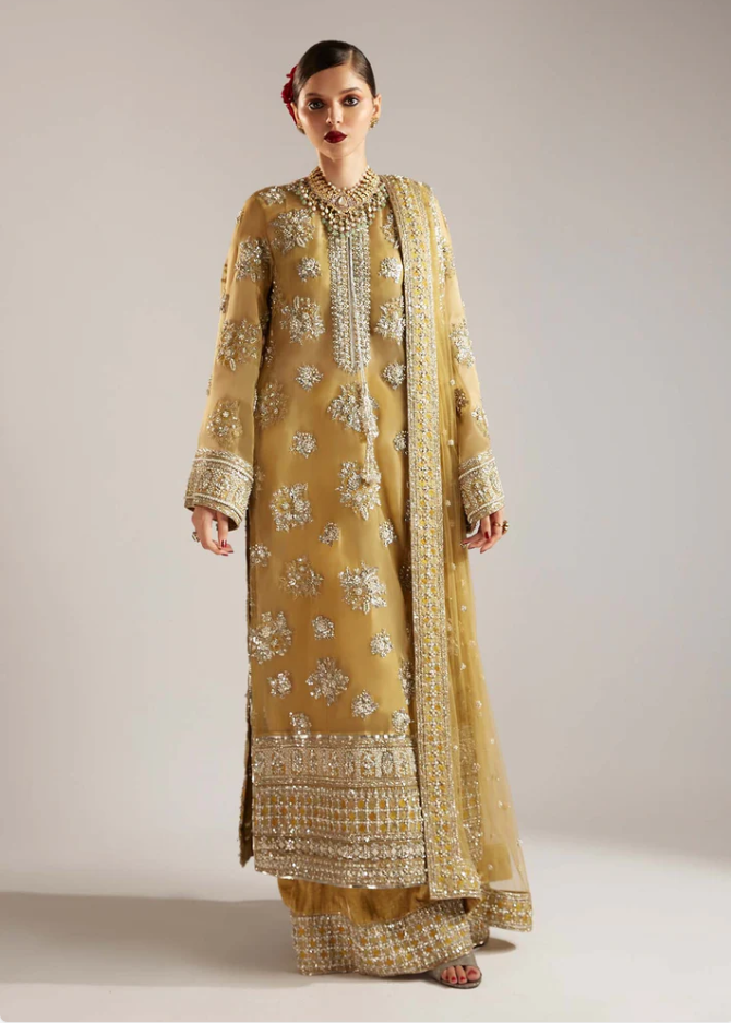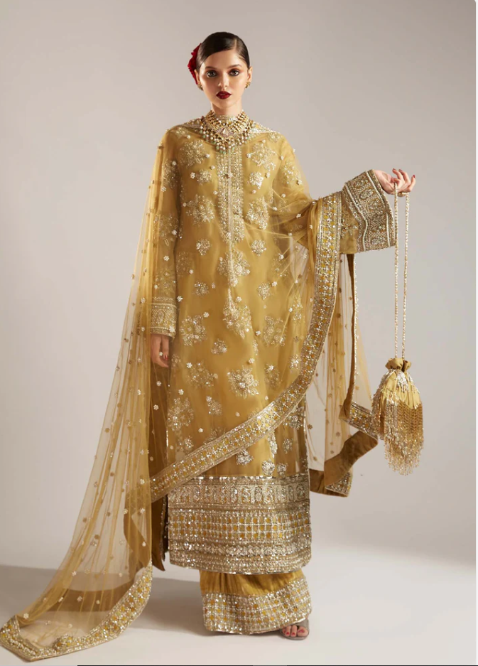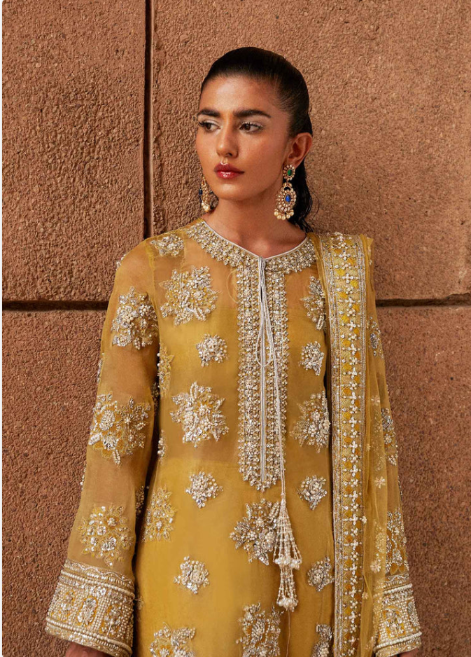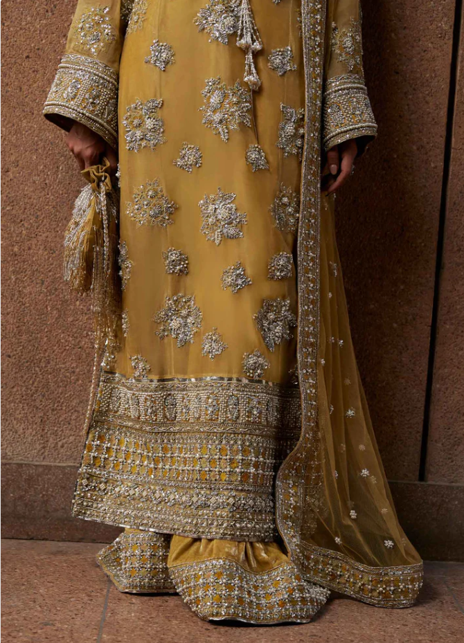 This silhouette brings a modern charm to your wardrobes with its pastel lime yellow color, composed with cross stich floral motifs all over and with distinctive daman borders. Further it features velvet palazzo with color block embellished border and with net dupatta composed with pearl spray and with heavy embellished four side borders.