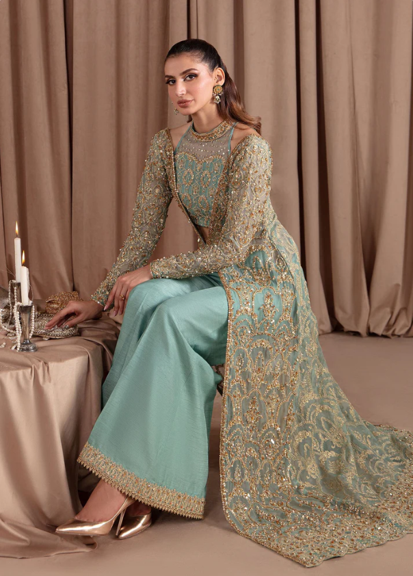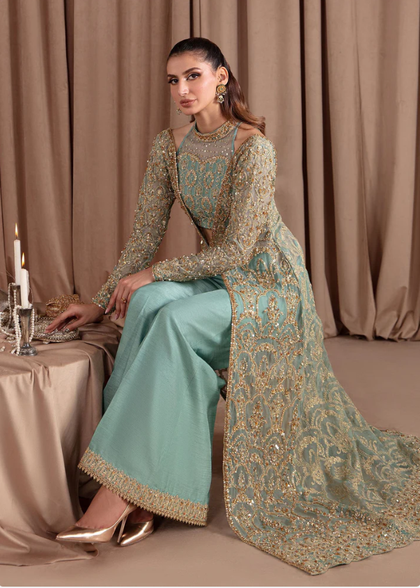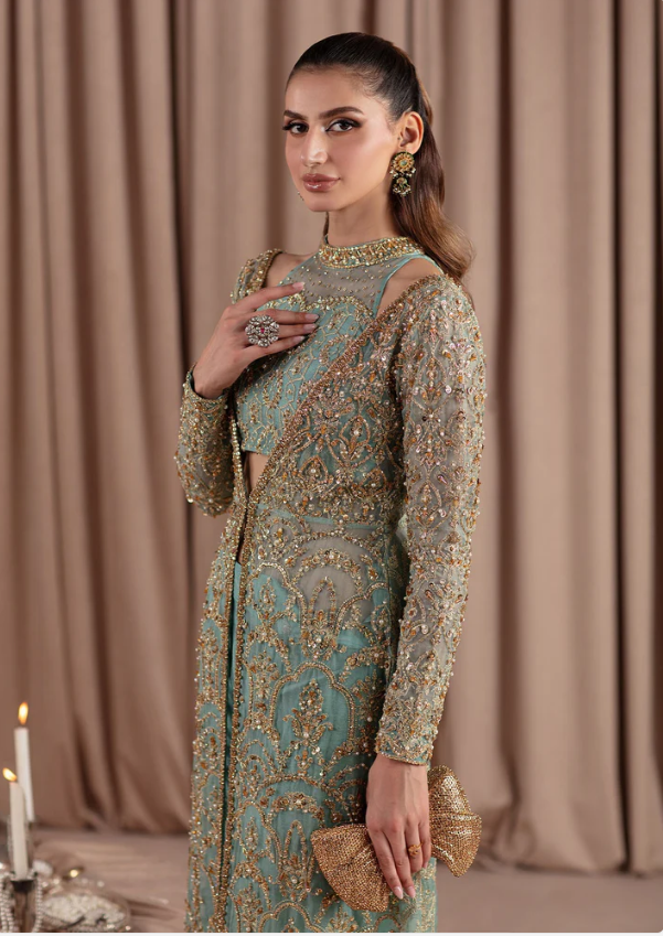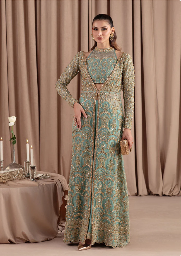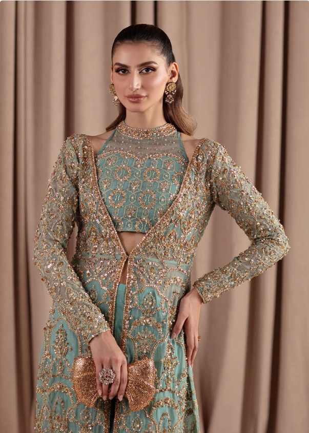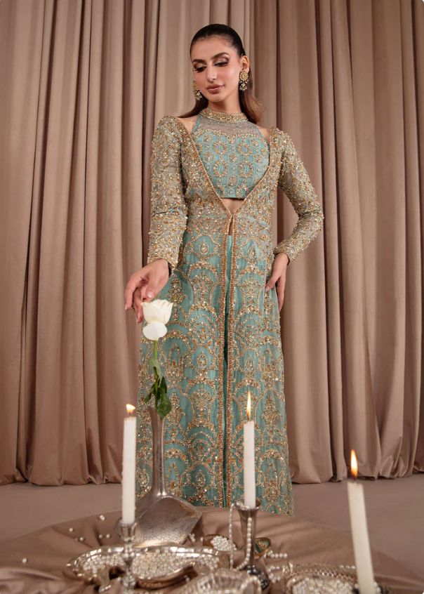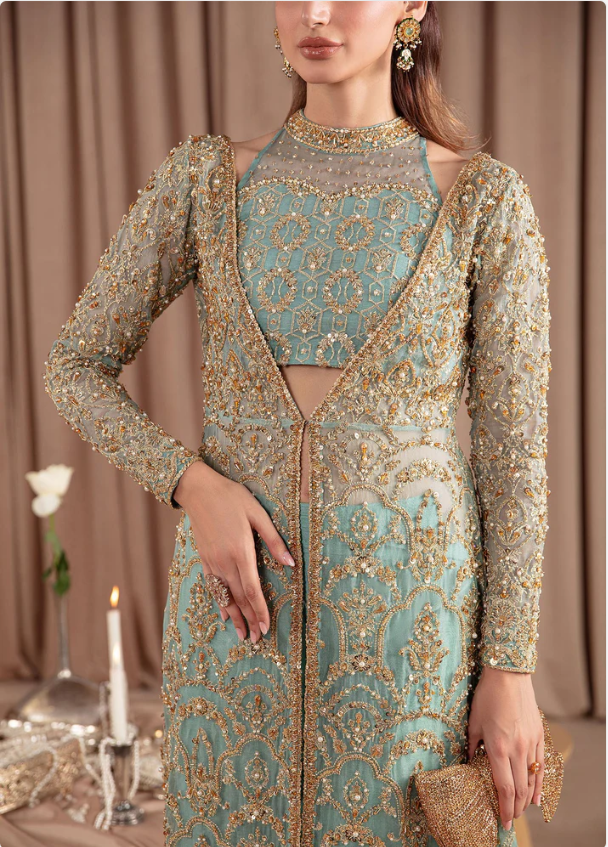 Indulge in pure sophistication with our breathtaking front-open gown, meticulously crafted from exquisite katan organza. This ensemble is more than just attire; it's an embodiment of elegance, blending glamour with unwavering confidence effortlessly. Designed to captivate every eye, it boasts opulent embroidery and exquisite embellishments, each stitch a testament to masterful craftsmanship. The distinctive embroidered bustier at its heart is a marvel of design, sculpting and accentuating the figure with grace and ease. Paired flawlessly with flared trousers adorned with embroidered borders and delicate gold lace detailing, this ensemble radiates timeless beauty and undeniable allure.