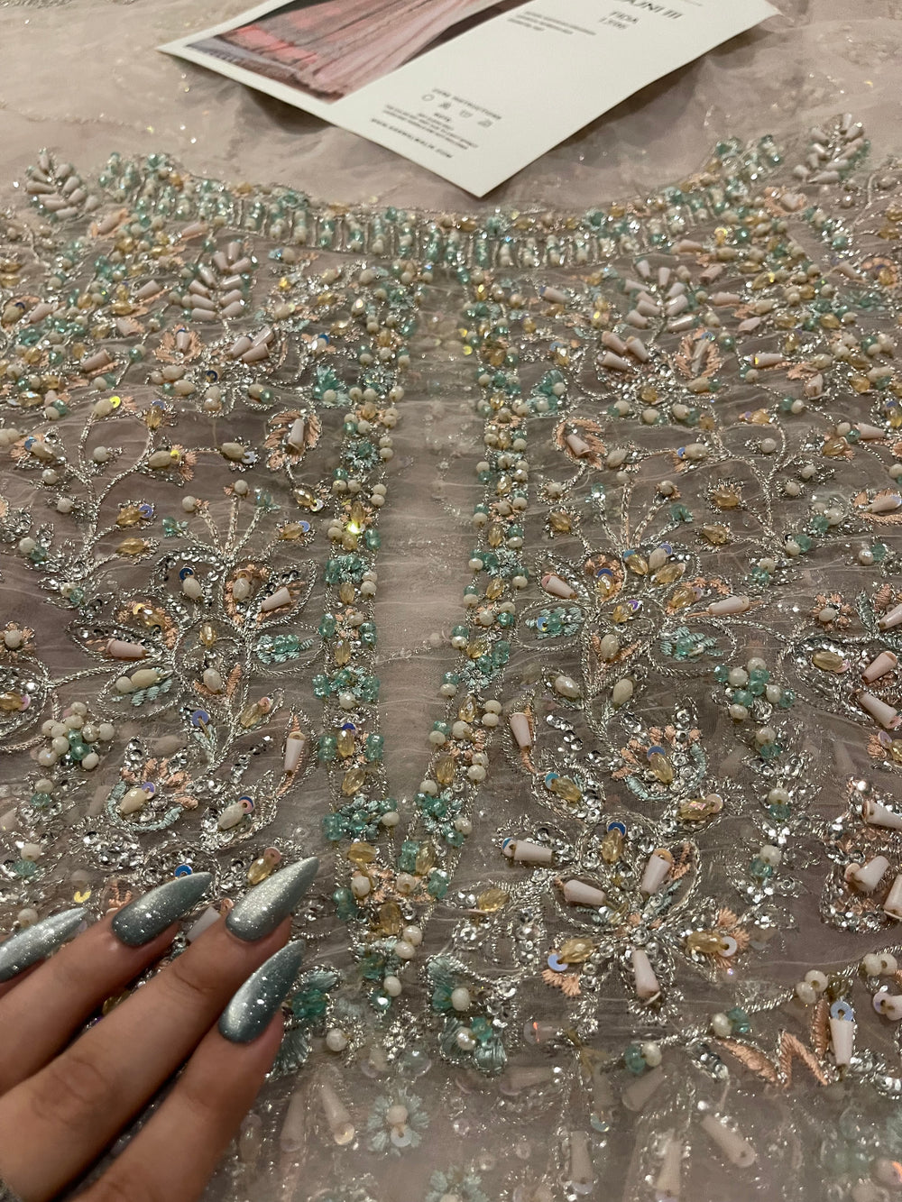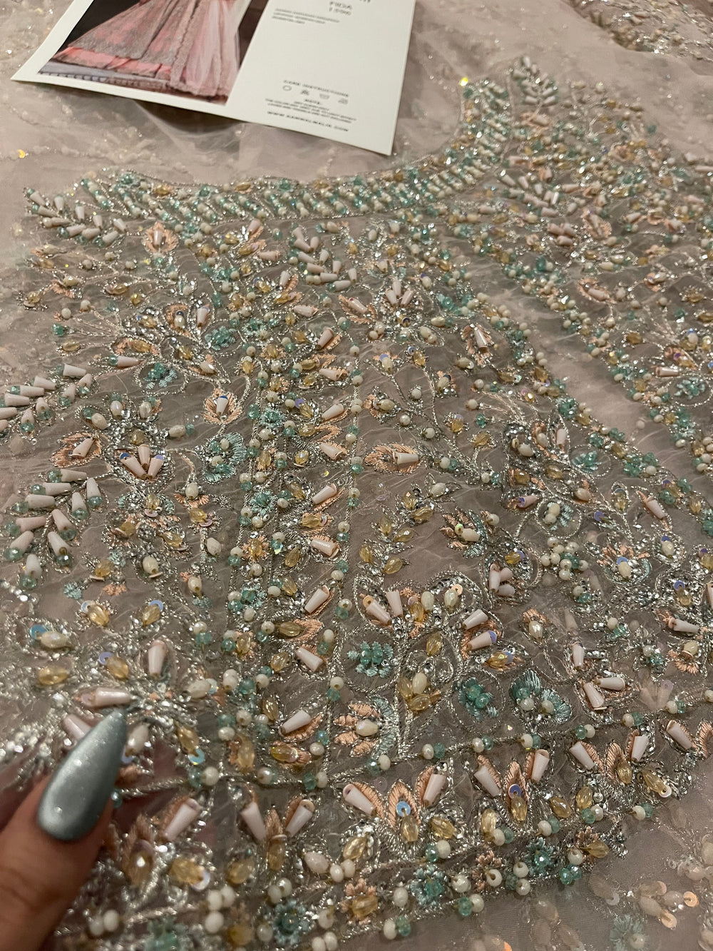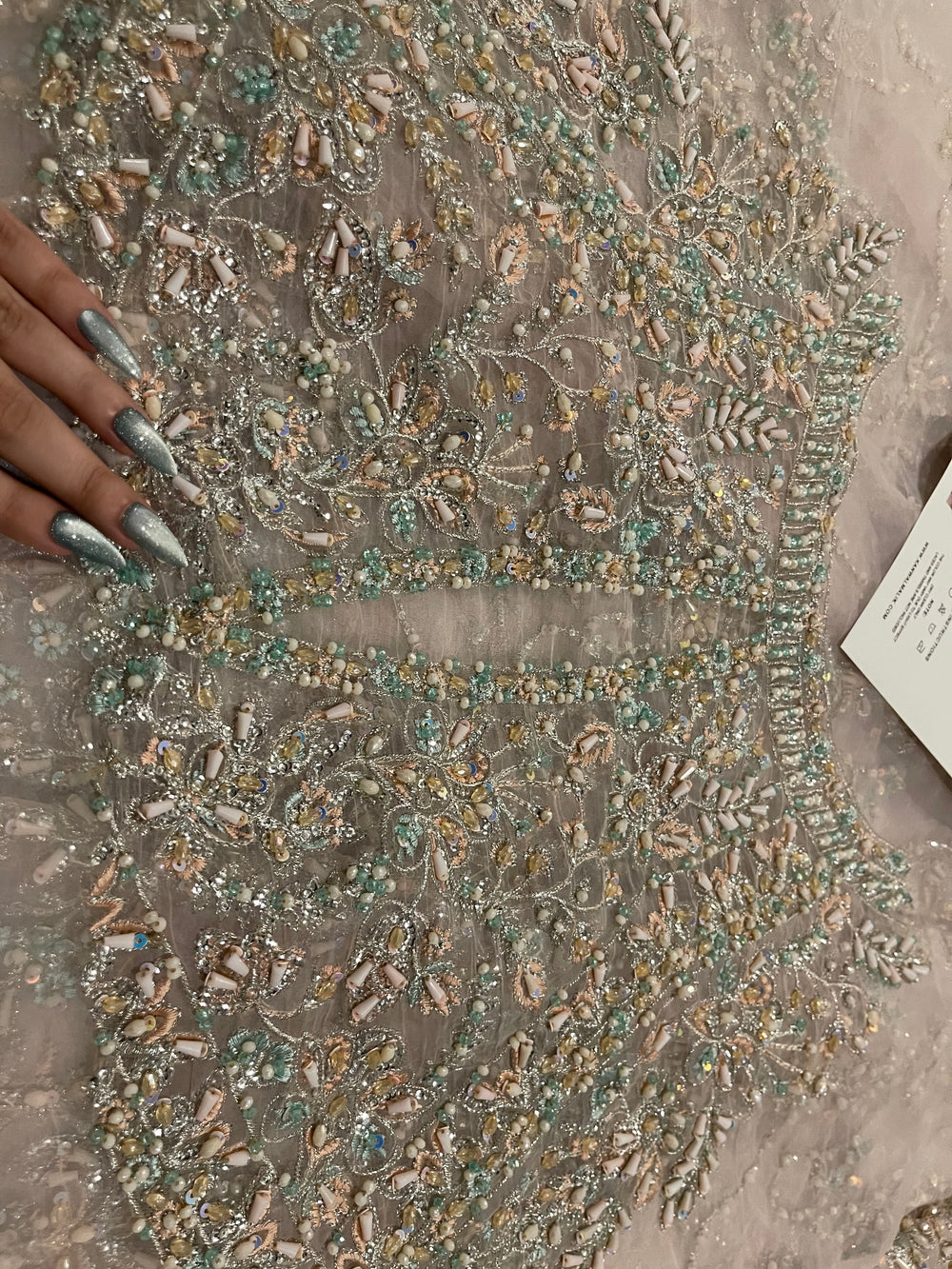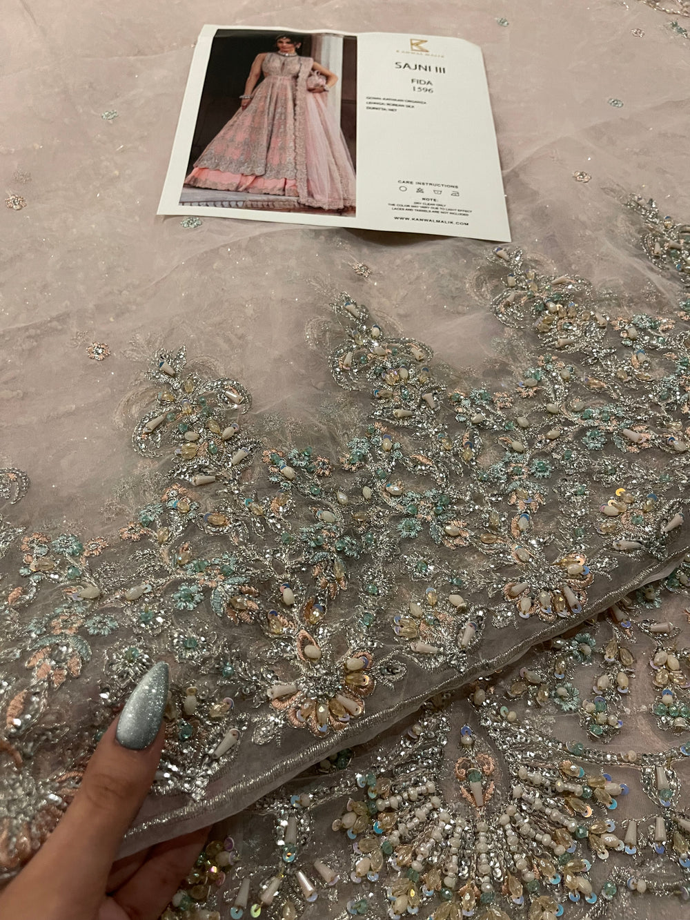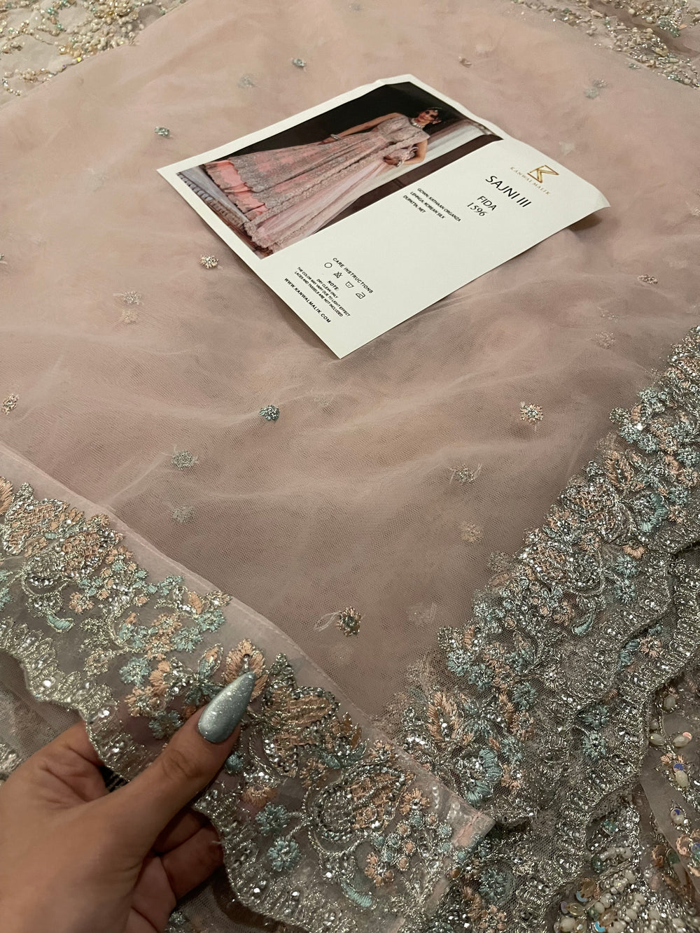 Fida by Kanwal Malik is a breathtaking blush pink (with hints of lilac) ensemble that speaks of refined bridal luxury. Crafted on a soft pastel base, the outfit is adorned with intricate pastel hand embellishment, delicate sequins, and detailed motifs that flow gracefully across the voluminous flare. The bodice features dense, refined work that balances beautifully with the airy movement of the skirt. Finished with a sheer, finely embroidered dupatta, Fida is perfect for engagement ceremonies, nikkah events, or intimate wedding celebrations where soft glamour takes center stage.