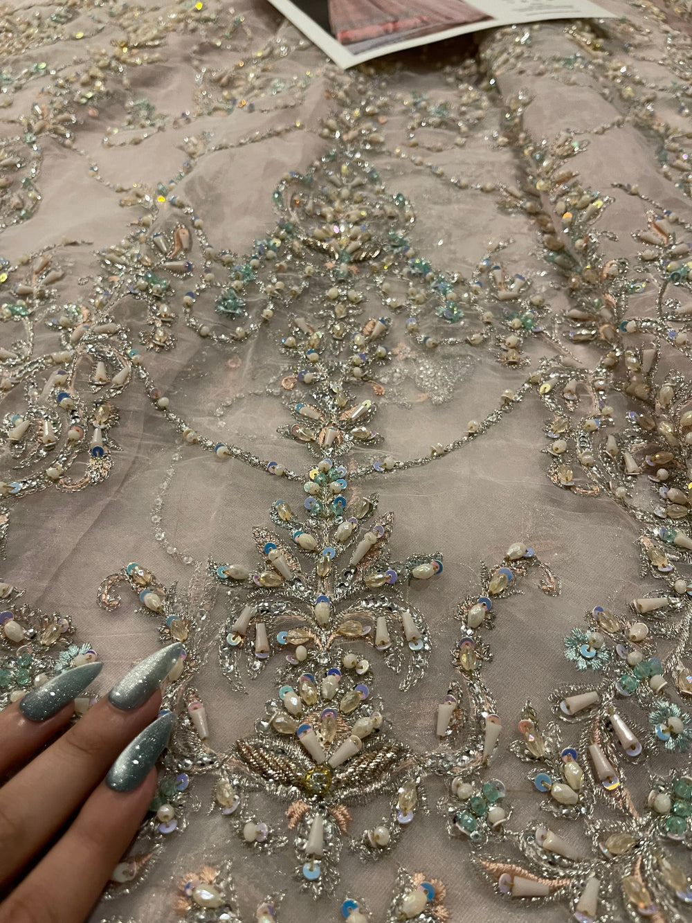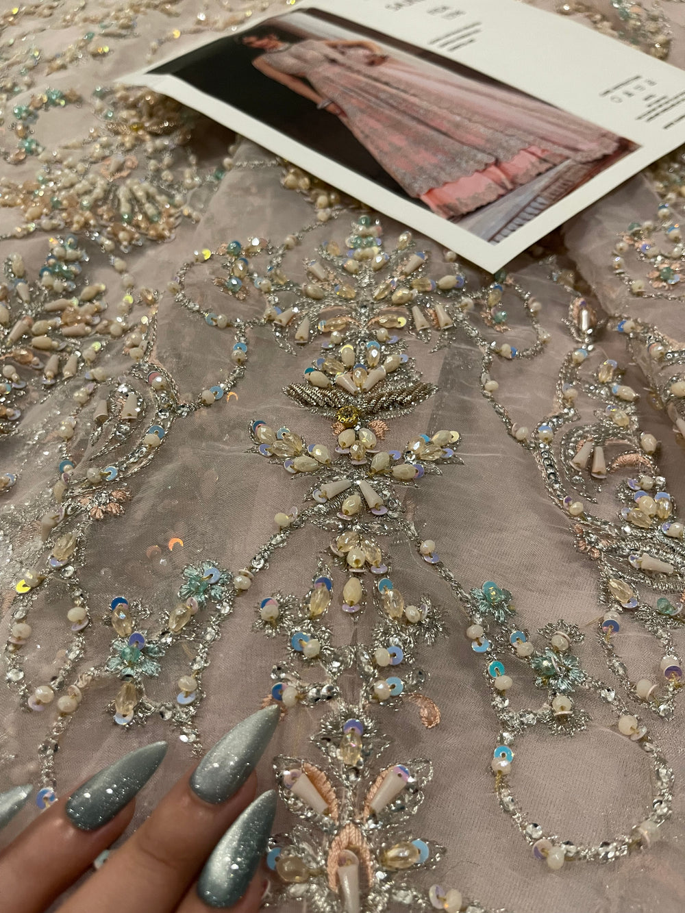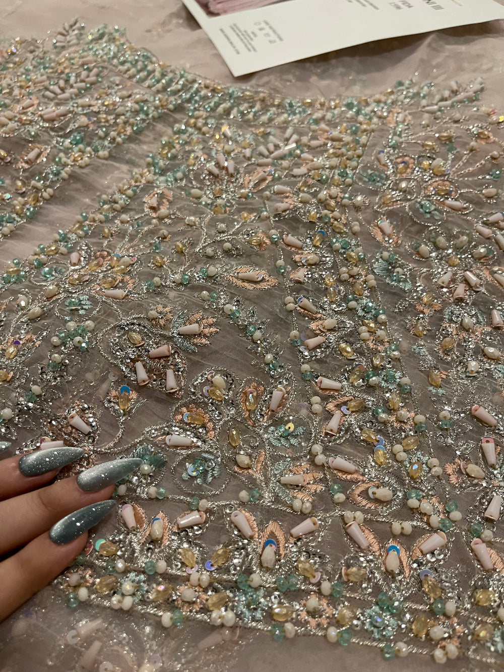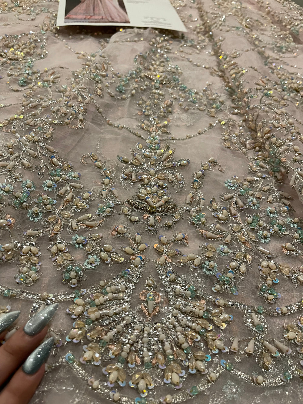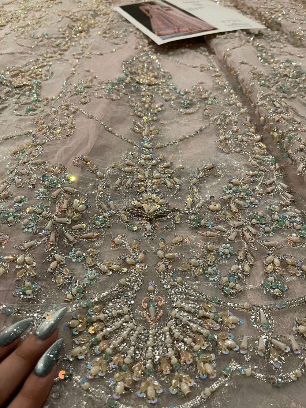Fida by Kanwal Malik is a breathtaking blush pink (with hints of lilac) ensemble that speaks of refined bridal luxury. Crafted on a soft pastel base, the outfit is adorned with intricate pastel hand embellishment, delicate sequins, and detailed motifs that flow gracefully across the voluminous flare. The bodice features dense, refined work that balances beautifully with the airy movement of the skirt. Finished with a sheer, finely embroidered dupatta, Fida is perfect for engagement ceremonies, nikkah events, or intimate wedding celebrations where soft glamour takes center stage.