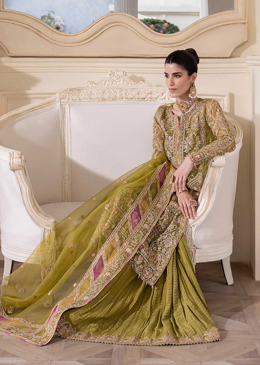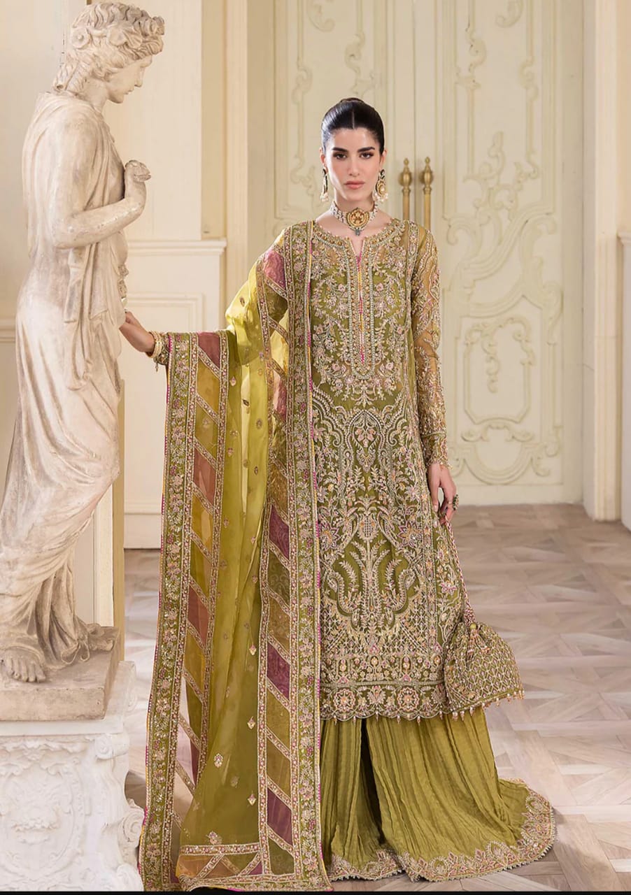 This front open organza gown in shades of lavender fill with embroidery and embellishment throughout is stunningly gorgeous. Adding to the ensemble's allure is the organza dupatta, adorned with exquisite floral embroidered bunches that cascade gracefully down its length. The delicate embroidery adds texture and dimension to the dupatta, while the two-tone border enhances its beauty and elegance. the dupatta adds a touch of romantic charm to the ensemble. This ensemble is worn with flared trousers.