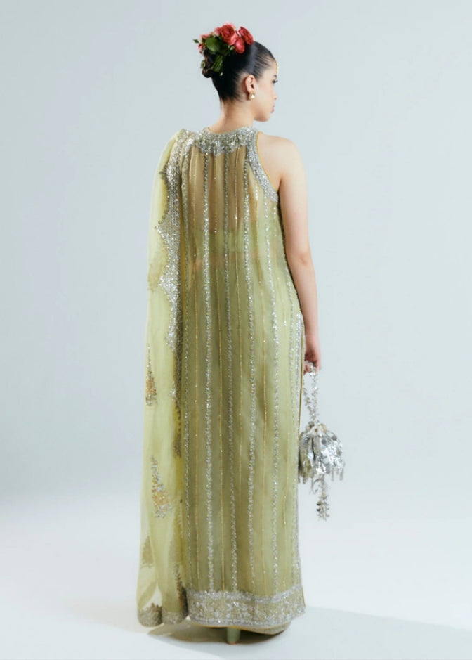 This regal outfit rendered in a beautiful shade of mint green on an organza canvas for shirt and Raw-silk plazzo Shalwar to add the fusion touch to the contemporary shirt, with heavy embellished motifs along with intricate details. The timeless look is completed with an organza dupatta along with four side heavy embellished borders with spray motifs embellished with sequins, cut dana and with nakashi, dabka concluding the look marvellously.