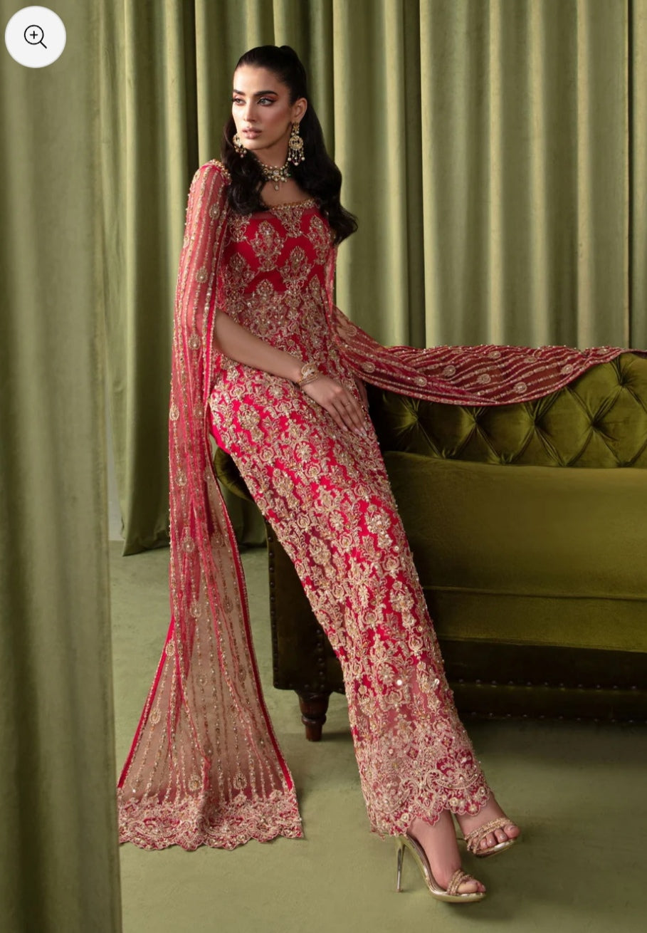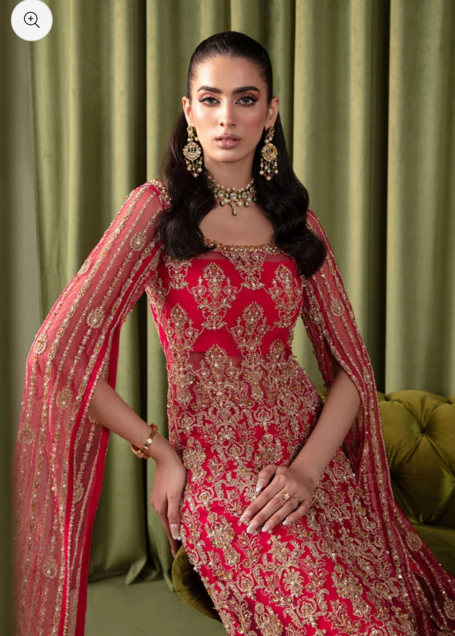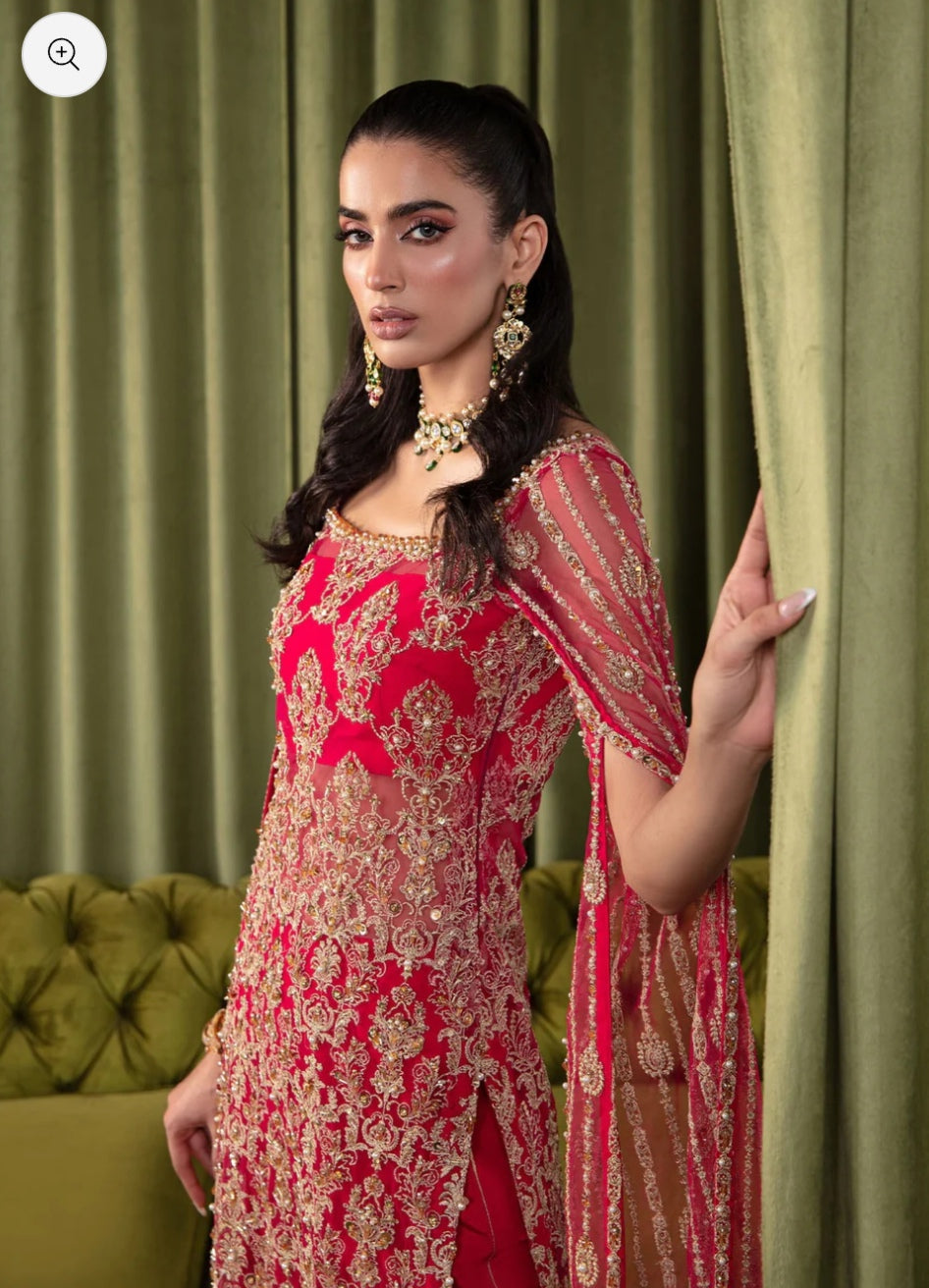 Embark on a journey to an enchanted realm with this ethereal ensemble, a fusion of fairy-like perfection and timeless elegance. Imagine a mesmerizing shocking pink long shirt adorned with intricate silvery lined motifs and a delicately scalloped hem, each detail crafted to captivate and charm. Picture cascading sequins, lustrous pearls, and glistening crystals adorning the fabric, creating a mesmerizing display of light and movement with every step you take. Completing this captivating look are cigarette pants in a complementary cherry hue, boasting side seam details that add a touch of sophistication and cohesion to the ensemble. Step into the spotlight and let your inner fairy shine with this exquisite ensemble, a testament to the boundless beauty of imagination and the enduring power of elegance.