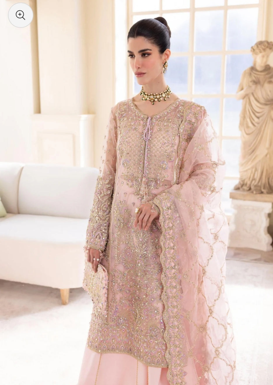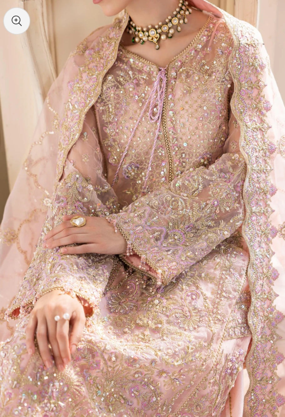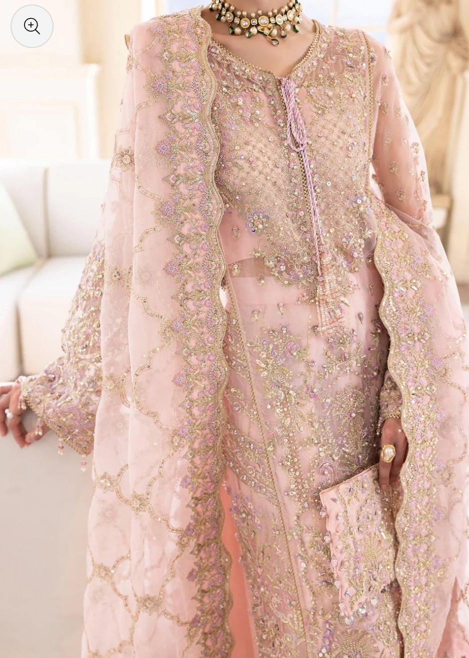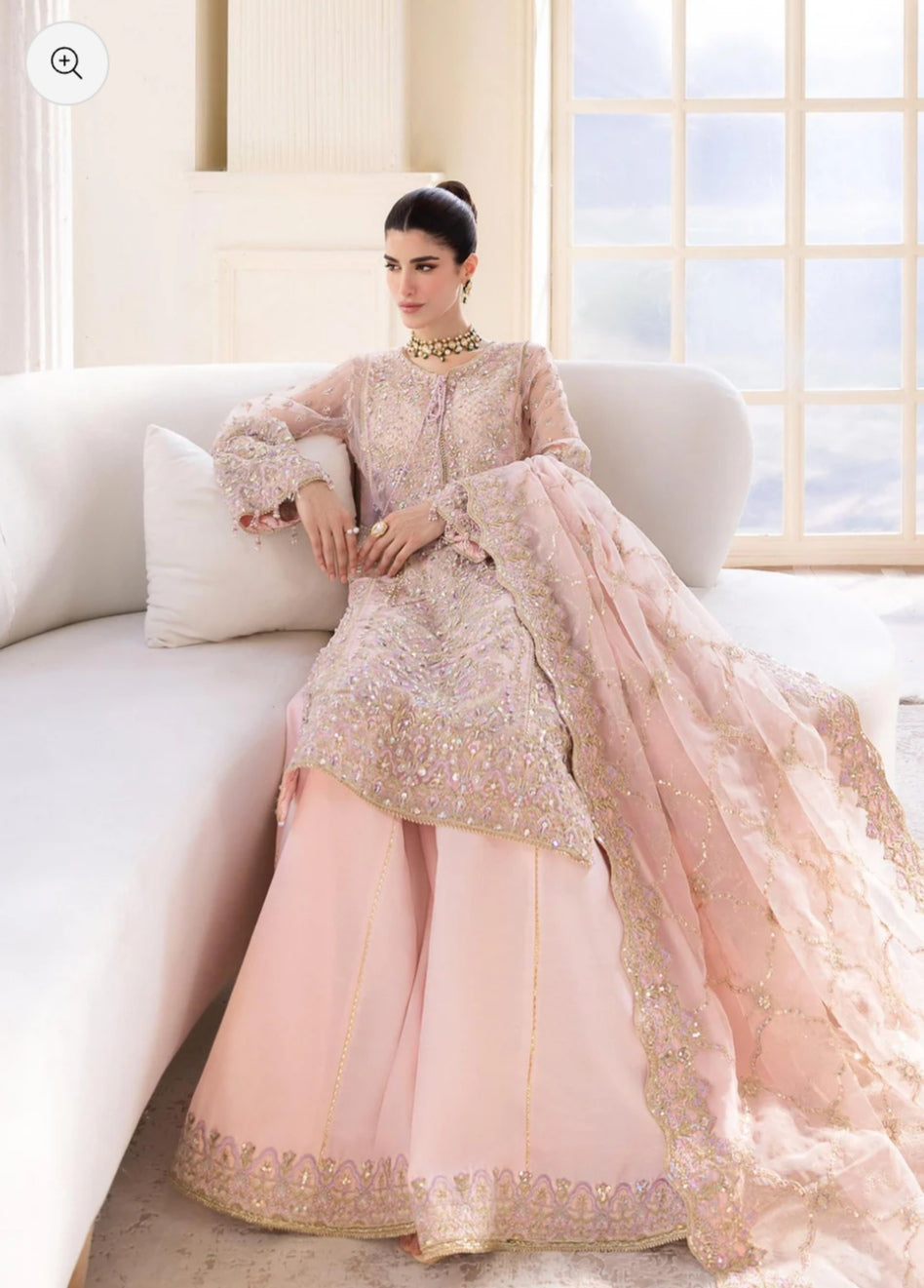 Capture the essence of elegance with this exquisite ensemble featuring a pink embroidered mid length shirt perfectly paired with panel flared pants with border on bottom. The intricate embellishment and crystals adorning the shirt adds a touch of charm, while the delicate pink hue radiates femininity and grace. Complementing the ensemble with fully embroidered dupatta, adorned with intricate repeated pattern designs that enhance its beauty.. Every inch of the dupatta is adorned with exquisite embroidery, showcasing intricate patterns and motifs that add depth and dimension to the overall look. The four-side border enhances the elegance of the dupatta, framing the ensemble beautifully and adding a touch of beauty.