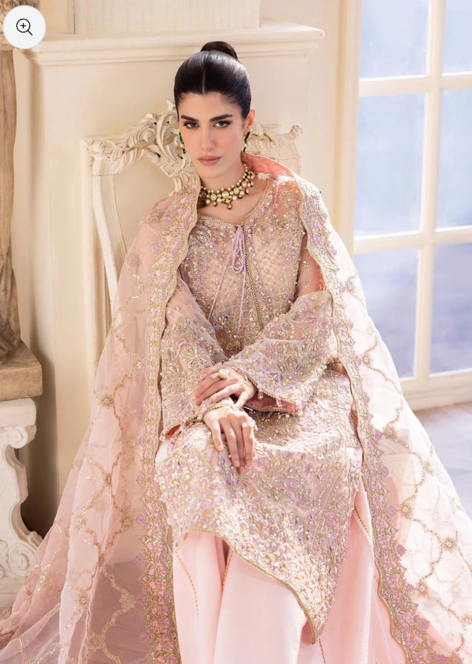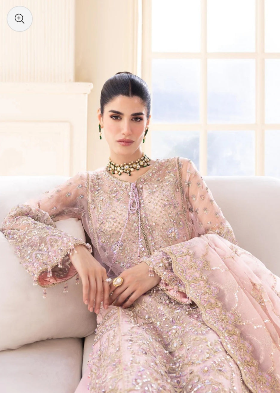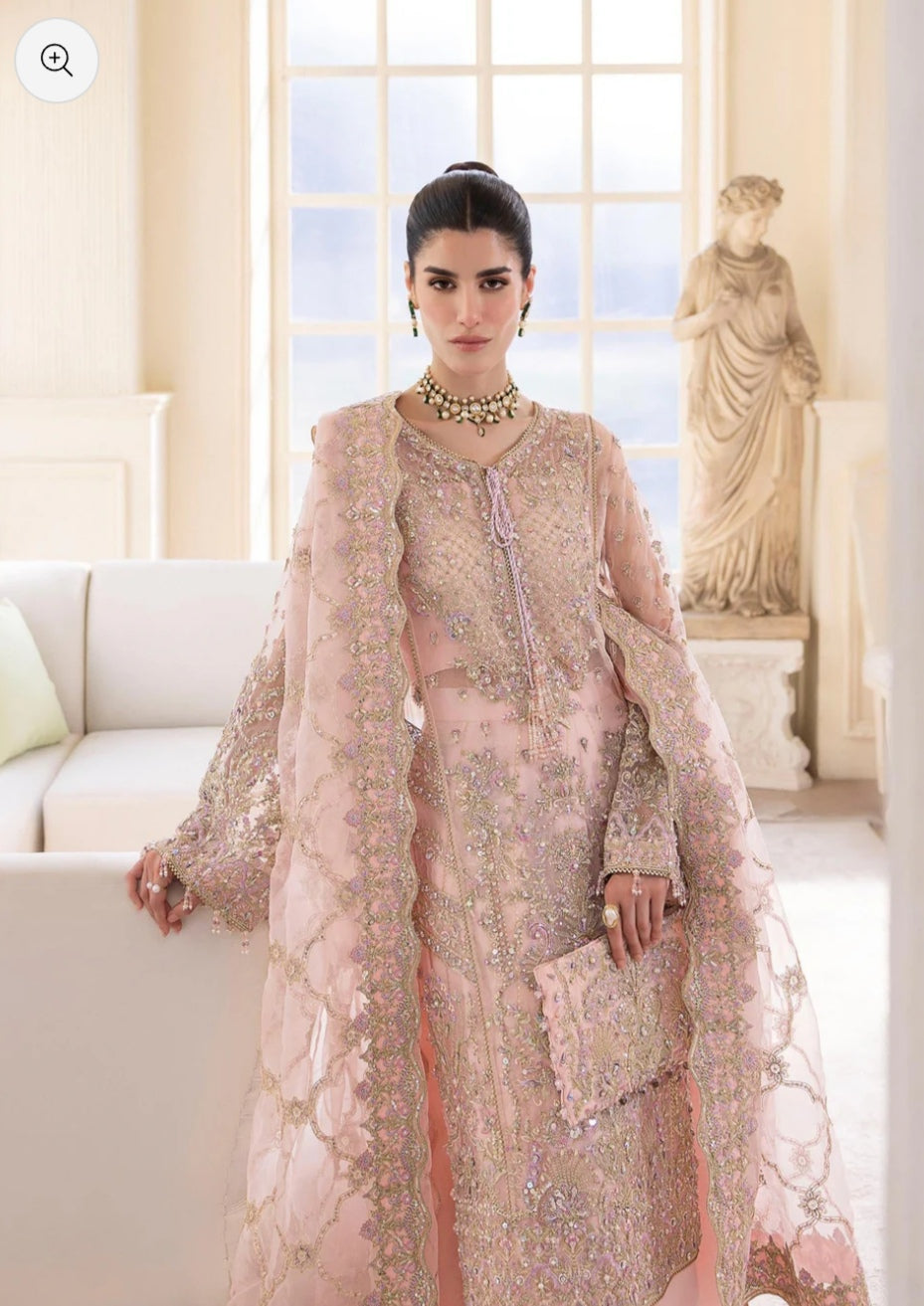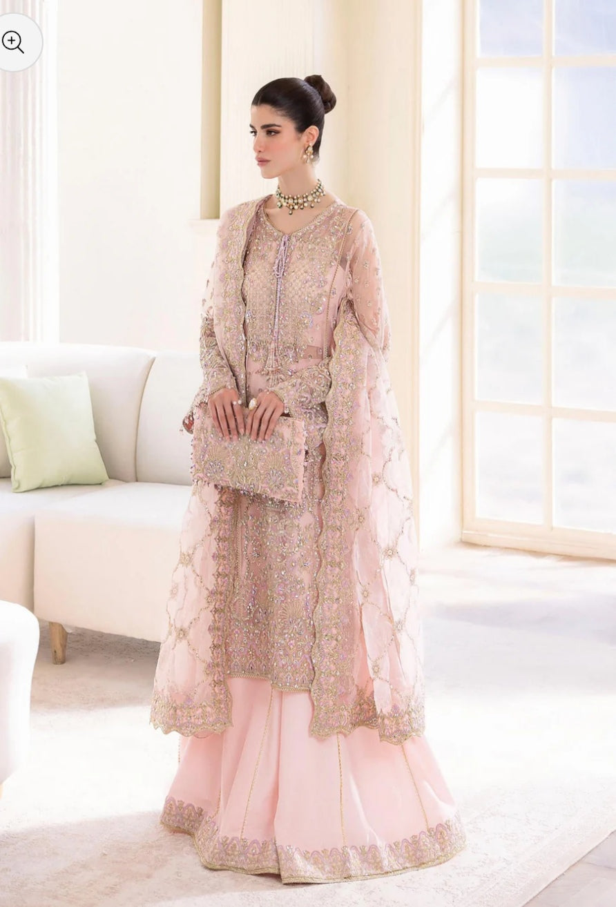 Capture the essence of elegance with this exquisite ensemble featuring a pink embroidered mid length shirt perfectly paired with panel flared pants with border on bottom. The intricate embellishment and crystals adorning the shirt adds a touch of charm, while the delicate pink hue radiates femininity and grace. Complementing the ensemble with fully embroidered dupatta, adorned with intricate repeated pattern designs that enhance its beauty.. Every inch of the dupatta is adorned with exquisite embroidery, showcasing intricate patterns and motifs that add depth and dimension to the overall look. The four-side border enhances the elegance of the dupatta, framing the ensemble beautifully and adding a touch of beauty.