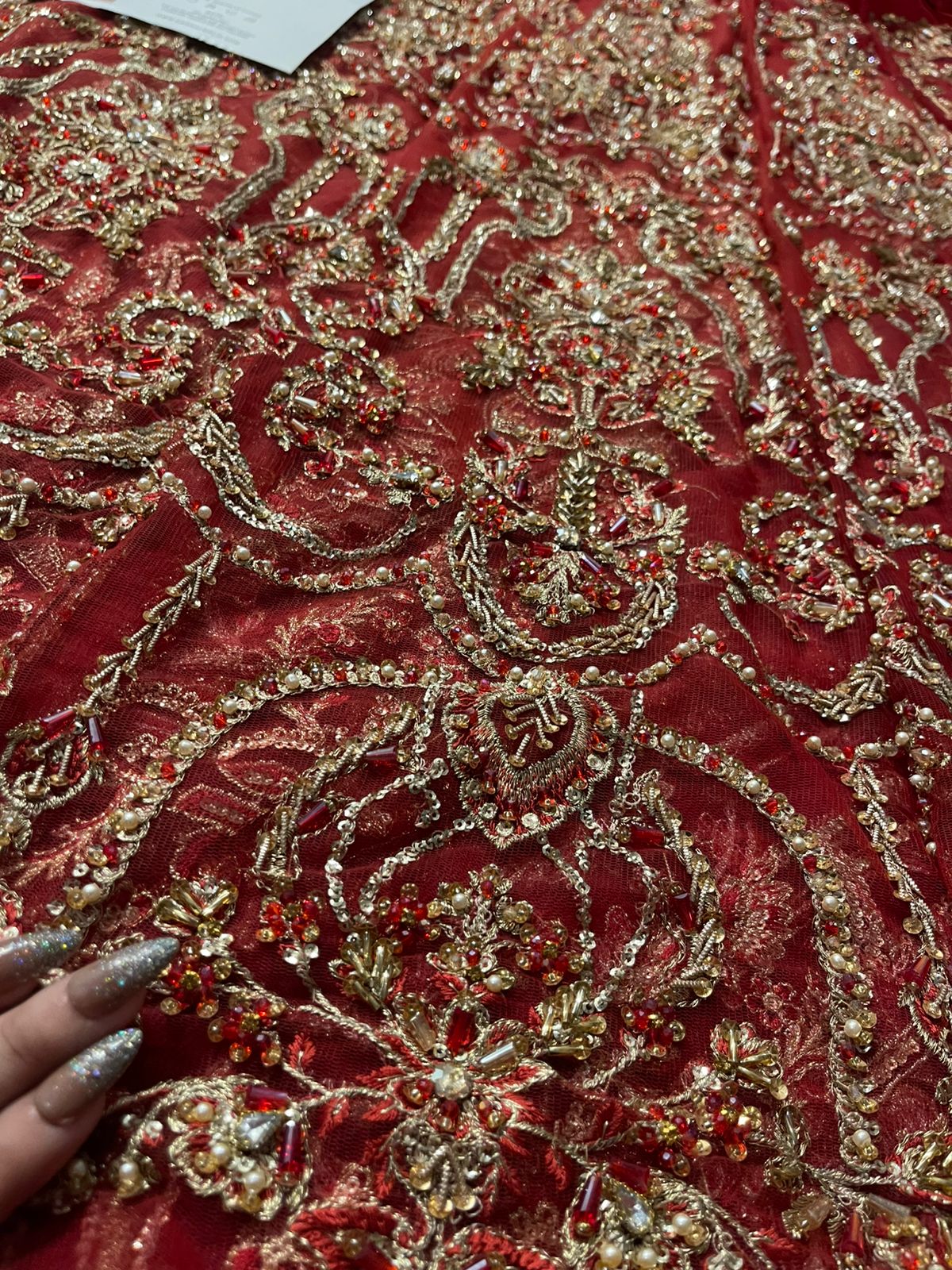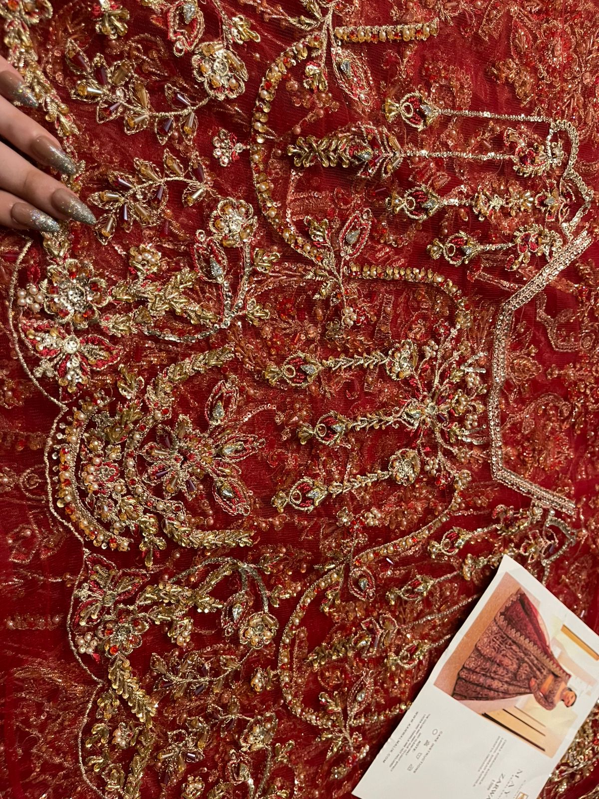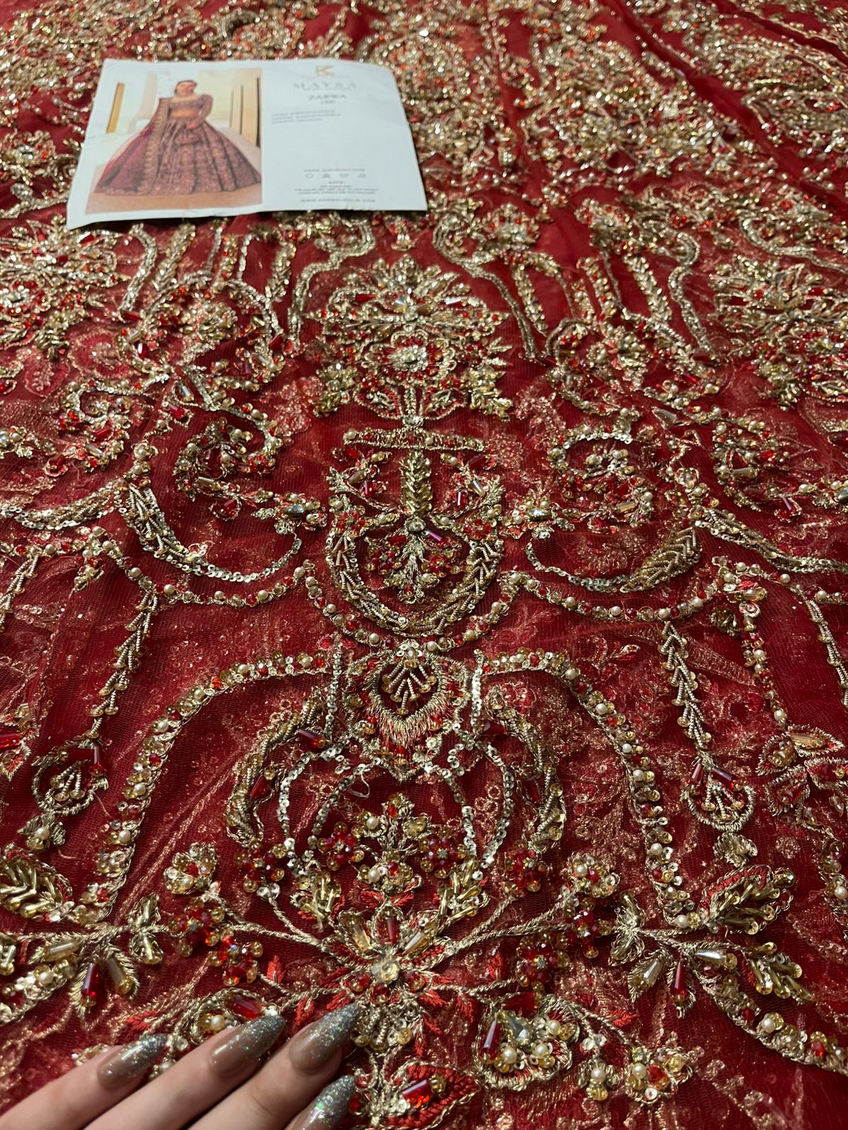 The Zarwa bridal lehenga choli from Maysa Bridal Couture's '24 Collection is a stunning blend of luxury and sophistication. Crafted in a rich, deep red fabric, this masterpiece is adorned with intricate golden embellishments that radiate opulence. The delicate crystal work, combined with elegant dabka and cut dana embroidery, creates a mesmerizing effect that enhances the overall allure of the ensemble. The lehenga's voluminous silhouette, paired with the choli's fitted form, offers a graceful balance of grandeur and modern elegance. Zarwal is a perfect choice for the bride seeking a luxurious, unforgettable look on her special day.