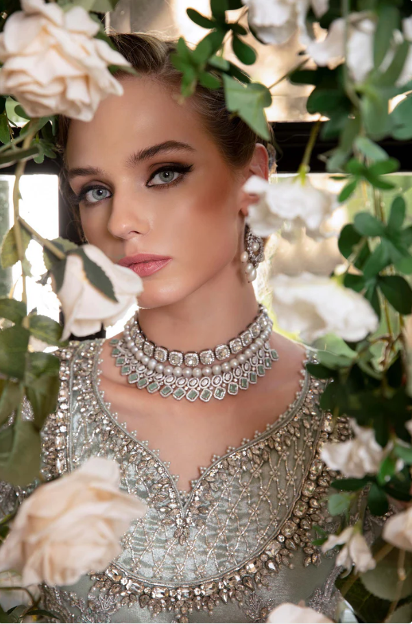 Abundant greens of the forest interspersed with the diverse floras and fauna make our ‘CHANTREA’ gown set an enchanting ensemble. It is crafted for timeless celebrations with gleaming details of 3D florals, sprinkles of mukesh, and luxurious hand embellishments that effortlessly add grace to your look.
