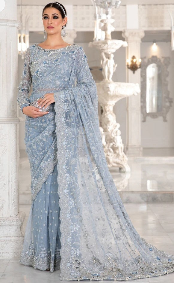 The Maria B. Couture Ice Blue MC-049 is a luxurious formal dress featuring intricate embroidery and embellishments on a soft, ice blue fabric. This elegant ensemble combines traditional craftsmanship with contemporary design, making it perfect for special occasions or weddings. The outfit is crafted from high-quality fabrics, with delicate handwork that adds a touch of opulence and sophistication to the look.