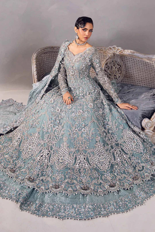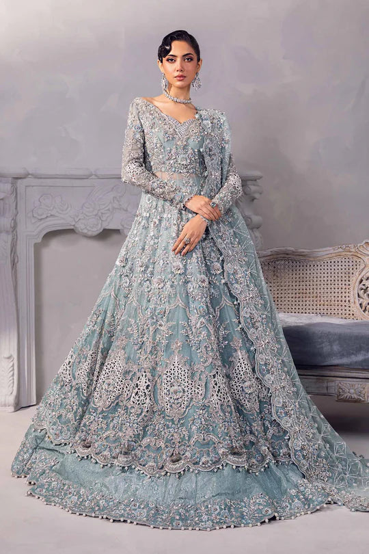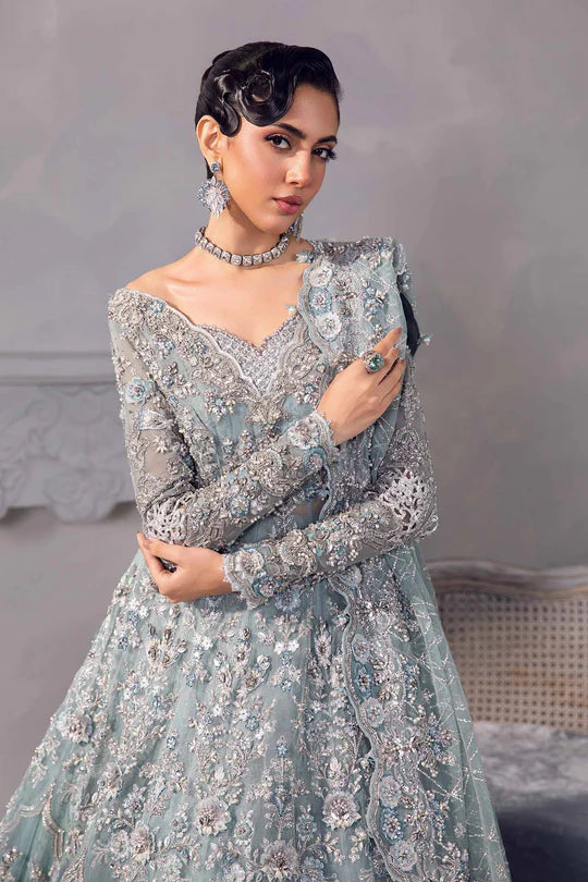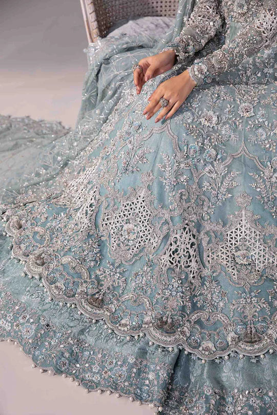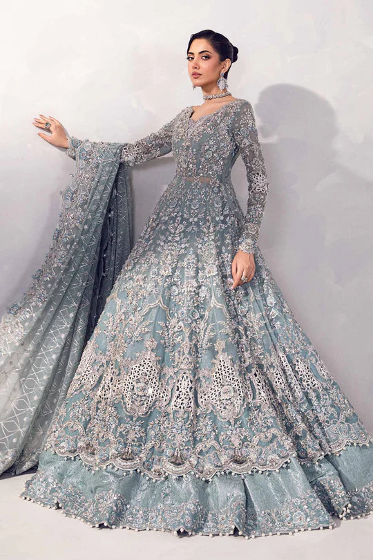 Fayruz' is a poetic symphony of meticulous craftsmanship - Weaving timeless allure with ethereal 3D floral work from expressions of glistening stones, crystals, pearls & cut dana that embody a living poem of grace. Designed in French patterns, this masterpiece is perfect to grace nikah & walima look.