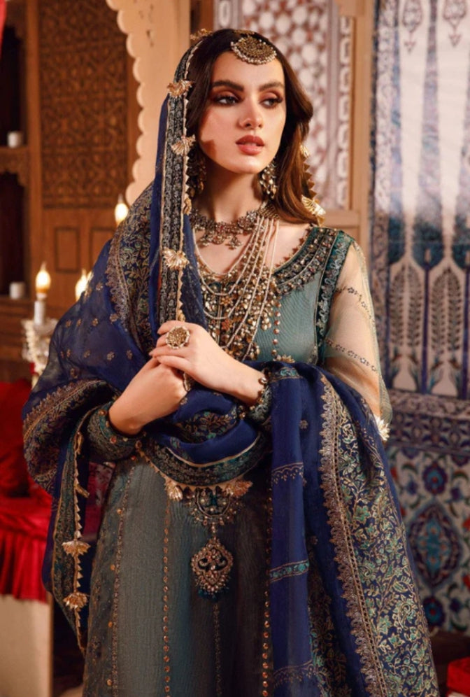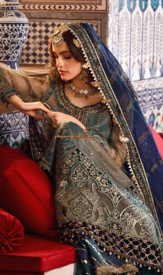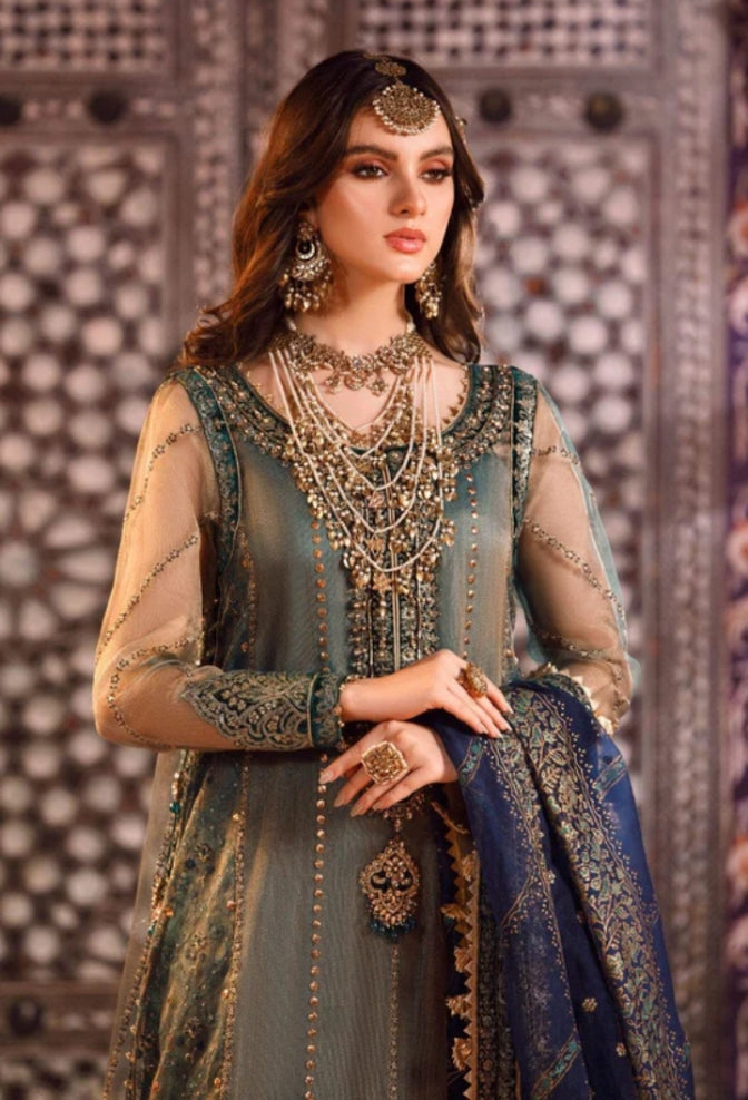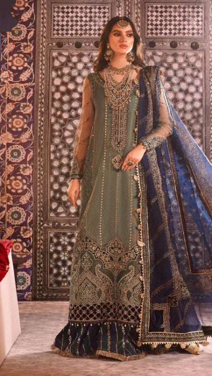 Embroidered Zari Net Ghera Front with Laser Applique WorkEmbroidered Hand Embellished Velvet NecklineEmbroidered Velvet Ghera Lace Front...