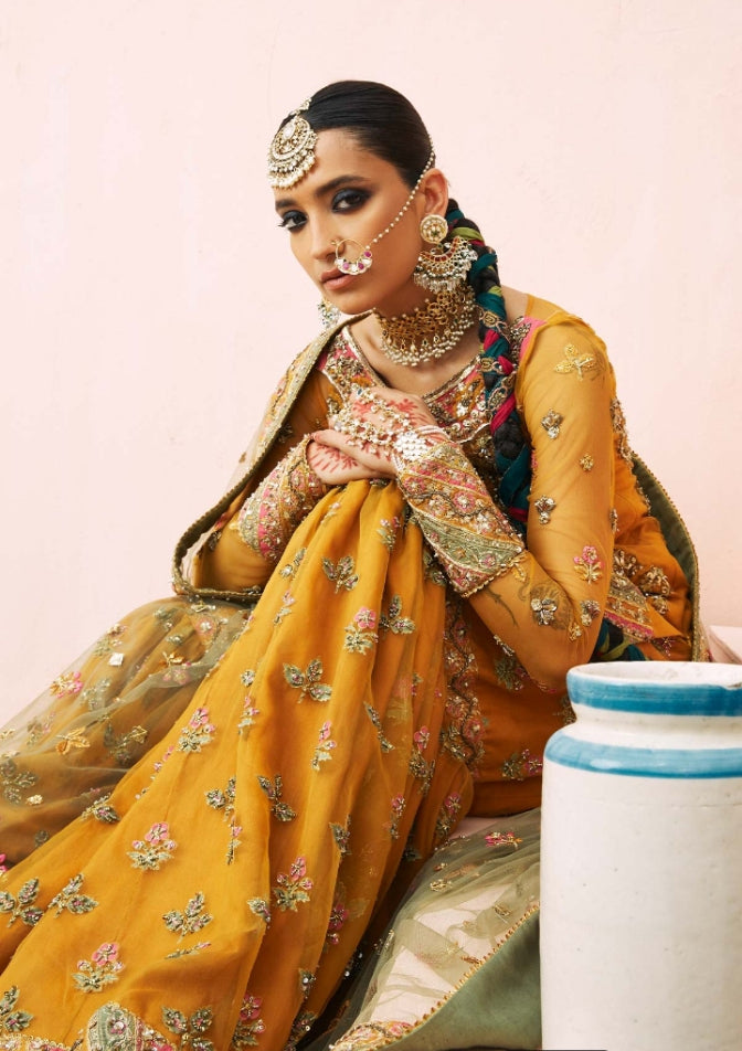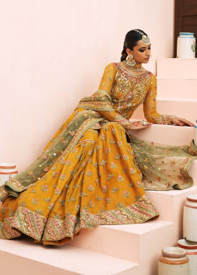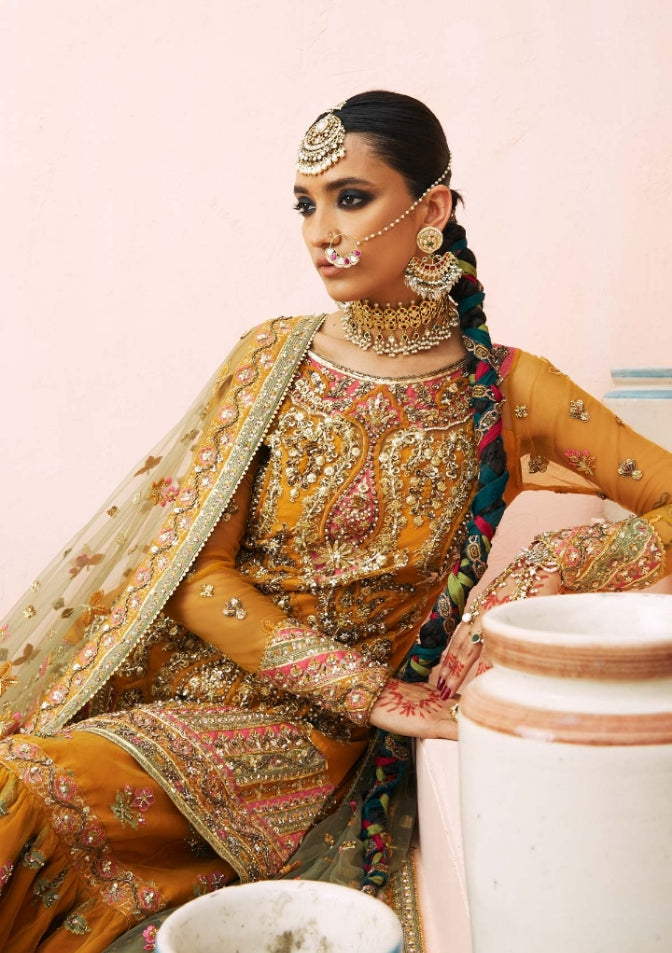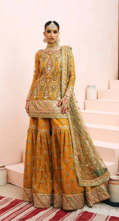 Rendered Mustard Garara Shirt crafted in exquisite and embellished details. it is heavily embellished with zardozi, sequins, gotta,nakshi & resham work, it is paired with Net Dupatta is embellished with Gotta, multicolors of resham, sequin & dabga, with chatapatti finishing.