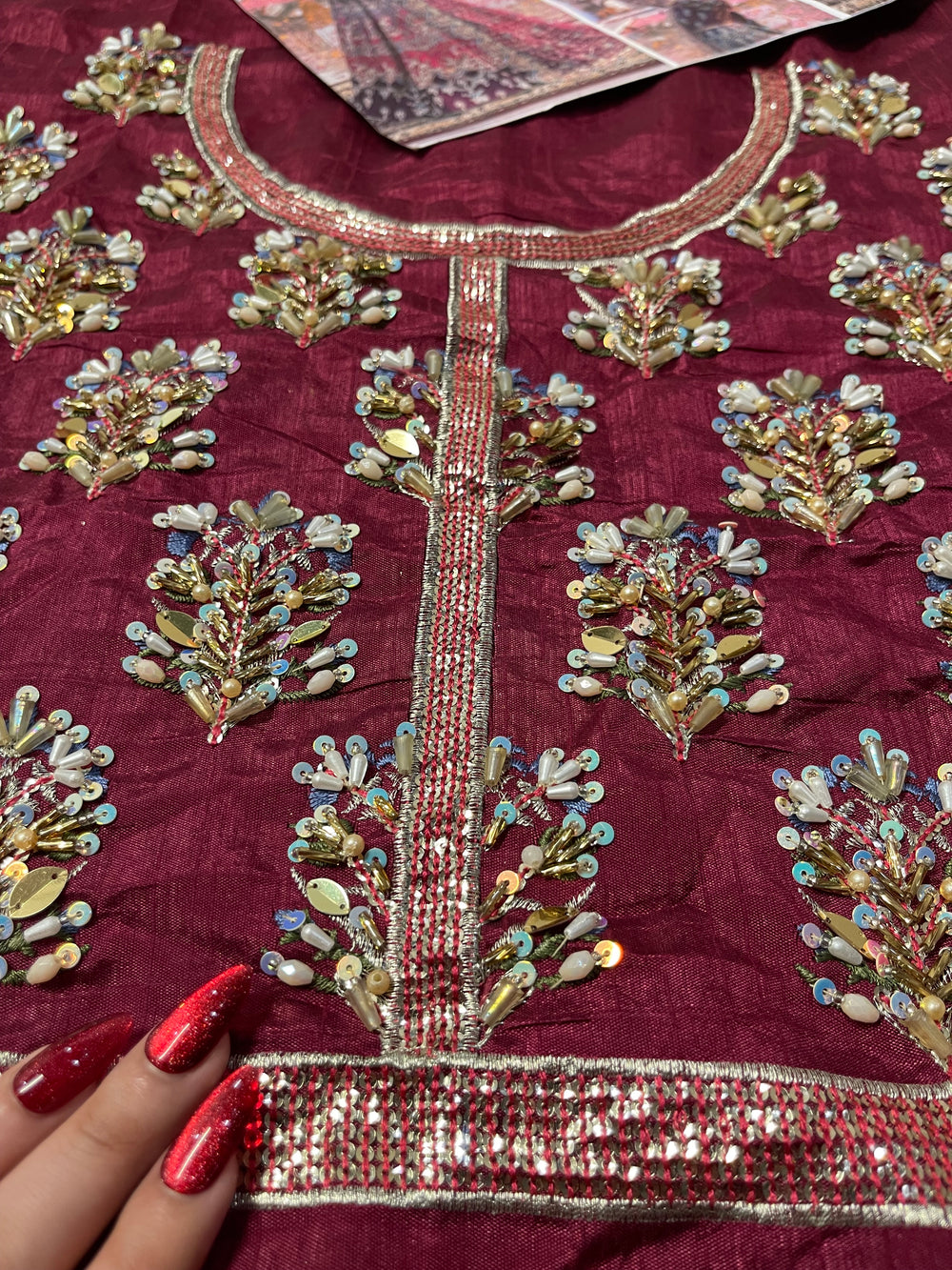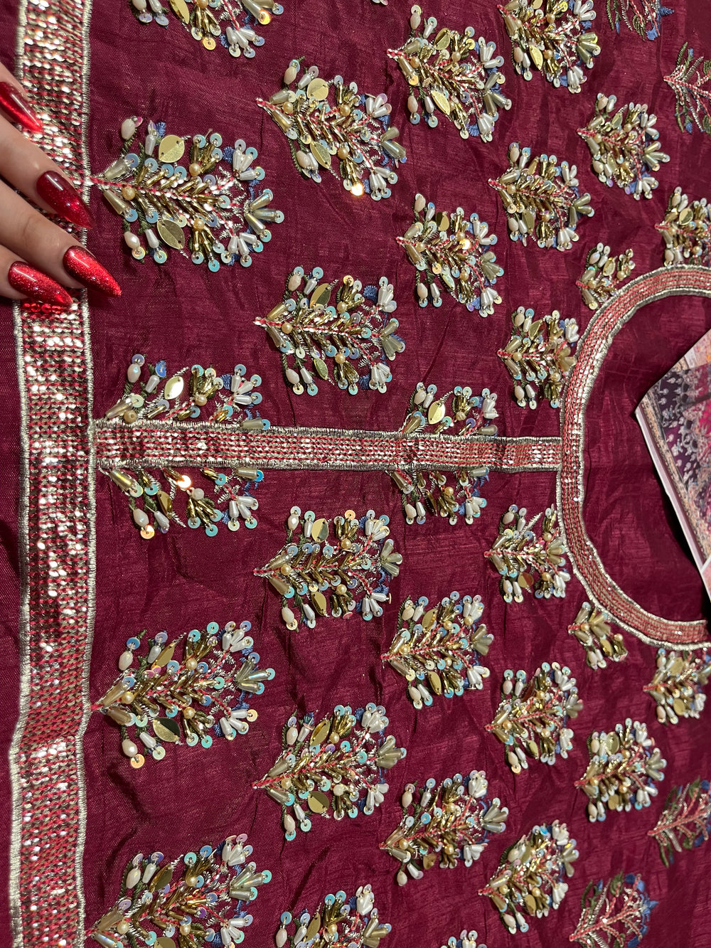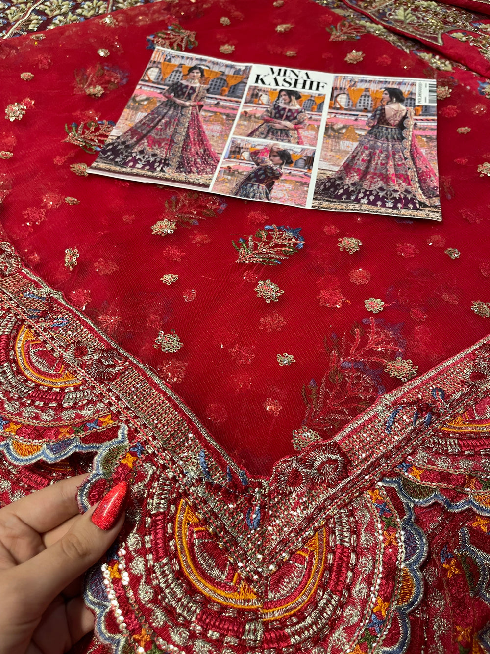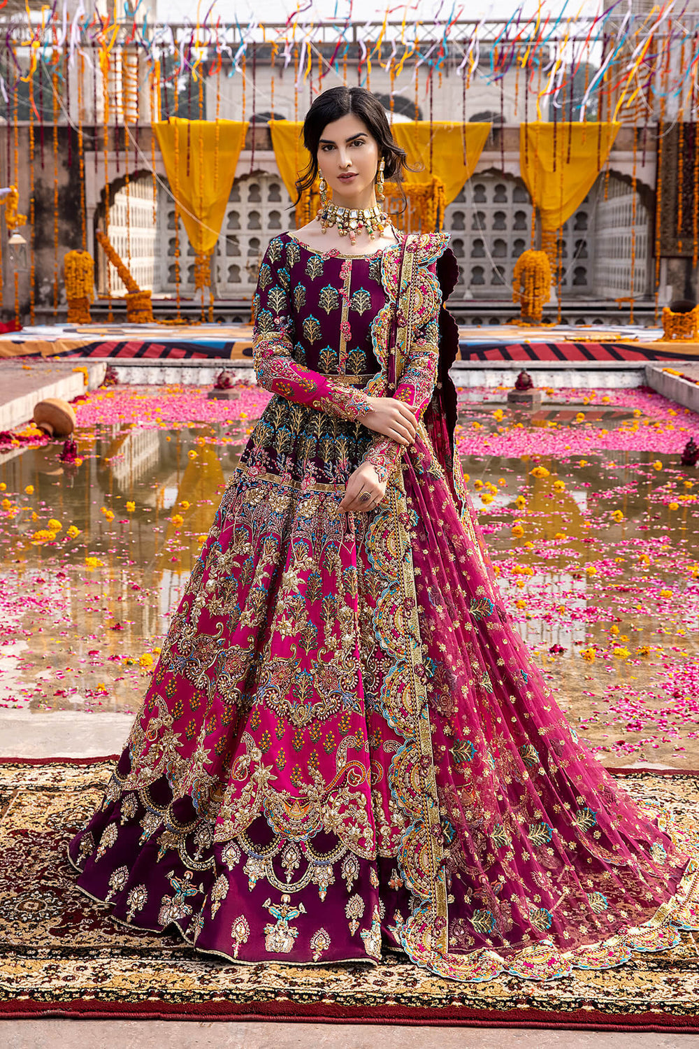 Inspired by the beautiful “Mahrosh” ensemble by Mina Kashif, this striking outfit showcases a rich magenta base accented with deep purple tones that create a stunning colour contrast. The fabric is adorned with intricate multi colored embroidery arranged in elegant traditional motifs, giving the ensemble a vibrant and festive character. Paired with a delicately embroidered dupatta and ornate borders, the design flows gracefully with detailed craftsmanship throughout. With its bold colours and festive detailing, this ensemble is a perfect choice for Mehndi, Dholki, and Mayoun celebrations, making it ideal for lively wedding festivities.