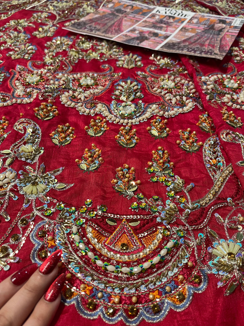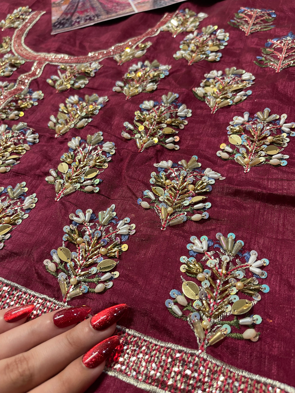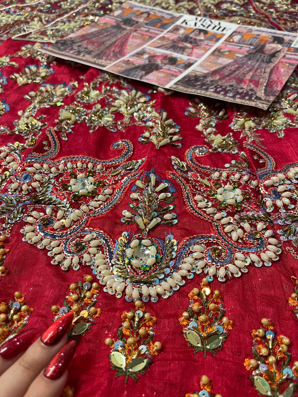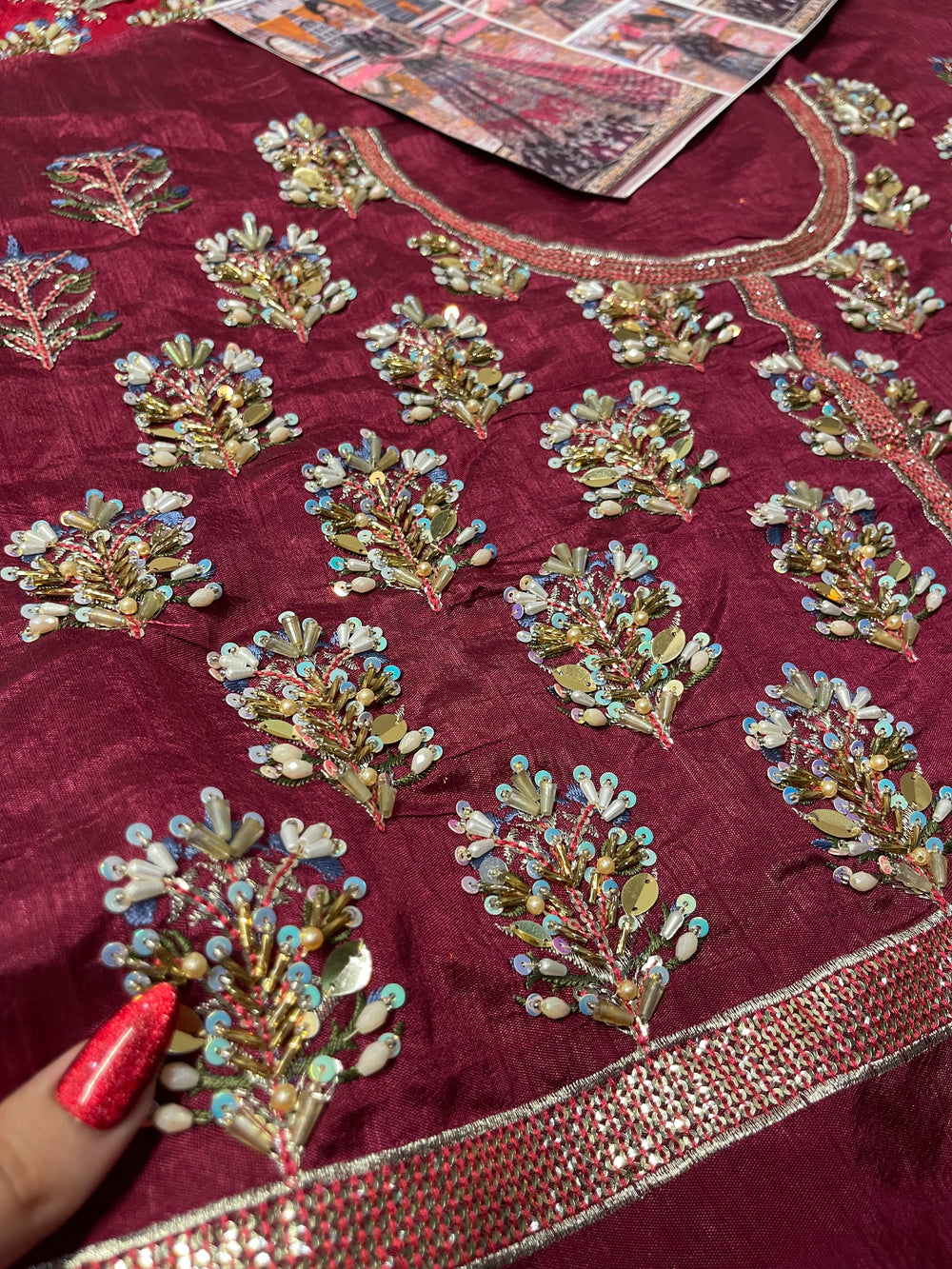 Inspired by the beautiful “Mahrosh” ensemble by Mina Kashif, this striking outfit showcases a rich magenta base accented with deep purple tones that create a stunning colour contrast. The fabric is adorned with intricate multi colored embroidery arranged in elegant traditional motifs, giving the ensemble a vibrant and festive character. Paired with a delicately embroidered dupatta and ornate borders, the design flows gracefully with detailed craftsmanship throughout. With its bold colours and festive detailing, this ensemble is a perfect choice for Mehndi, Dholki, and Mayoun celebrations, making it ideal for lively wedding festivities.