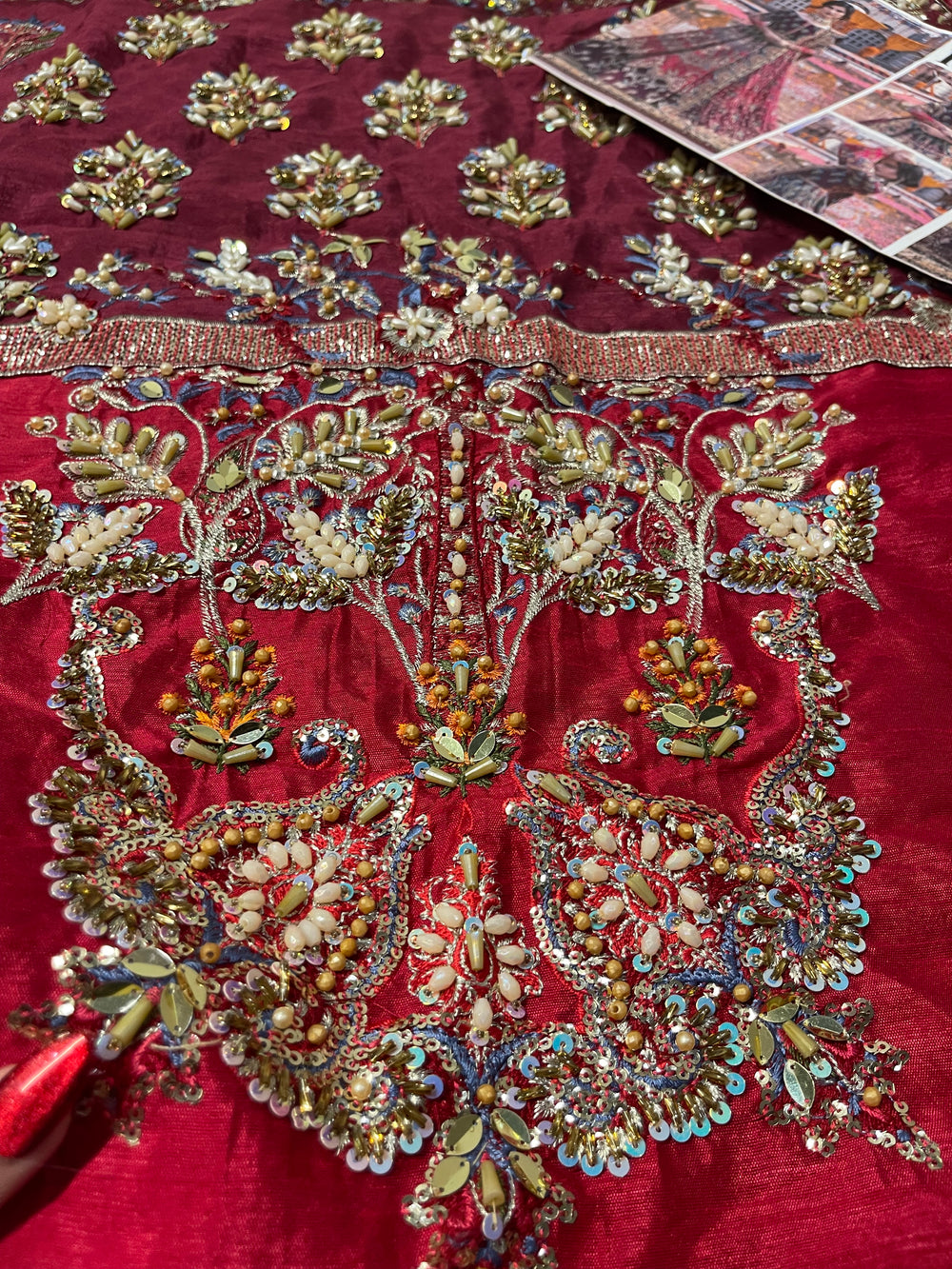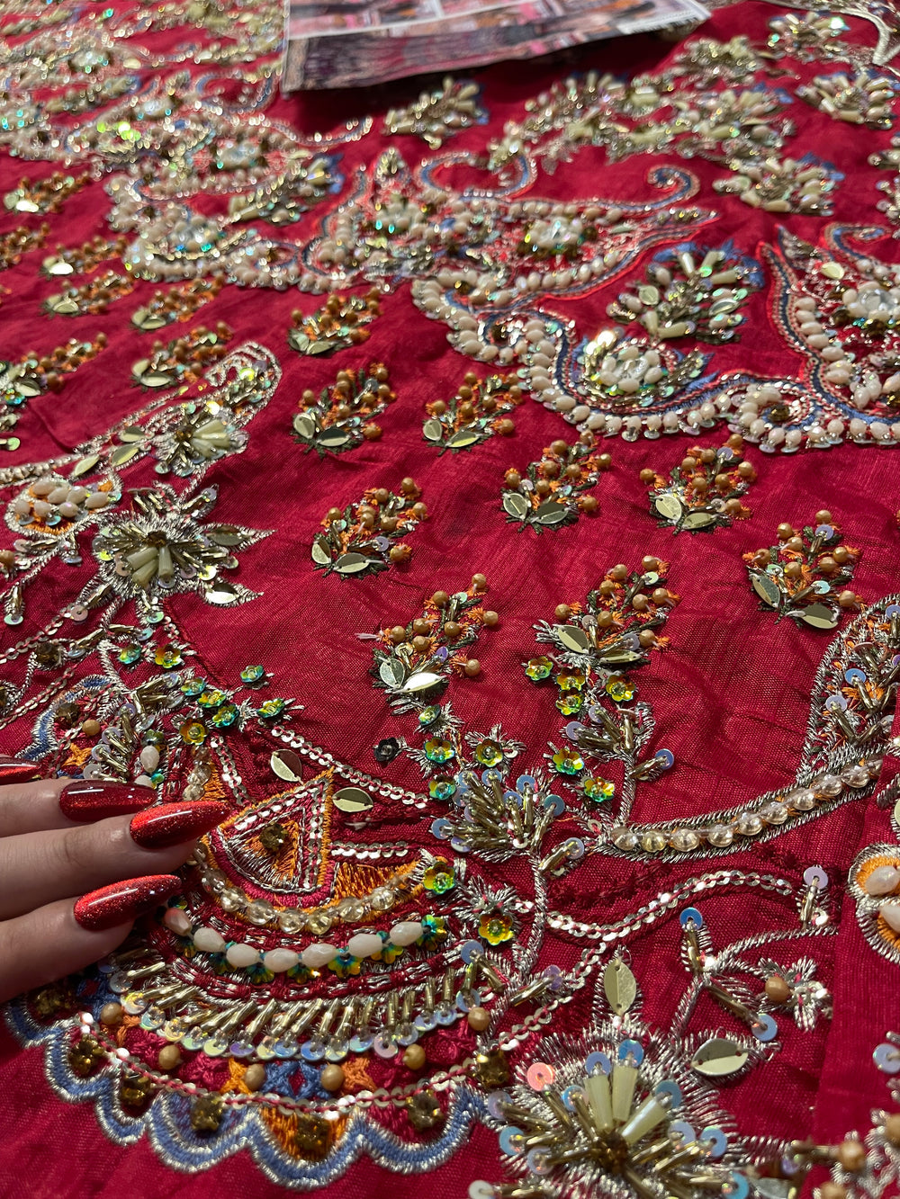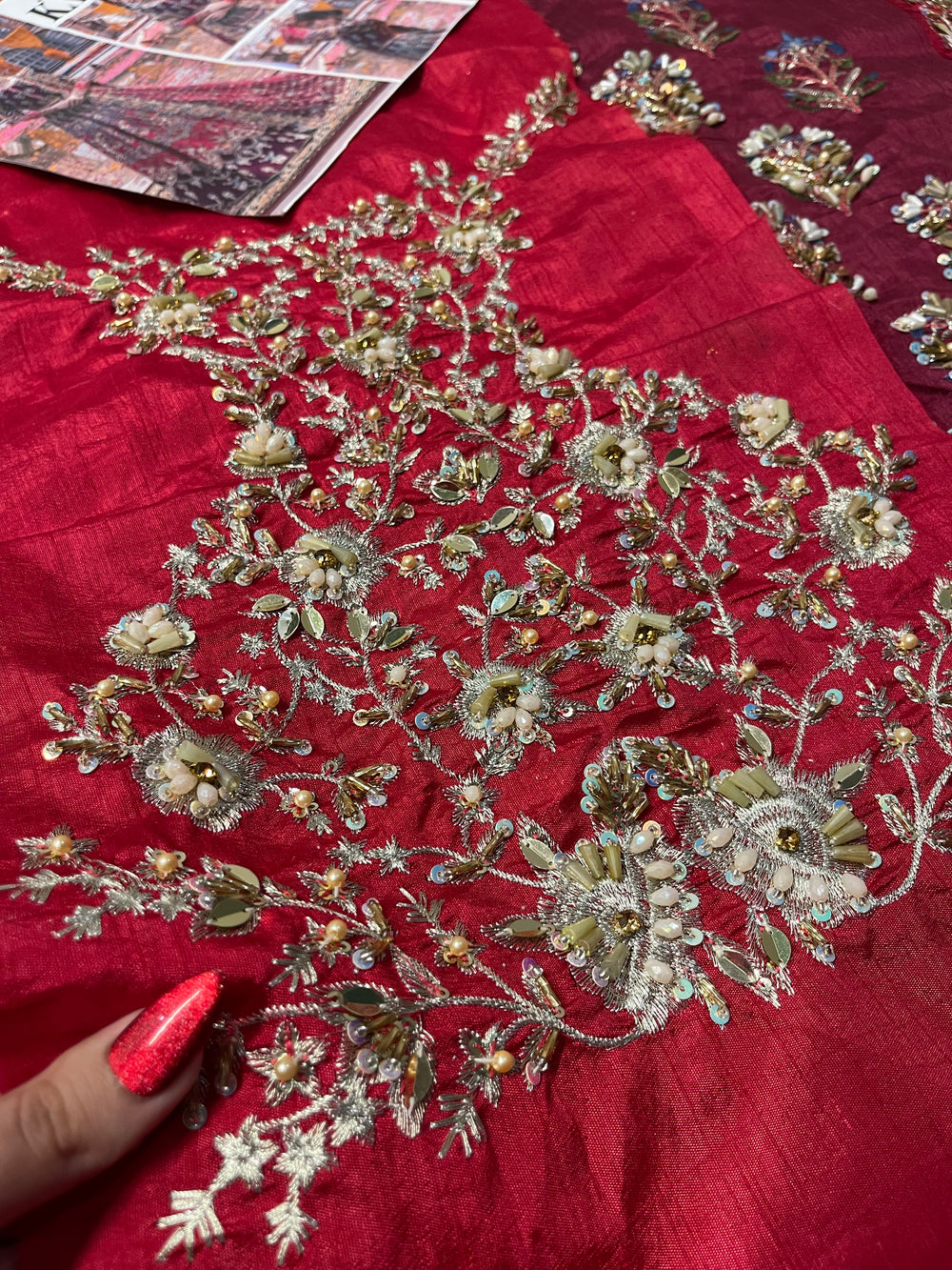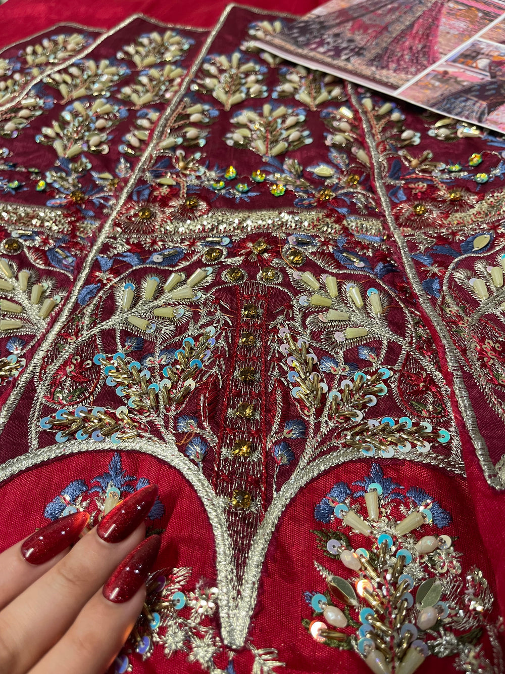 Inspired by the beautiful “Mahrosh” ensemble by Mina Kashif, this striking outfit showcases a rich magenta base accented with deep purple tones that create a stunning colour contrast. The fabric is adorned with intricate multi colored embroidery arranged in elegant traditional motifs, giving the ensemble a vibrant and festive character. Paired with a delicately embroidered dupatta and ornate borders, the design flows gracefully with detailed craftsmanship throughout. With its bold colours and festive detailing, this ensemble is a perfect choice for Mehndi, Dholki, and Mayoun celebrations, making it ideal for lively wedding festivities.