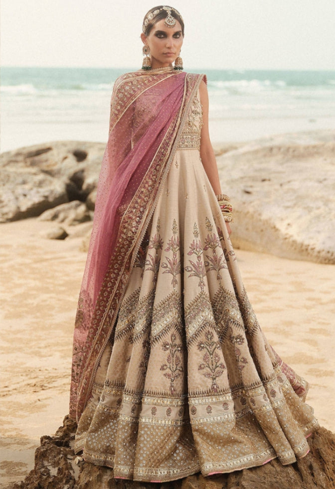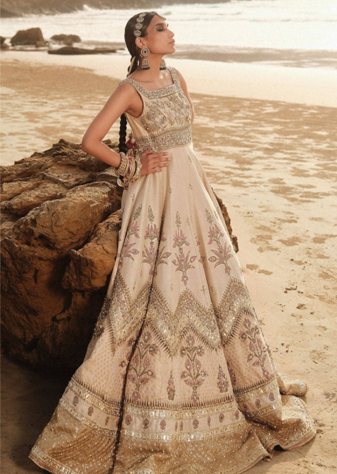 Embrace timeless elegance with Ensemble "Armala" - a white and gold bridal masterpiece that transcends tradition. This ivory Indian silk pishwas, crafted from luxurious jamawar fabric, exudes opulence. Its intricate appliqué and block print motifs, elevated by delicate embroidery, tell a story of heritage and grace. Paired with an ada work organza dupatta, adorned with enchanting block printed and sitara work, this ensemble is a harmonious blend of tradition and contemporary allure.
