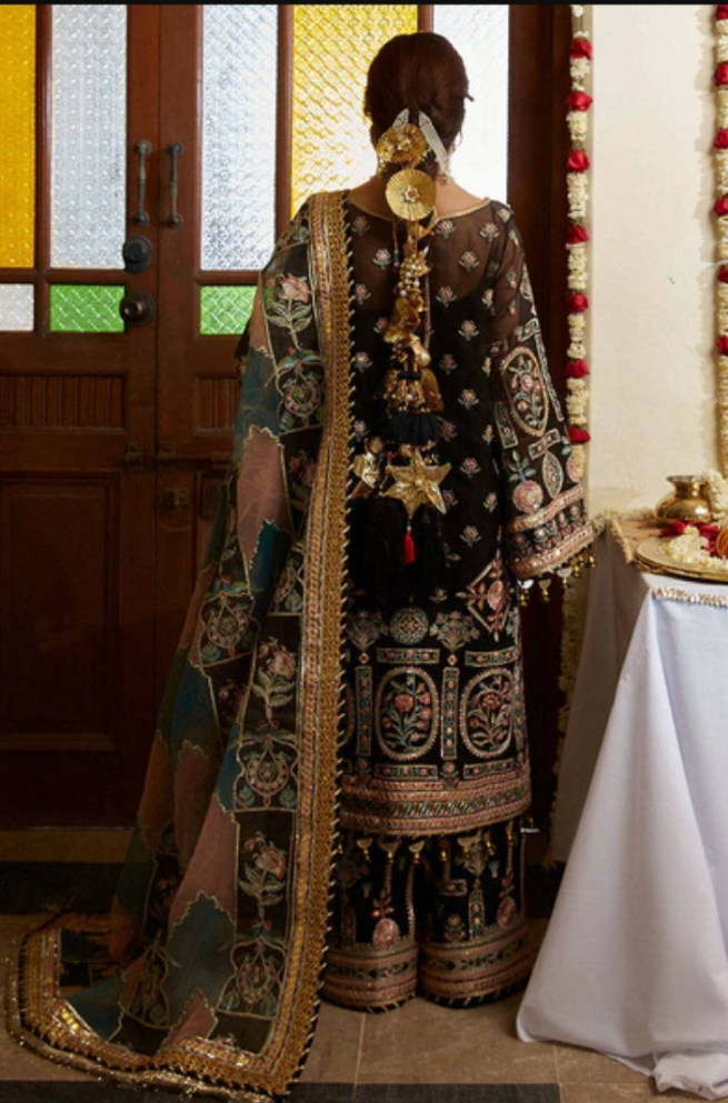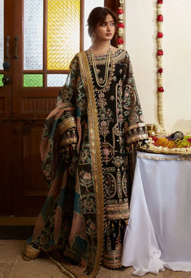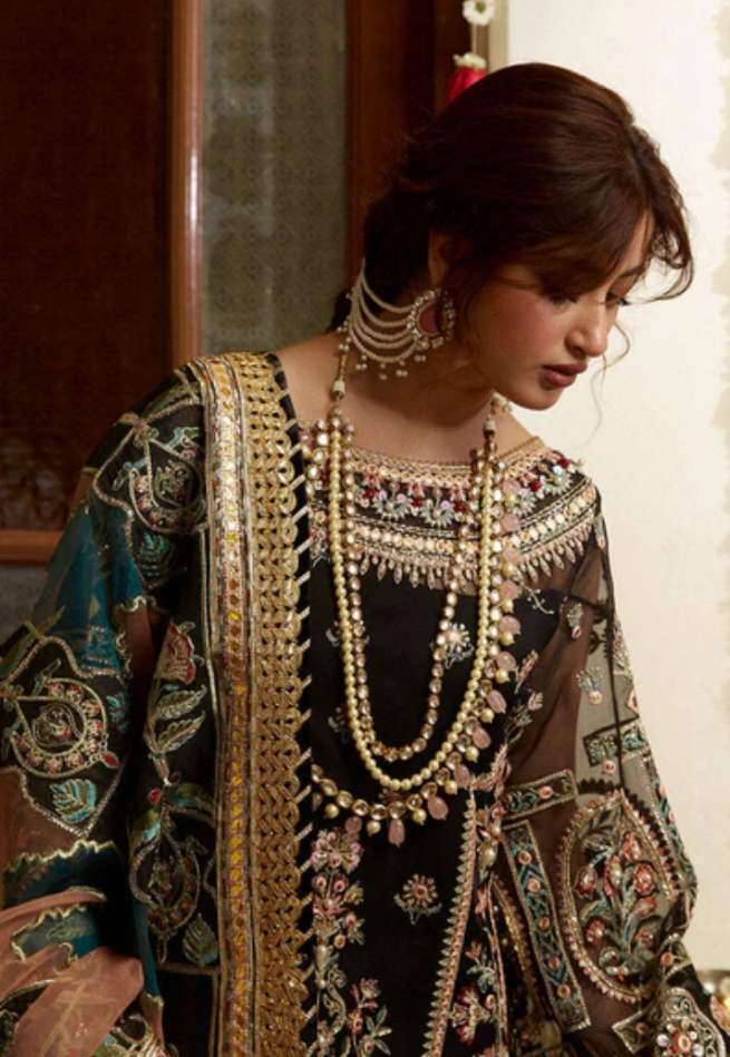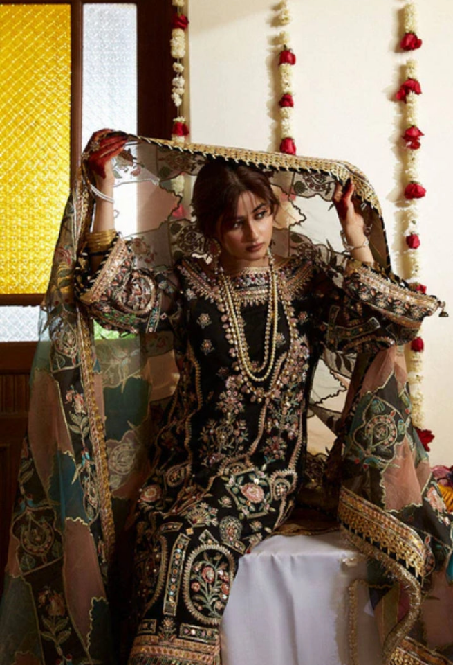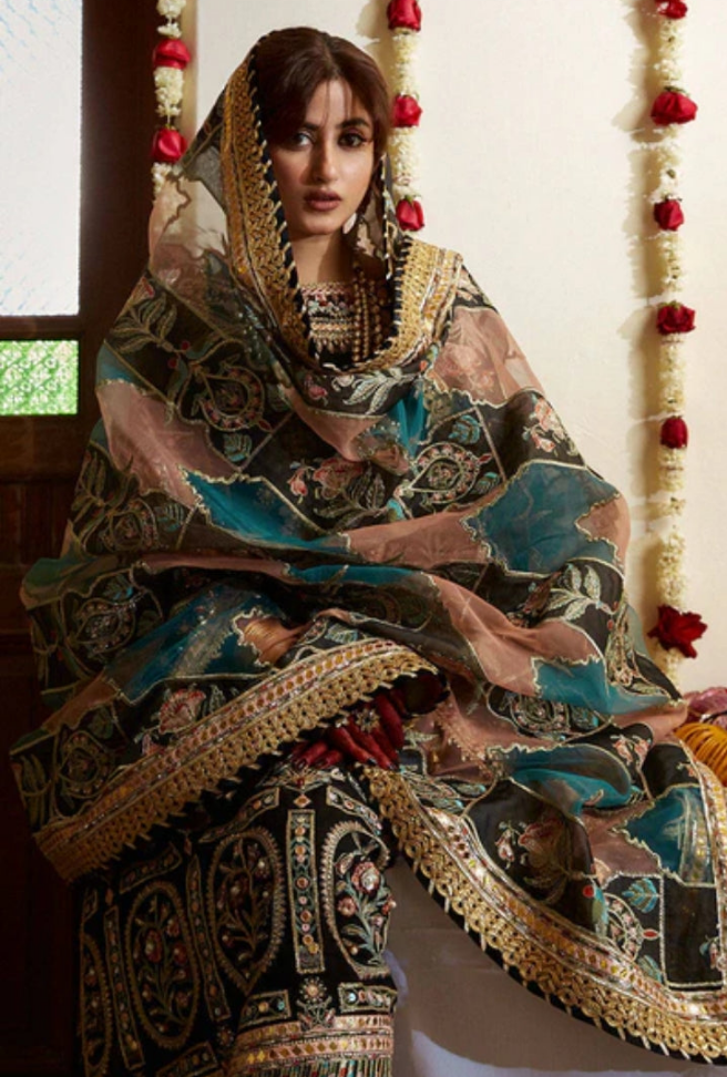 Sajal wears Basgul, a stunning soot colored ensemble featuring cascading floral vines and motifs composed between carefully placed arches. The kameez is generously hand embellished with accents of gota, dabka, hand cut sequins and pearls. Paired with an embroidered Dhaka pajama finished off with embroidered chatta patti borders. The laser cut dupatta is a work of art with carefully placed motifs and chatta patti in complimenting tones of baby pinks and blues.