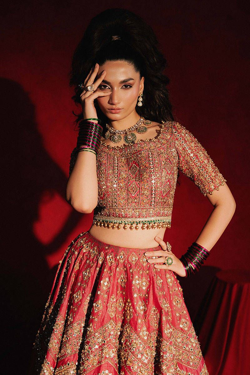 A garden in full bloom, Gul Badan iscrafted from rose pink Indian silk and soaked in old-school romance. The choli is short, with demure half sleeves dusted with judiciously placed mirror work and glints of metallic thread embroidery. The lehenga begins at the waist with chevron patterning and evolves into diamond-shaped panels, each box housing a Mughal floral motif rendered in a mix of silken thread embroidery, block print, and tiny mirrors that glint like dew. Beneath this garden of geometry, vertical scrolls rise like creeping vines embroidered delicately in lines that mimic antique architectural flourishes. The hem is finished with multiple embroidered borders that layer like sari pallus from a bygone era. A contrasting organza dupatta in lush green explodes with large, bold floral Mughal motifs in gota and adda work, framed in broad gold borders with embroidered trims running along all four edges