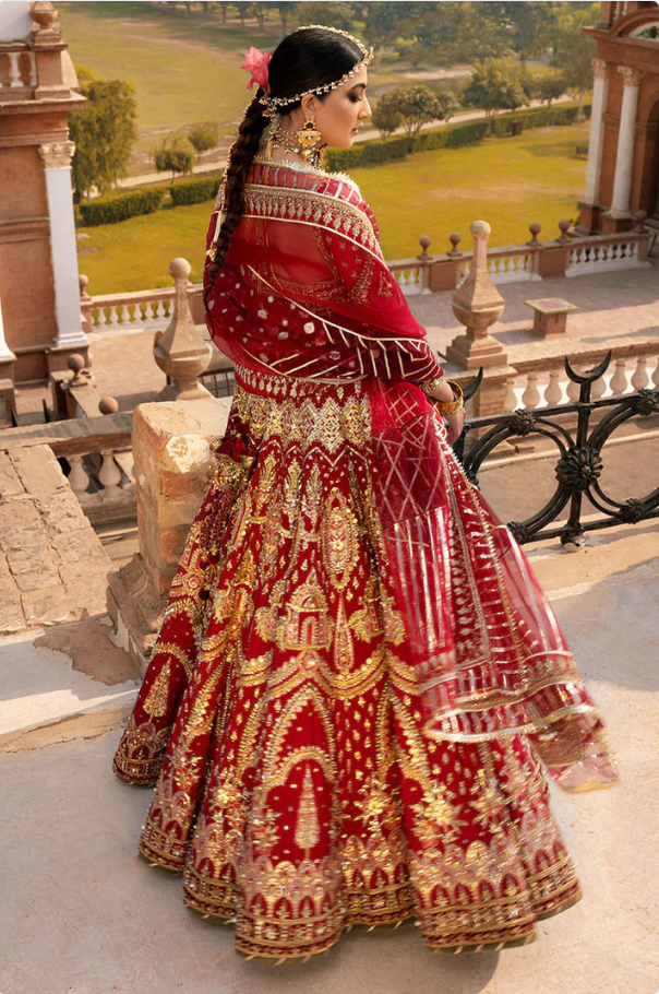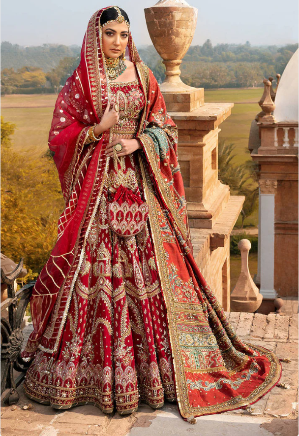 Nigarbano is our signature sindoori bridal set that comprises of a Russian silk lehnga choli extensively embroidered and composed using hand crafted embellishments of dabka,kora,sitari,pearl and marori. It comes with an embroidered and embellished dupatta finished with our signature chatta patti pallus and worn with a digitally printed silk shawl with hand embellished hammer work, dabka, pearl and gotta